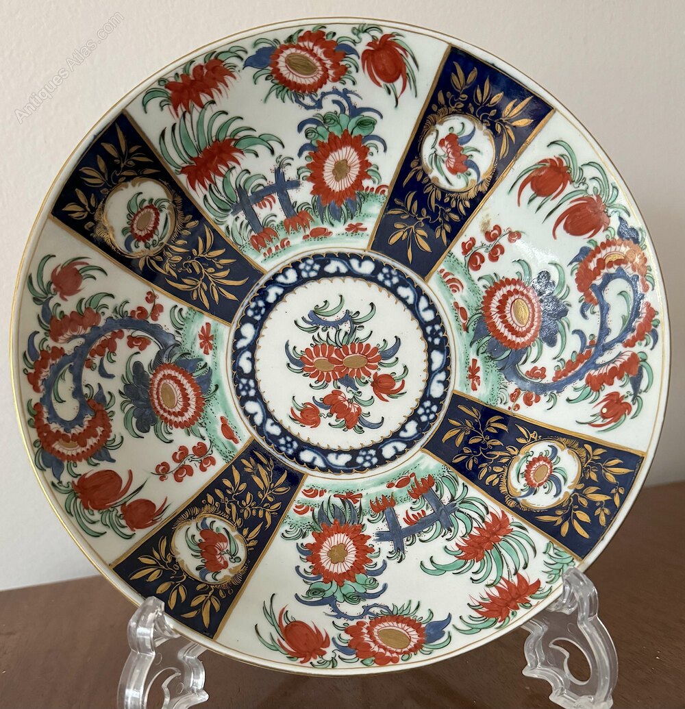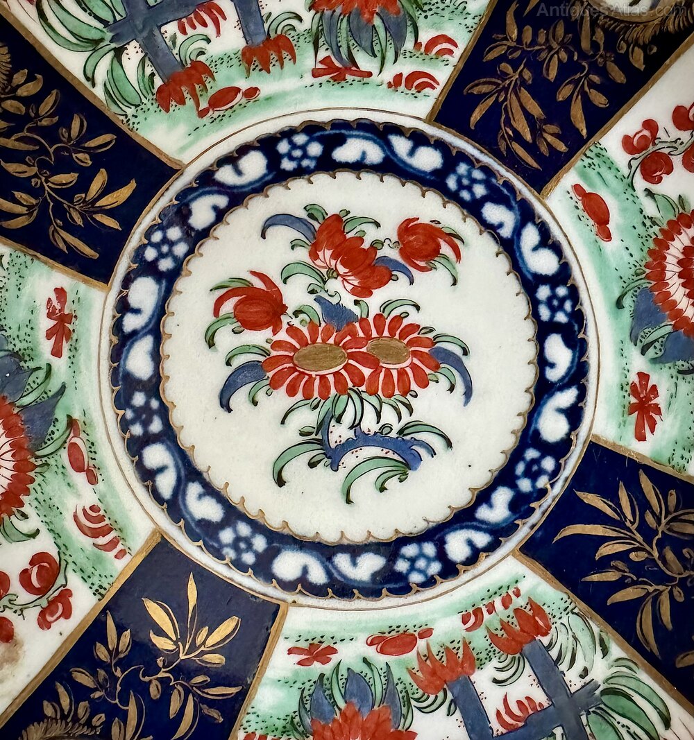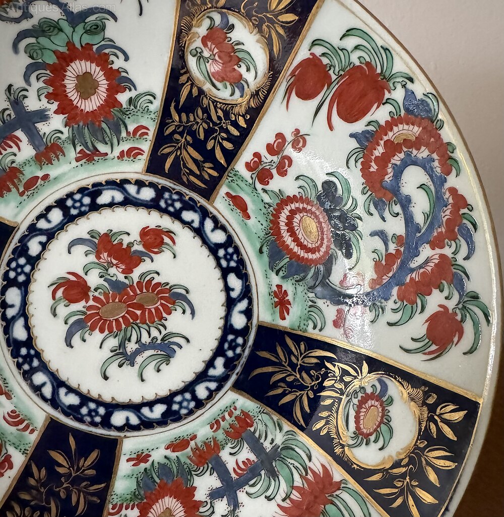 We have for sale a very attractive and rather hard to find 1st period Worcester Rich Queens pattern saucer dish c1770-1775.This lovely round saucer dish is decorated in the Rich Queens pattern consisting of an Imari insipred pattern with vertical gilded panels alternately painted with chrysanthemums against a white ground and foliate gilded cobalt blue panels each containing a reserve decorated with chrysanthemums with leaves against a white ground all around a central panel again painted with leafy chrysanthemums against a white ground. The base of the dish carries the 1st period Worcester pseudo square blue fret mark.