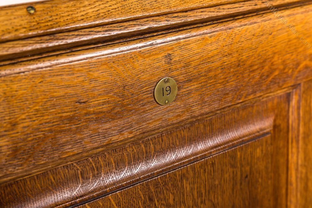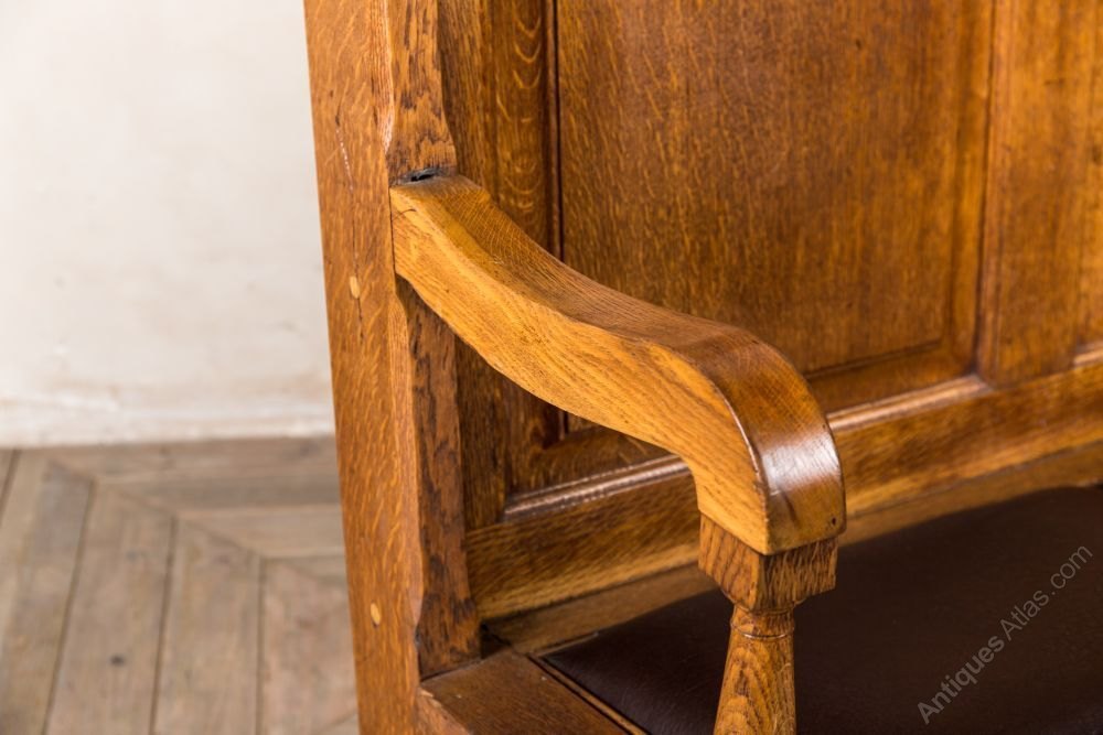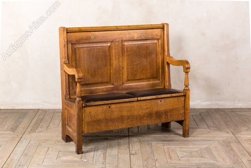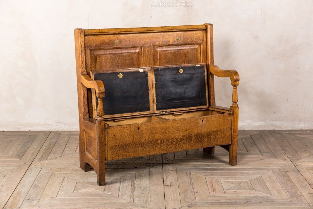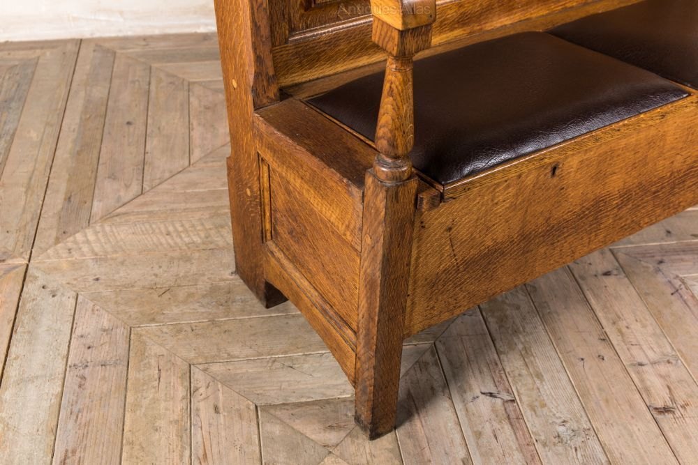 Add this antique settle to a large porch or hallway in a period property. The storage space underneath the seats provides an ideal place to store bags and shoes.This solid oak pew was reclaimed from a London gentleman’s club. The seats are vinyl and padded for extra comfort. There are number plaques on the back that will vary. There are no keys to the locks, but the underneath storage can still be accessed.