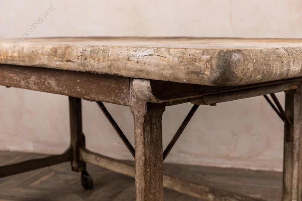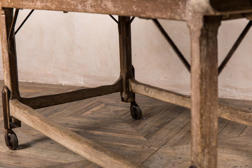 Cast iron wheels and supports make the table portable, creating a fantastic serving table or display table.