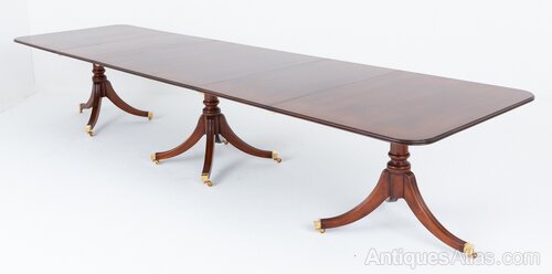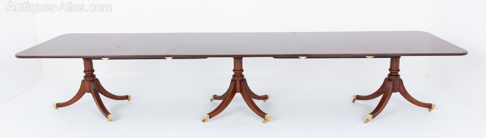 Regency Revival Mahogany 18 - 20 Seat Dining Table.This Dining Table Having 3 Typical Regency Bases Which Boasts Elegant Fluted Swept Legs Terminating With Brass Box Castors and Ring Turned Columns.