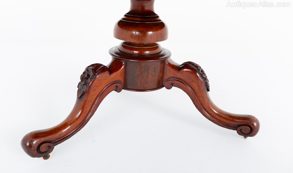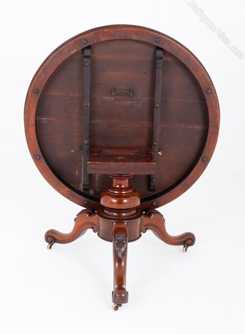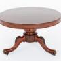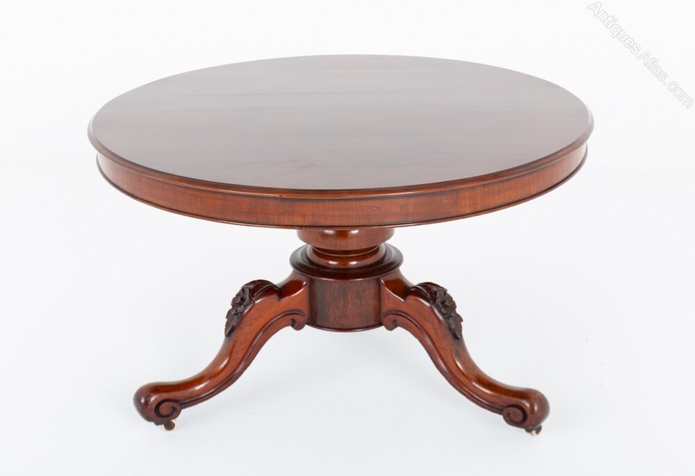 Victorian Mahogany Circular Dining Table.This Table is Raised Upon a Triform Base With Carved and Shaped Legs with Brass Castors and a Turned Column.