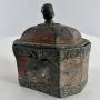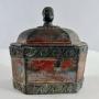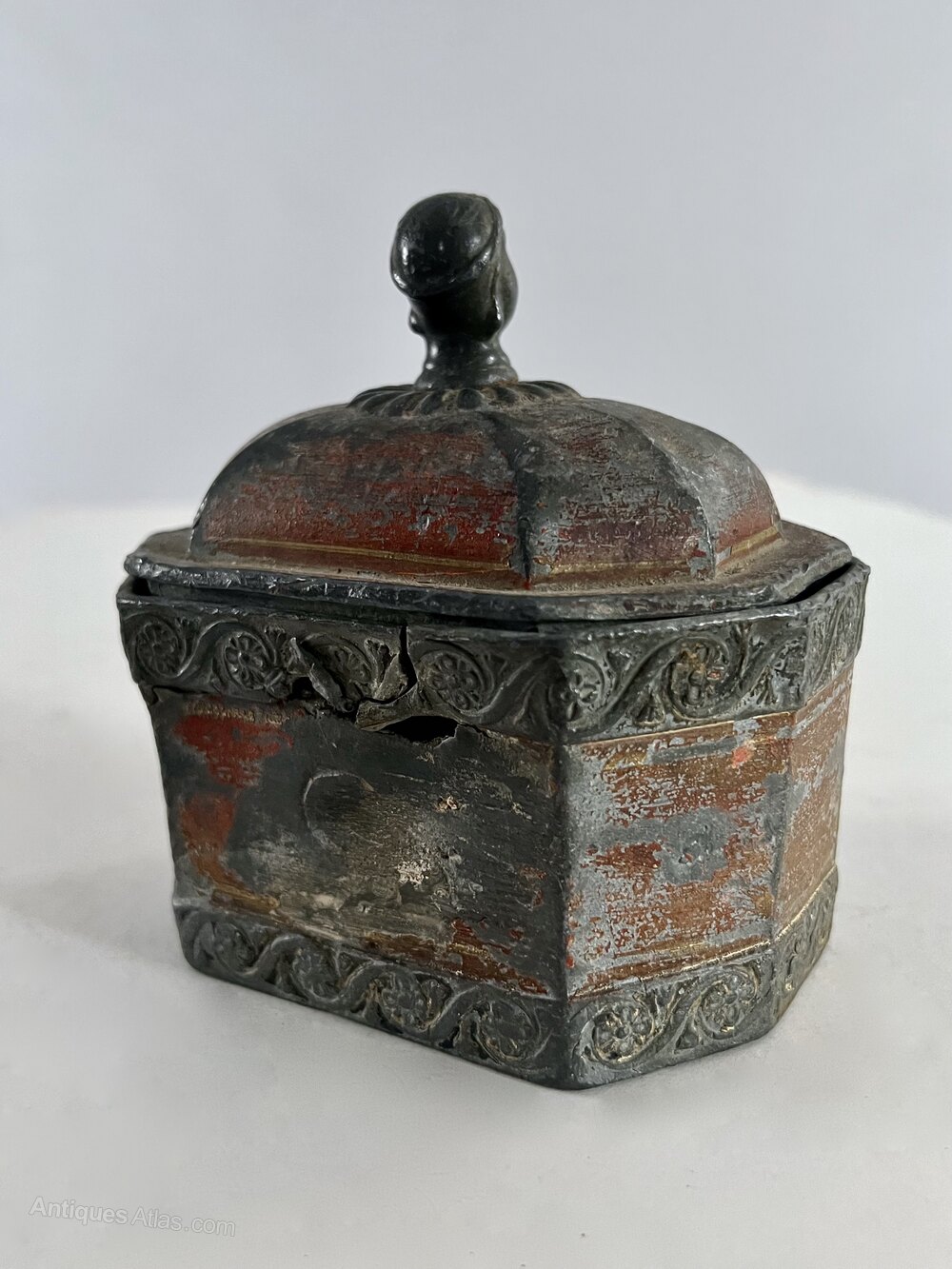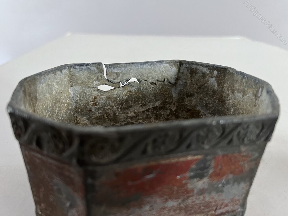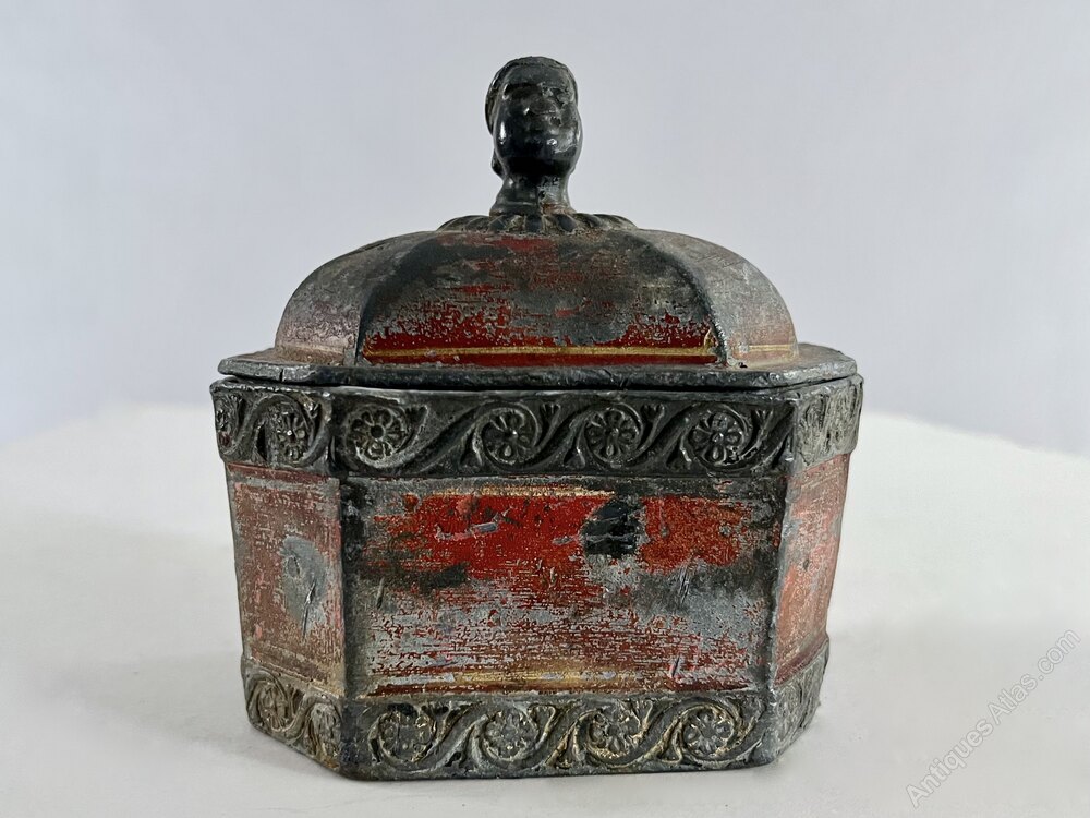 18th century lead Tobacco Pot. It is octagonal shaped, withfloral decorative borders. The lid is has a knob in the form of a womans head. The back has some damage to the lead (see photograph) Retaining some of its original red and gold line painted surface, it carries a real sense of the social life of 18th century life. Circa 1780Width: 13cm
