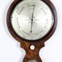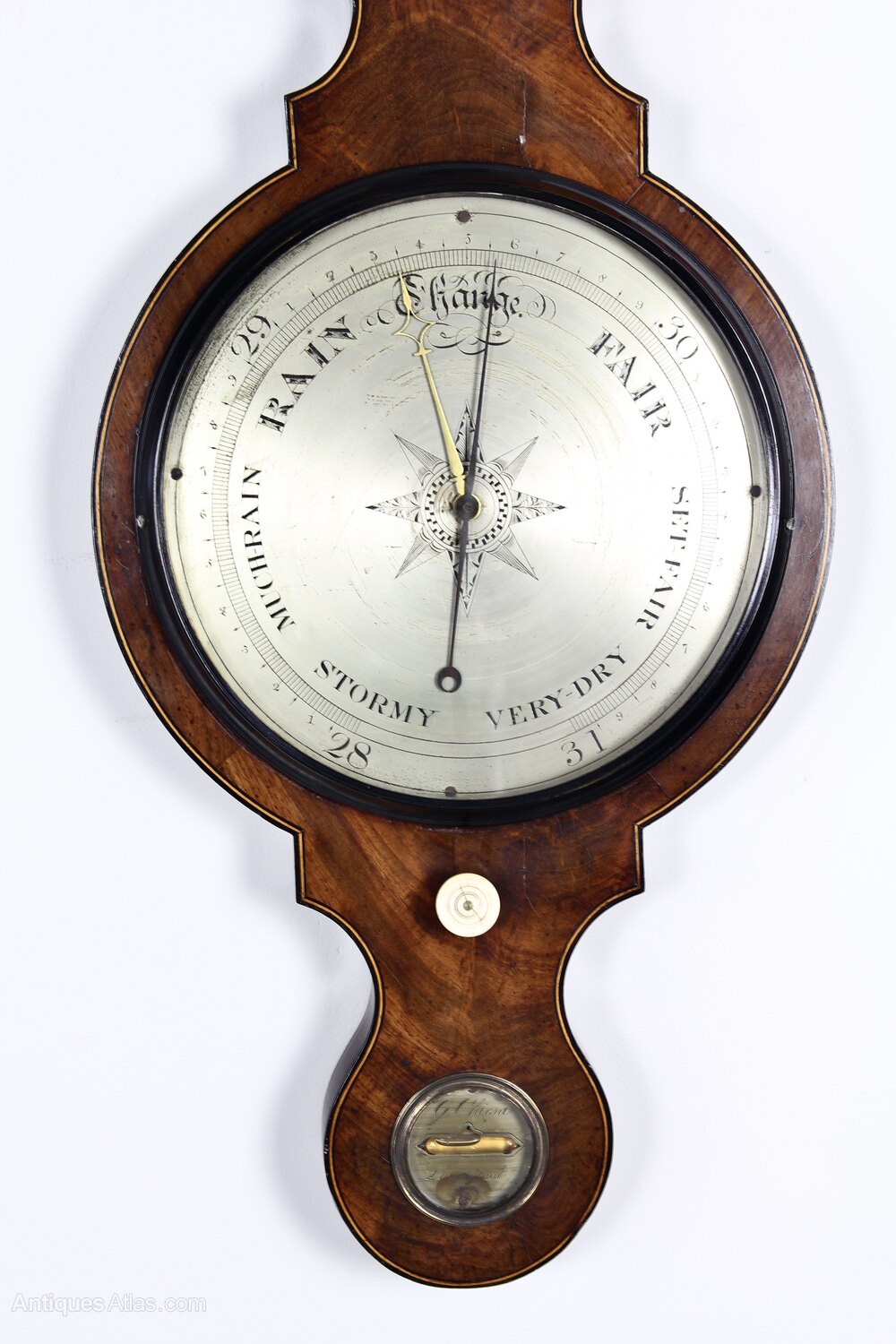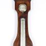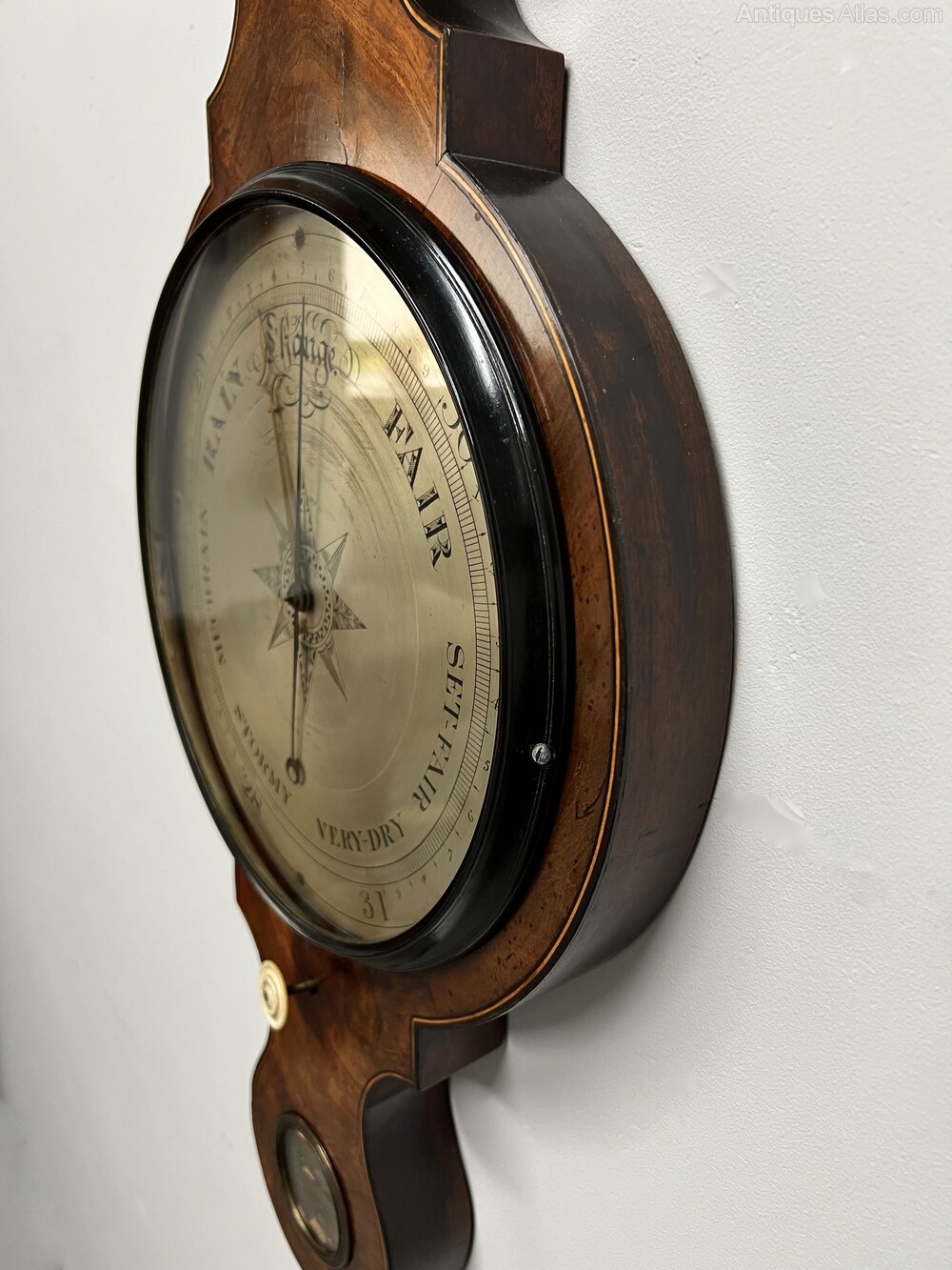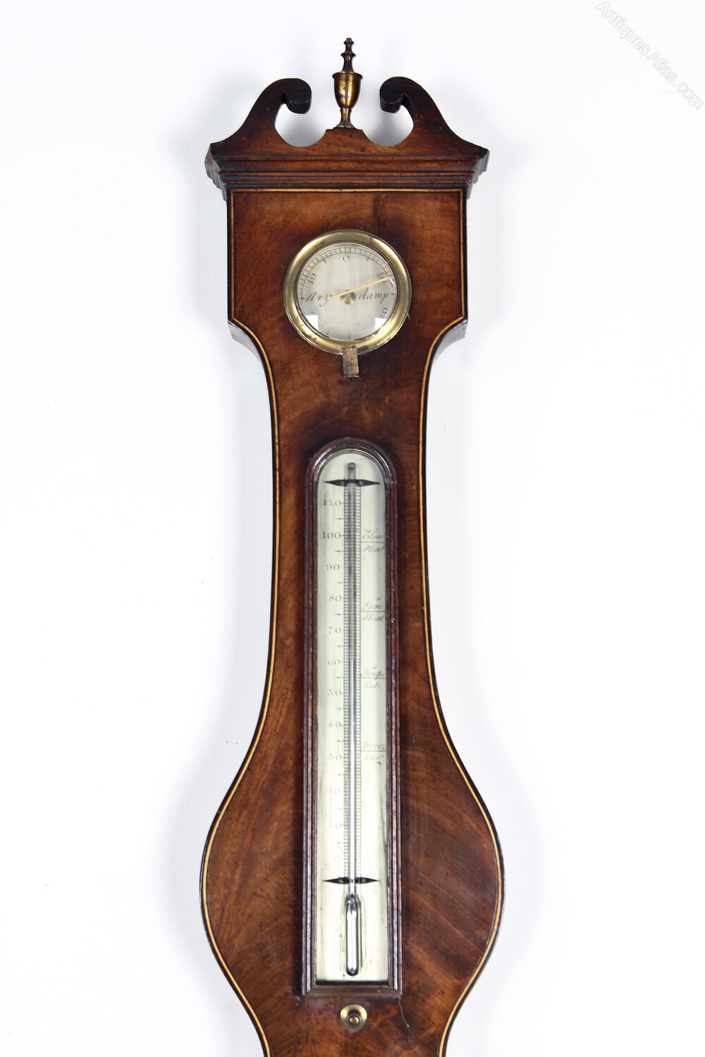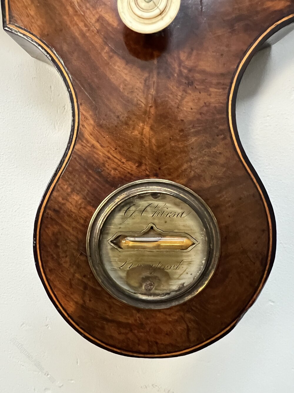 Early 19th century mahogany banjo barometer by the maker G. Chiesa of Liverpool. Fine veneers are edged with boxwood and ebony line stringing, and a classic swan neck pediment drops down into the beautiful curves of the barometer. It has a hygrometer, thermometer, engraved silvered dial and a glass level. The dial is fronted with a flat glass and ebonised metal bezel. It is in good working order. Circa 1830Height: 109cm