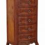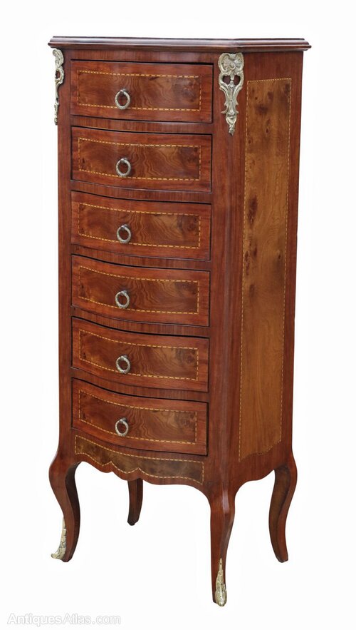 Vintage Mid-20th Century Burr Walnut Serpentine Wellington Chest of Six Drawers – European CabinetA beautiful and rare decorative find, this mid-20th century burr walnut serpentine-front Wellington chest is full of charm, character, and warmth. Featuring finely inlaid walnut and mahogany veneers with elegant ormolu brass mounts, it would make a wonderful statement piece in the right setting.