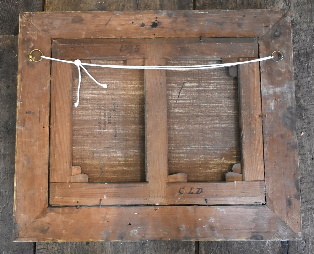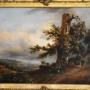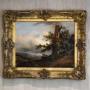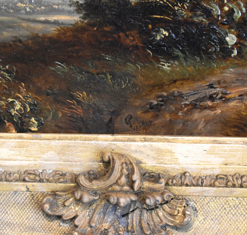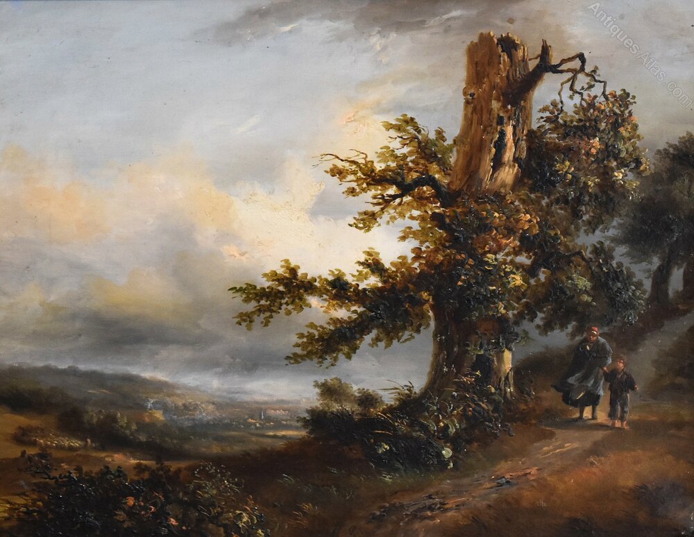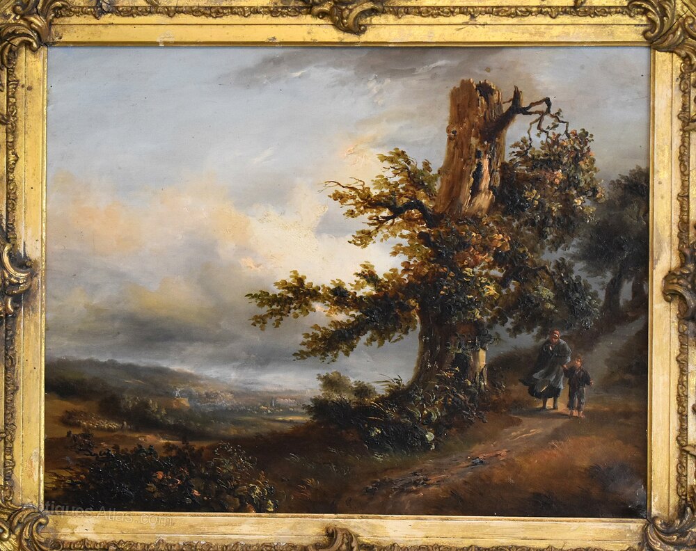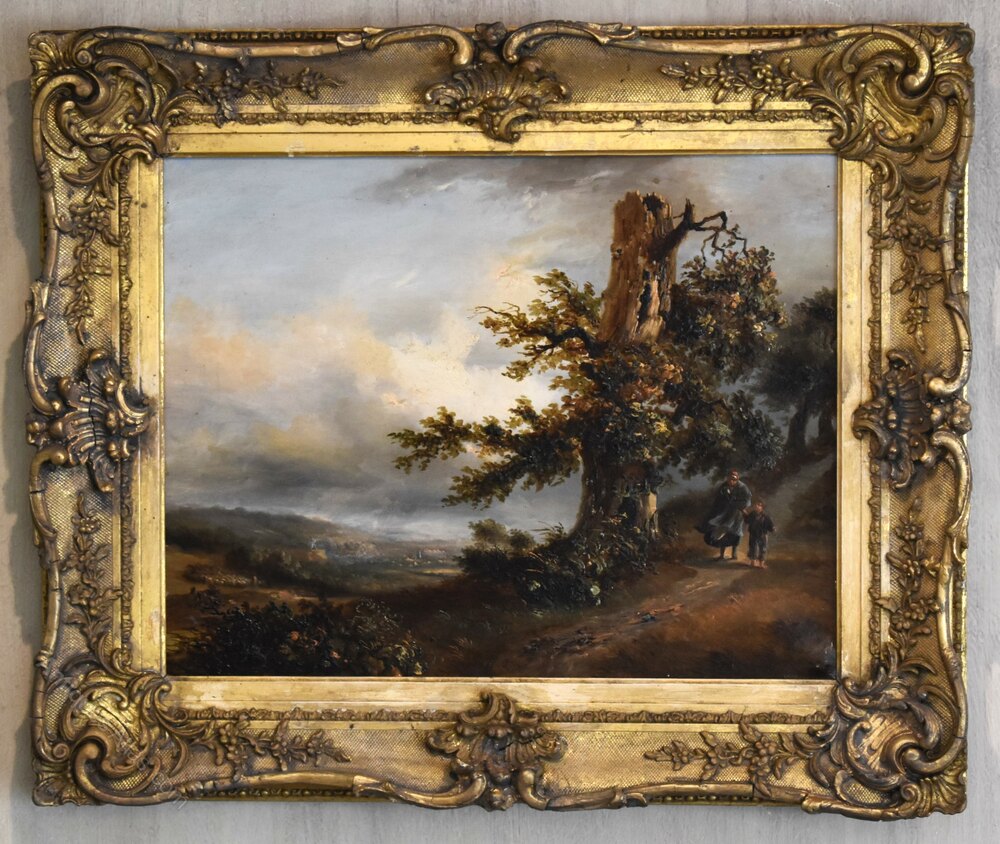 A superb oil on canvas by the French artist Alphonse Robert 1807-1885. The scene depicted is a vast open landscape with a town in the distance and a shepherd with his flock. The foreground is dominated by a blasted oak tree to the side of which a lady is walking with a child, wrapped up against the cold. The work wonderfully depicts a wild and windy scene with the figures being buffeted and storm clouds rolling. There is a title in French on the reverse of the work however it is somewhat illegible but indicates a location in the north of the country. The reverse is also stencilled with numbers probably relating to an exhibition and the canvas is by the premier Parisian manufacturers Vallé et Bourniche. The painting is in excellent original condition and is signed Robert to the lower middle with the date of 1834. Alphonse Robert was a painter on both canvas and porcelain, he was born in Sèvres in 1807, and was the son of Jean François Robert director of the Manufacture de Sèvres. Alphonse Robert was attached to the Sèvres factory from 1833 to 1837 as a landscape painter. Alongside his career with Sèvres, Alphonse Robert also worked on easel painting and exhibited at the Paris, Valenciennes, and Boulogne Salons between 1827 and 1880 as a pupil of Léon Cogniet. He received a second-class medal for landscape in 1831. Two of his paintings are exhibited in the apartments of the Palais de Saint-Cloud. Alphonse Robert died in Sèvres in 1885. This painting is a fine early example of the artist’s work. The gilt frame is the original and of a suitably fine quality it has had areas of restoration. The whole has a great period look, the painting is of superb quality, the detail is stunning and is a fine example of French landscape painting.Overall sizes in inches including frame: 21 ½ by 18