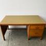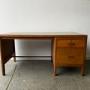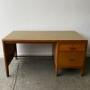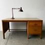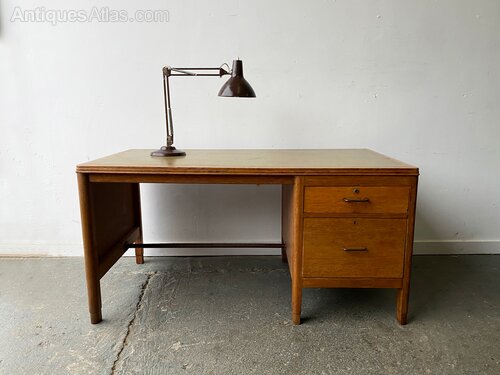 A British ex Ministry of Defence desk produced in the 1950’s. It has the attractive simplicity and functionality of military furniture. Made from solid and veneer oak with brass handles. This item has seen a lot of use which is reflected in an attractive lightly distressed patina throughout.Width 152cm x depth 84cm x height 76cm