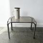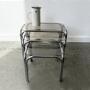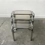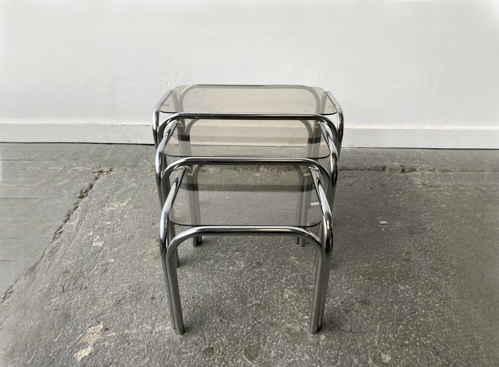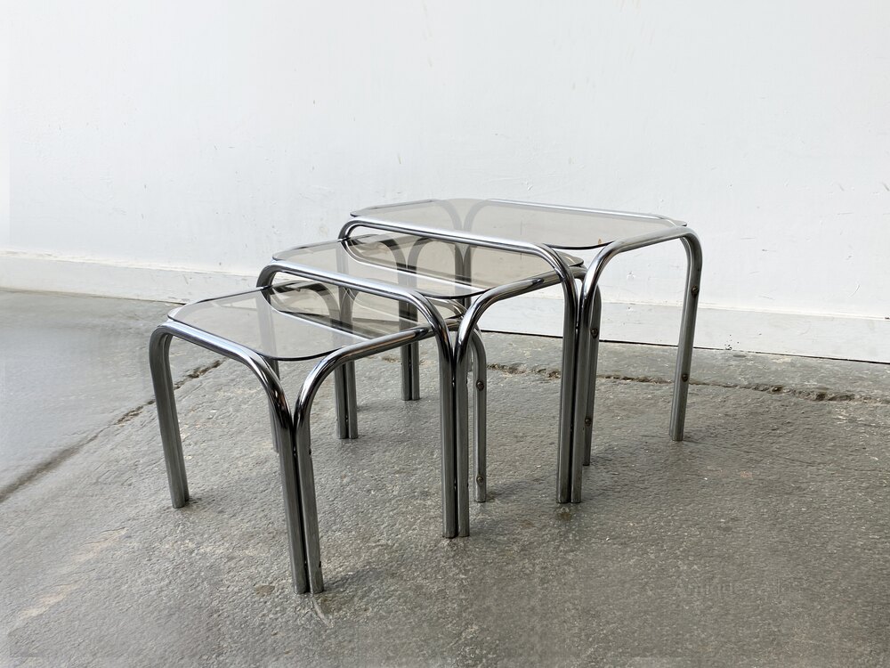 Set of three small Mid-Century nesting tables. The reflective high gloss tubular chrome contrasts well against the light grey sheen of the smoked glass.Size (largest table)