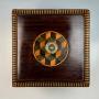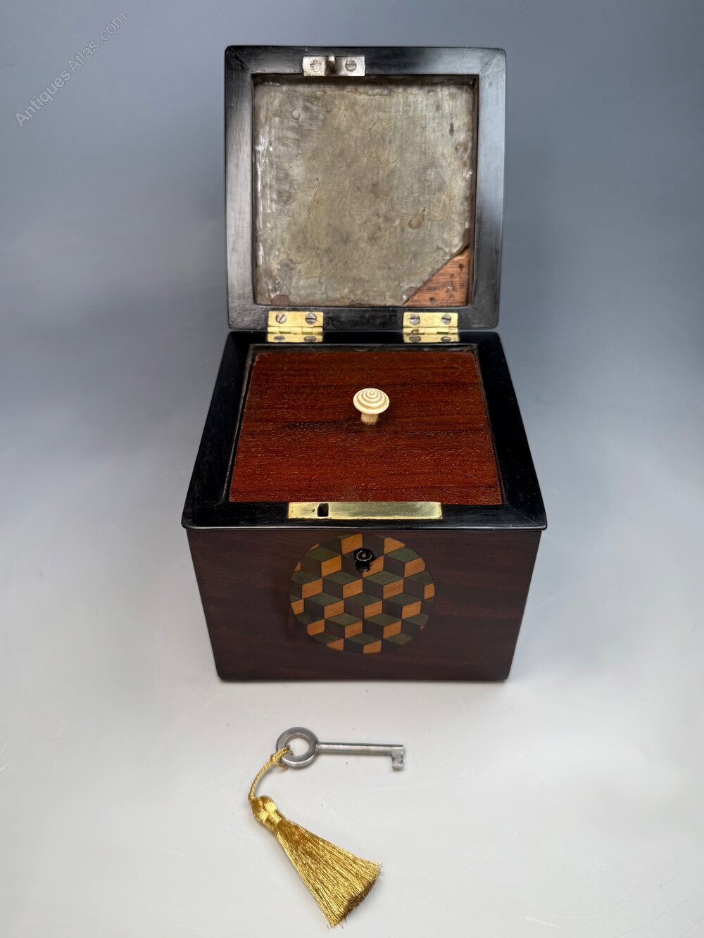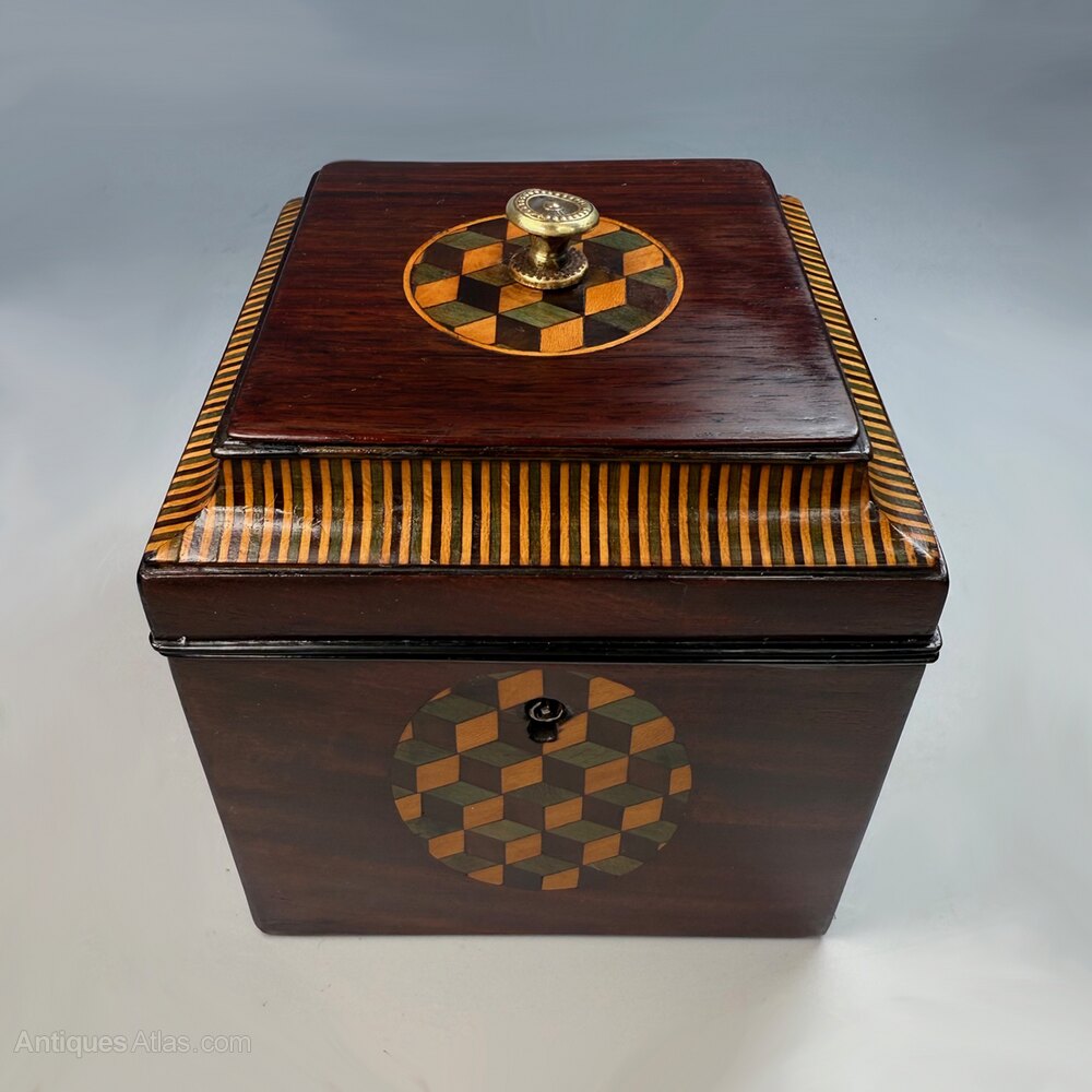 A beautifully designed rosewood and ebony tea caddy, with intricate geometric cube inlay, and a finely moulded lid with satinwood and lignum stiped design and brass finial. A striking piece for any collection of 18th–19th century or Georgian tea caddies. Has working lock and key. The overall condition of the box is excellent. The only issue is the brass finial is slightly tipped to the left.Dimensions: