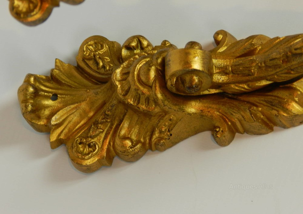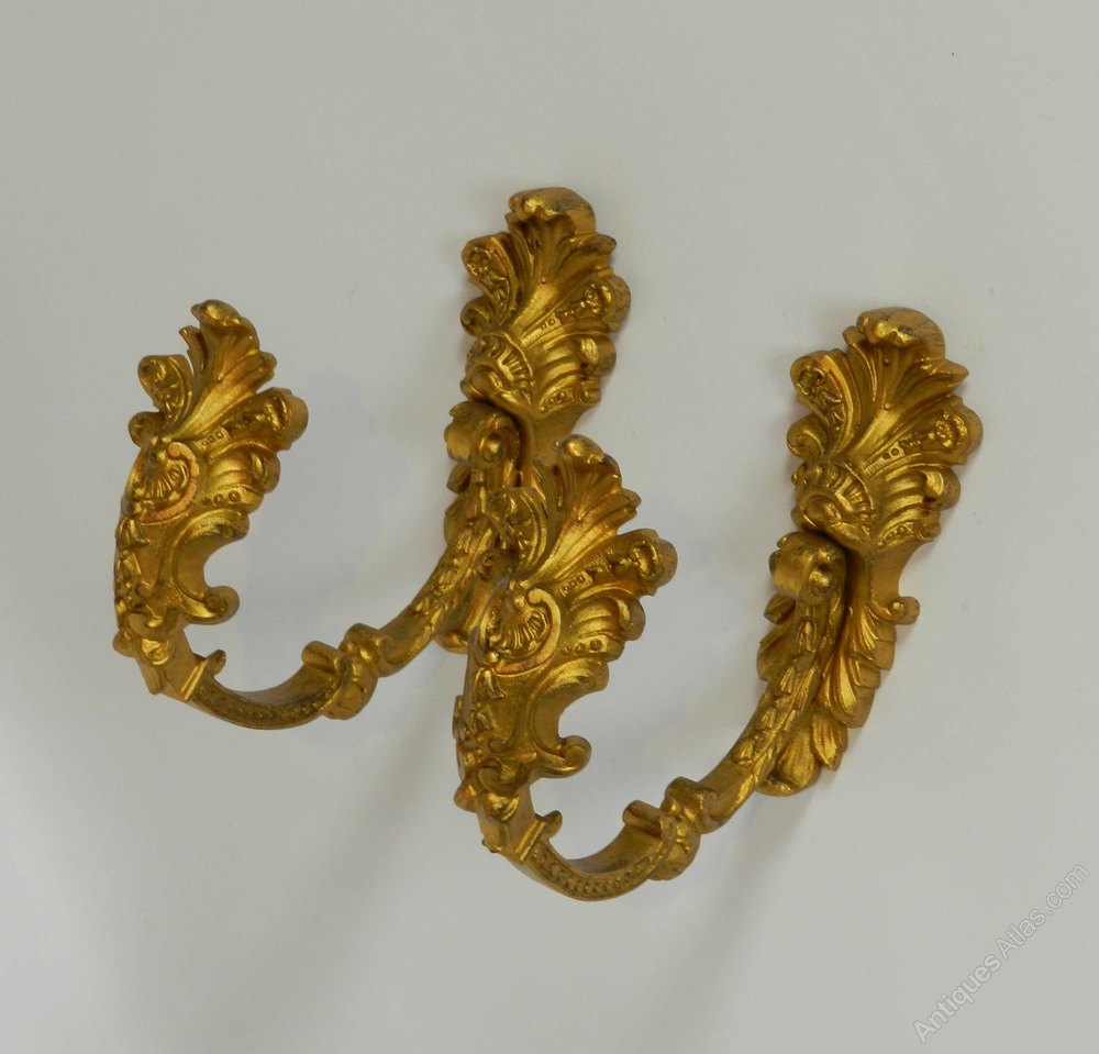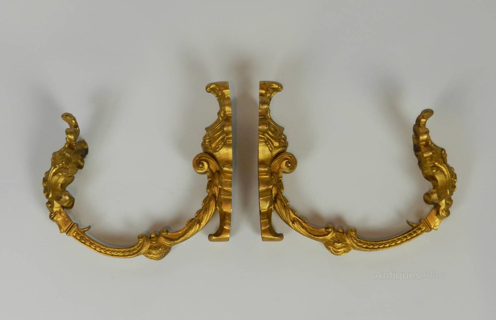 This is a large pair of gilt bronze curtain tie-backs decorated with c scrolls, shells and foliage with a slightly worn gilt patina.They both have a support band across the back for fixing.