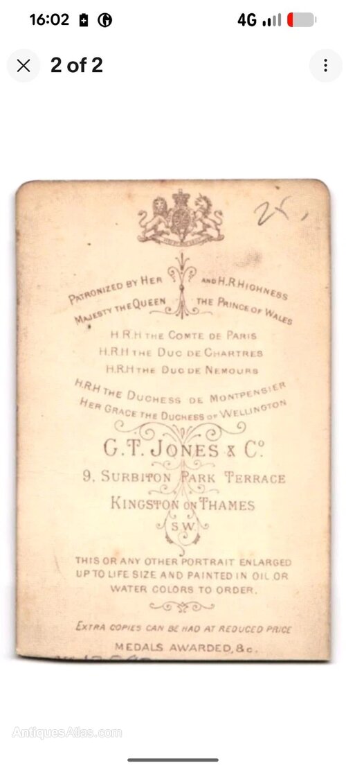They include images on porcelain and also images highlighted in paint etc. The photographs carry the signature for the renowned G T Jones Photographers, Kingsway, Surbiton, who had the patronage of HRH The Queen as well as other royals (see last photo). The sheer quality of all of the frames really does reflect this connection.