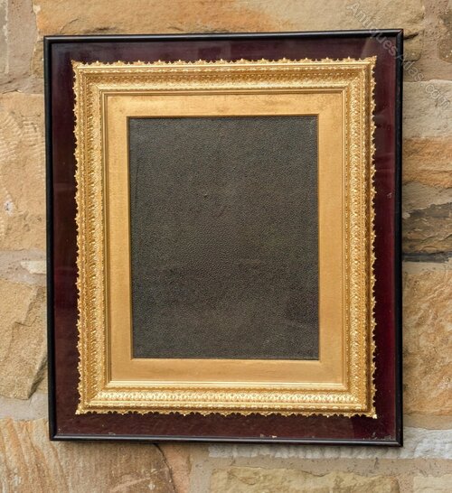 This is a rare 19th century box frame of extremely fine quality in the most excellent condition dating from the Victorian era circa 1880. These box frames were expensive fine quality pieces so are fairly scare. The ebonised outer case is velvet lined with a curved cushion interior that holds the gilded gesso frame. The ornate detail of the gilded gesso is extremely fine and crisp having been protected behind glass for over 150 years.This is one of 12 that we currently have listed from a good collection of Victorian frames all in perfect condition.