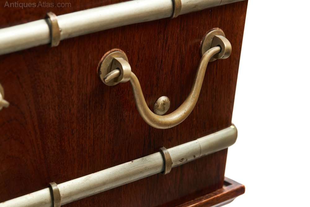 Large Antique Mahogany Wine Cooler, fine quality metal bound wine cooler with original brass carrying handles and tin liner. The square tapering cooler sits on original stand with shaped legs.H 62cm