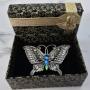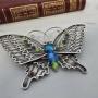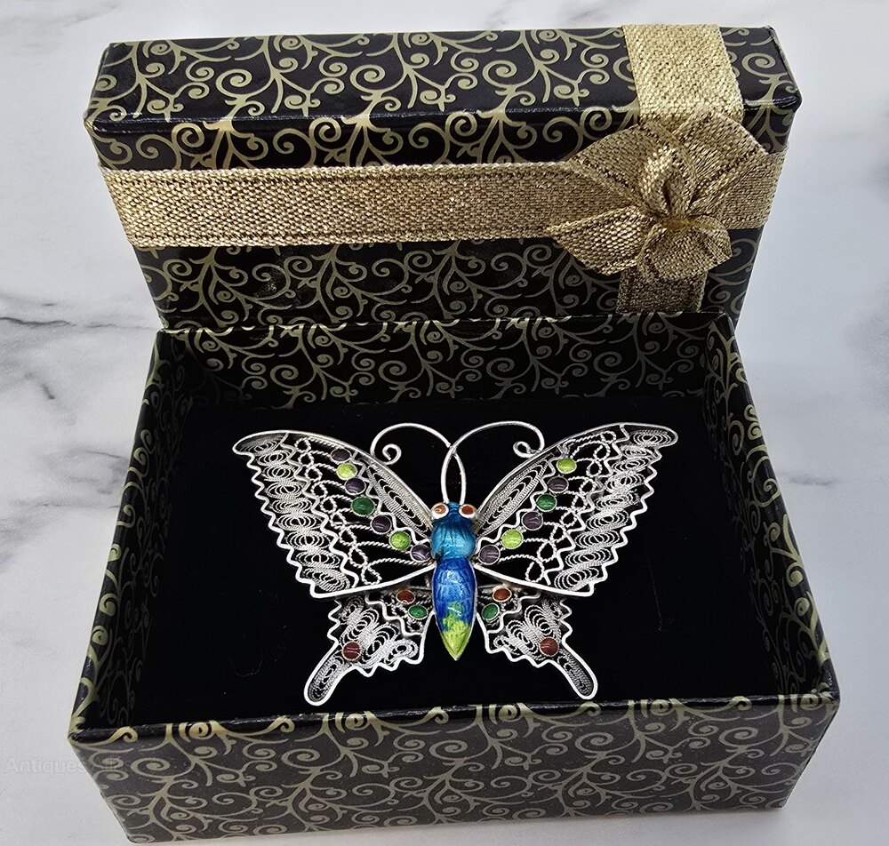 This very fine example of Chinese silver filigree artwork has been beautifully hand made with intricate detail in the form of a large four winged butterfly with curly antennae.The butterfly has a two toned blue enamelled body with a green rear end and eyes that are picked out in red enamel.