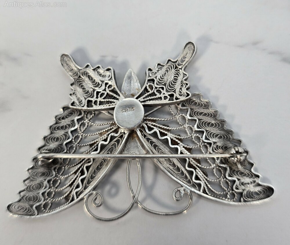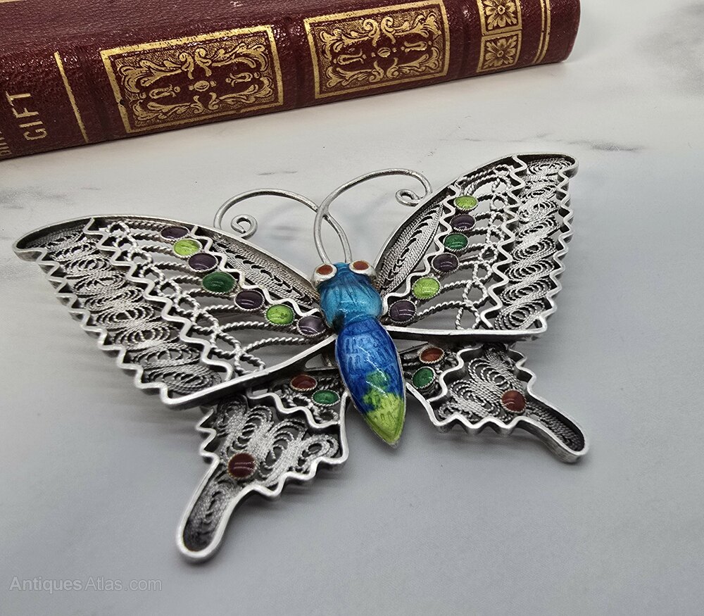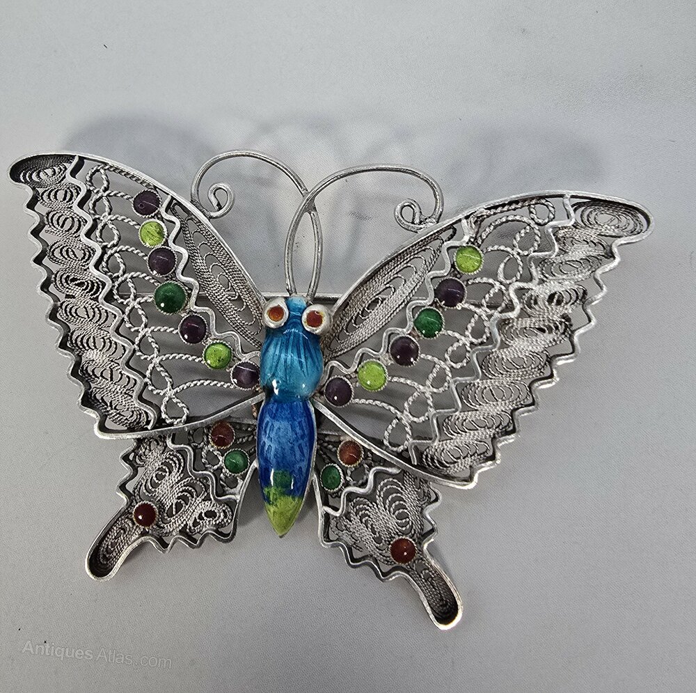 A Silver Filligree And Enamel Butterfly Brooch