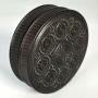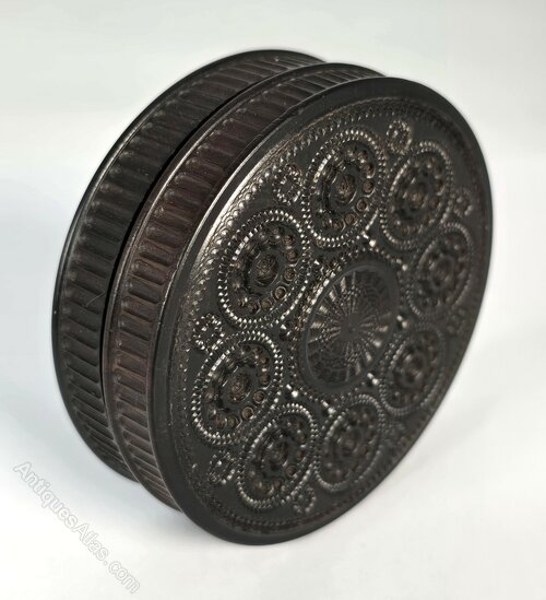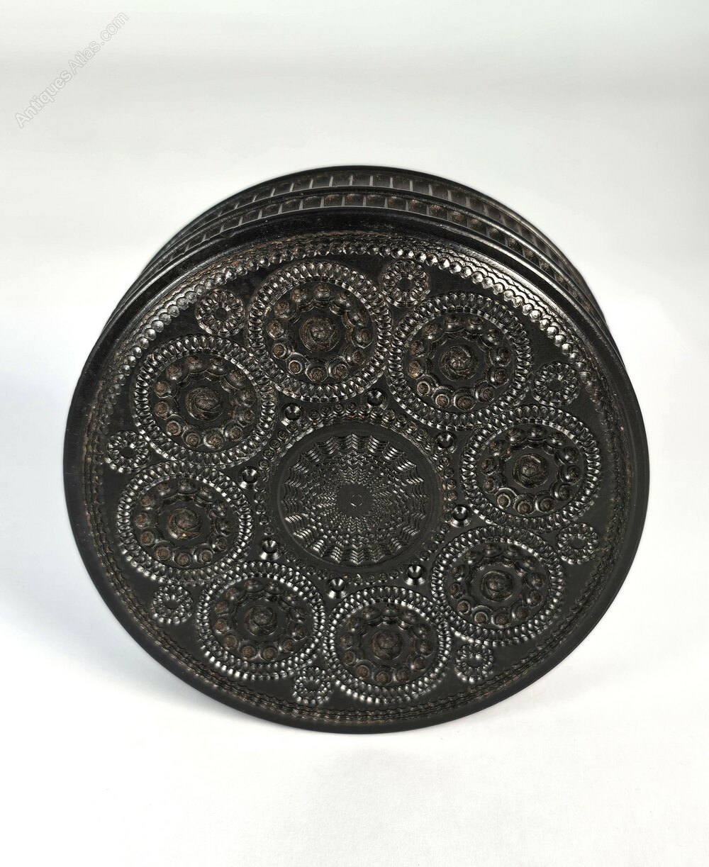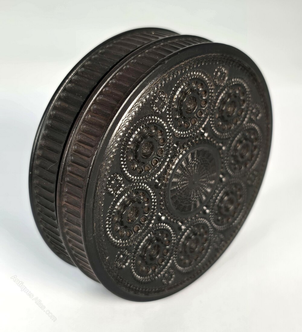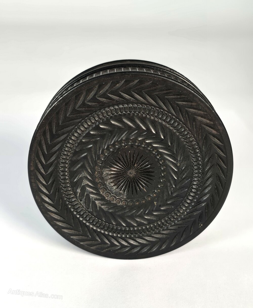 This masterfully engineered and very complicated English ebony engine turned table snuff box dates to the mid 19th century.It has been hand machined from solid ebony with multiple repeated intricate circular designs to the top, which radiate around a central patera.