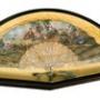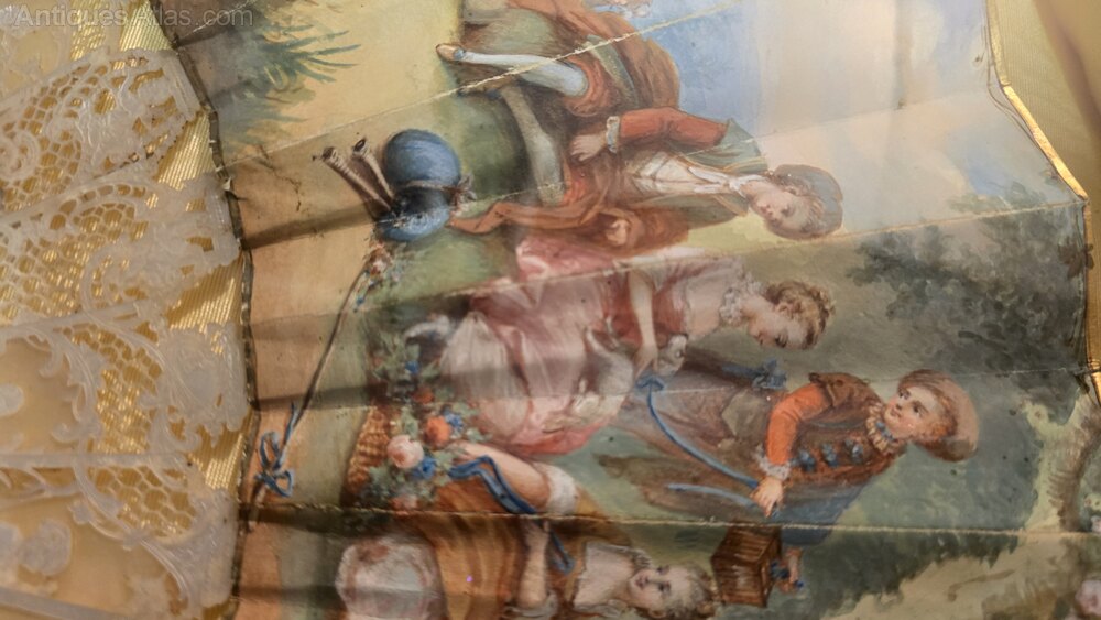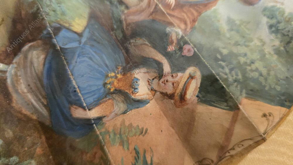 The main attraction of this fan is the work of art on paper which when folded out for use displays a wonderful hand painted brightly coloured continuous scene amongst a wooded landscape with open areas with different groups of people including a young courting couple, a mother and child with a pet bird, a central family group with their pet dog and behind in the distant landscape there are two larger groups one dancing and celebrating and the other enjoying a al fresco meal.