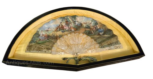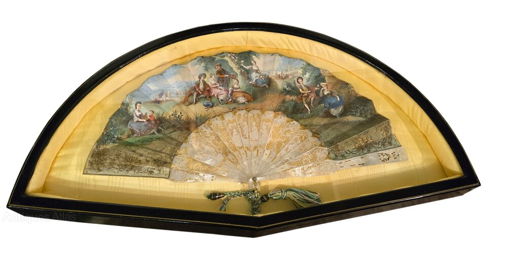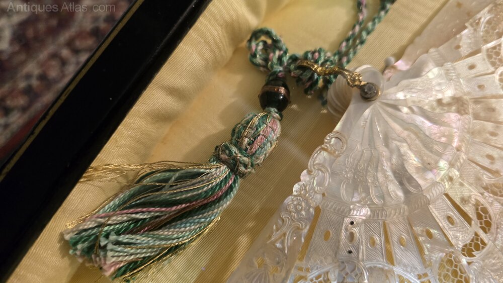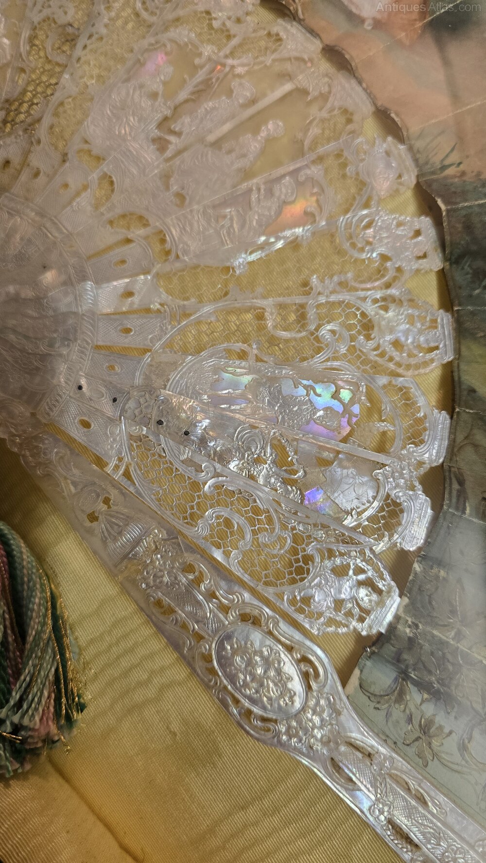 This exceptional quality late 18th century fan is Italian in its origin, and the folding framework is made from mother of pearl, which has been delicately carved and pierced to an intricate design showing young male and female figures set amongst garden trellis with cherubs or Puti looking down from above, all hand carved into the solid mother of pearl.The individual sections of mother of pearl are hinged to fold out from a brass patterned and shaped ring, which is adorned with silk tassels mounted with Italian green glass beads with gold inclusions.