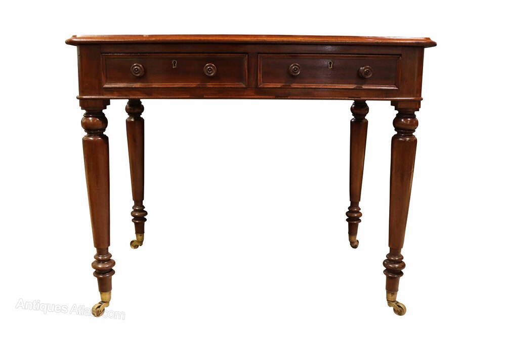A charming mid-19th century mahogany writing table of smaller, highly usable proportions, dating to circa 1850. The rectangular top retains its original tooled leather inset, beautifully worn and characterful, framed by a crossbanded mahogany border with rounded corners.The frieze houses two drawers with turned knob handles and original brass escutcheons. The table stands on elegant tapering turned legs terminating in brass cup castors, giving the piece both movement and refinement.