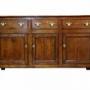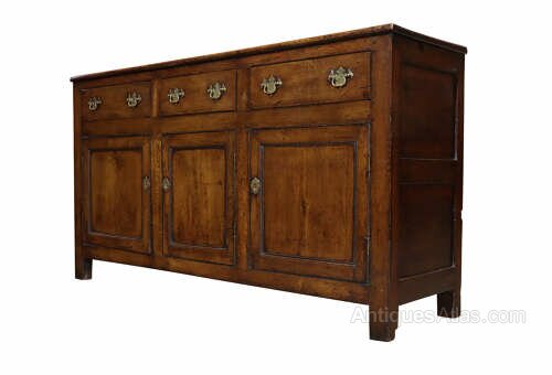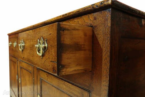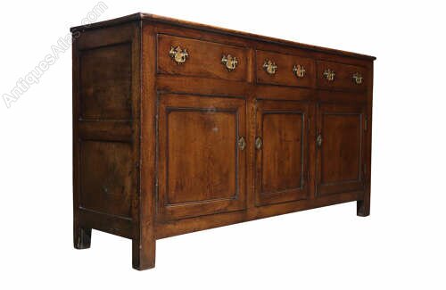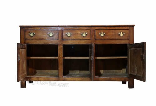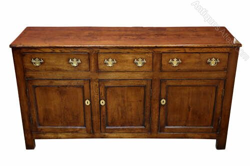 A superb 18th century oak dresser base of excellent colour and patination, fitted with three drawers above three panelled cupboard doors. The drawers retain later period-style brass handles, replaced in the late 18th century. With its well-proportioned form, original panelled sides, and wonderfully warm, rich surface, this is an exceptional example of rural Georgian cabinetry.circa 1780