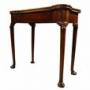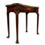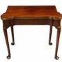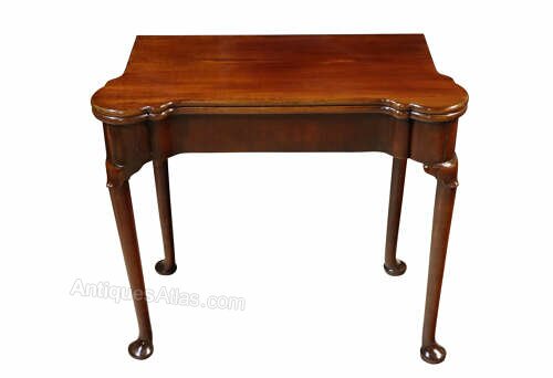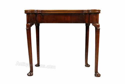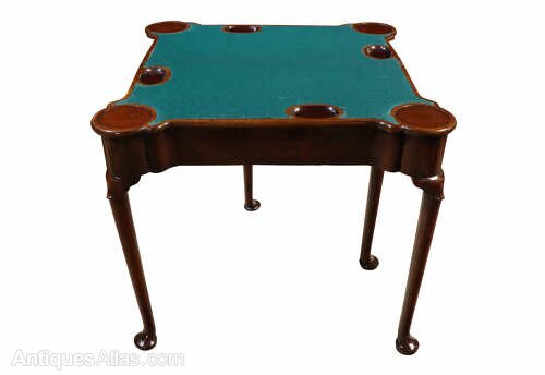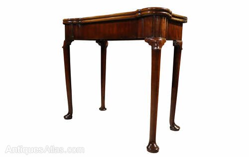 This elegant late 18th-century George II mahogany card table, dating to around 1780, is a fine example of English craftsmanship designed for refined social entertainment. Constructed from richly figured mahogany, the table displays a warm, deep patina that has developed beautifully over time.The shaped top opens to reveal a green baize playing surface fitted with a series of dished gaming wells, thoughtfully designed to hold counters, coins or gaming pieces during play. This practical yet sophisticated feature reflects the popularity of card games and polite gambling in Georgian drawing rooms. The elegant serpentine outline of the top adds visual interest and enhances the refined proportions of the piece.
