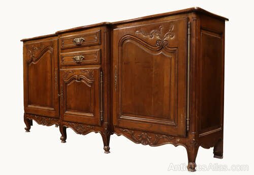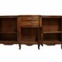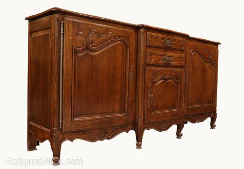 A beautiful French oak sideboard in the Louis XV style, featuring a finely inlaid parquetry top, shaped panelled doors and elegant carved acanthus decoration. The rich warm tone of the oak, together with its decorative shell and scroll carvings, gives this piece real presence.The central section includes two drawers over a cupboard, flanked by spacious side cupboards with internal adjustable shelving, providing excellent storage. The carved apron and cabriole legs with scroll feet are typical of French Provincial craftsmanship of the early 20th century.