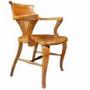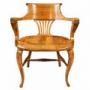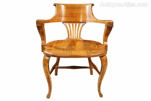 A charming late Victorian oak desk chair dating to around 1890, beautifully made and full of character. The chair features a shaped curved backrest with a gently swept silhouette, supported by an elegant fan-shaped splat. The curved arms have a sculptural quality, flowing naturally into the shaped seat rails.The solid oak seat is well-figured with attractive grain, and the whole piece stands on cabriole-influenced legs united by stretchers for strength and stability. The proportions are comfortable and practical, making it ideal for use at a writing table, desk, or as a decorative occasional chair.
