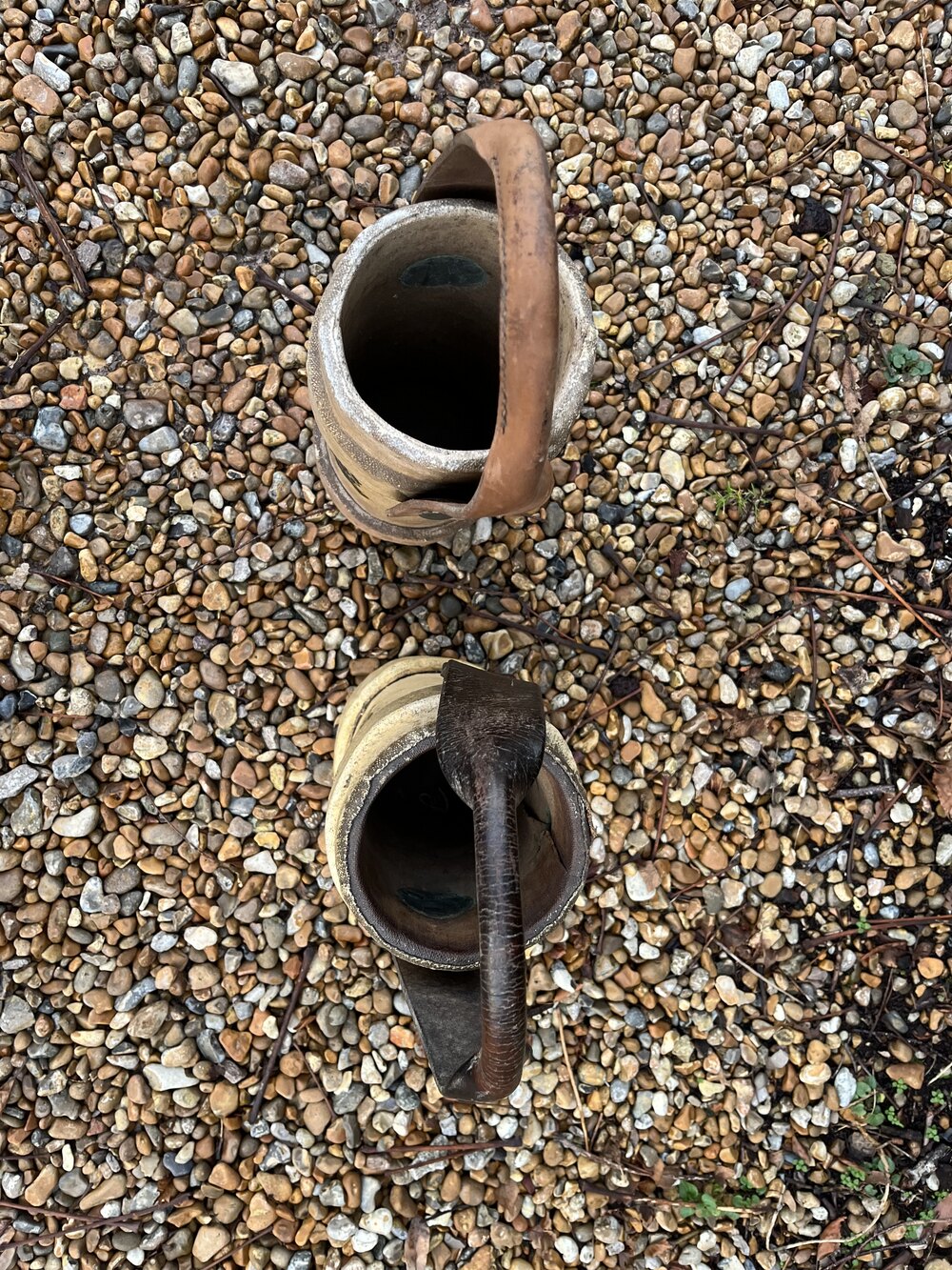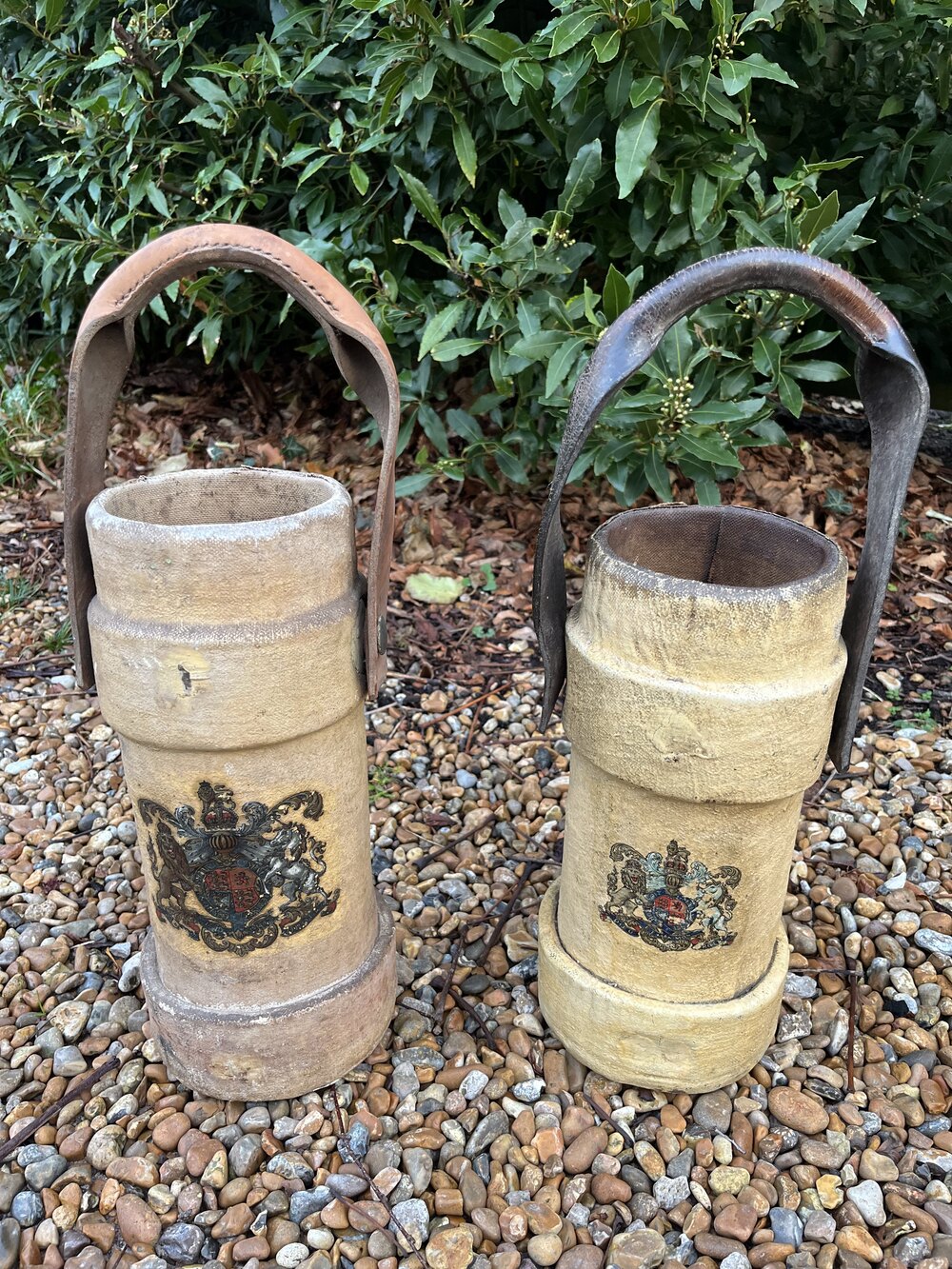 Two WW1 leather Royal Navy cordite carriers. One 36 cms tall, the other 33 cms tall. In great condition.DateEarly 20th Century :