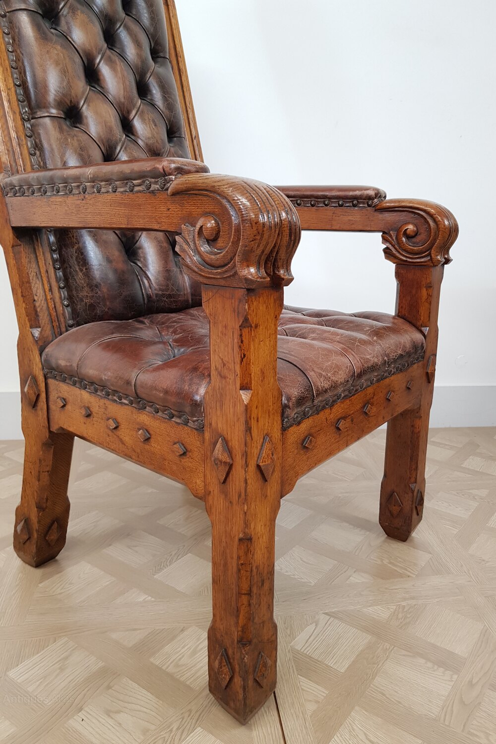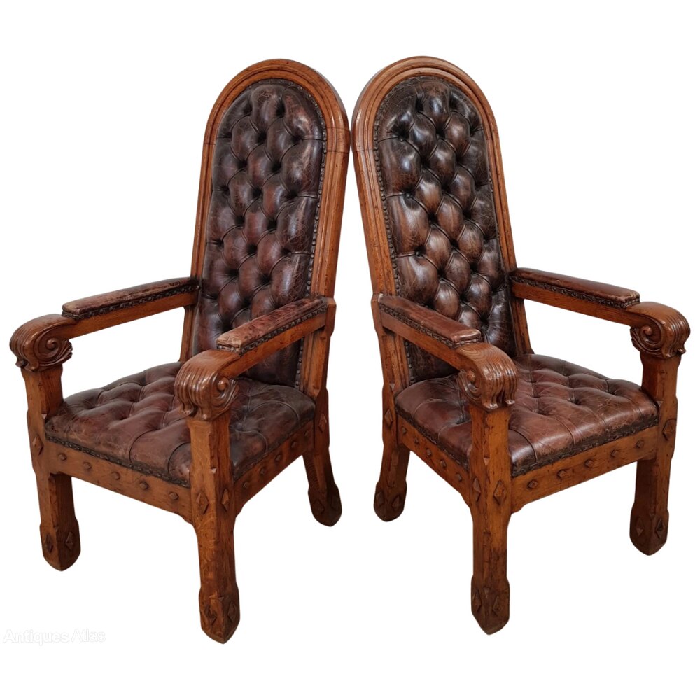 A majestic pair of mid 19th-century Gothic Revival throne-armchairs in solid oak showcasing a lovely original golden patina. Each chair is distinguished by a tall, arched back, upholstered in deep-buttoned soft leather, secured with decorative brass studs and generously proportioned with the seats designed for comfort.The frames are carved with architectural Gothic motifs, while the arm supports terminating in bold scrolled volutes. The oak shows a superb colour and grain, enhanced by a mellow aged surface acquired over more than a century of care and use.