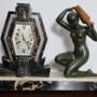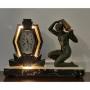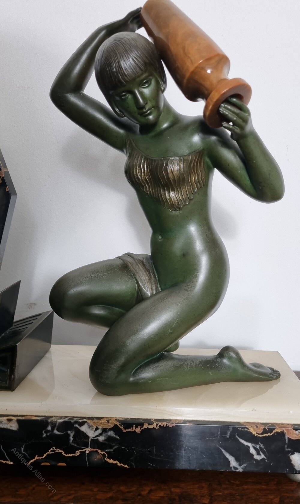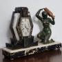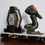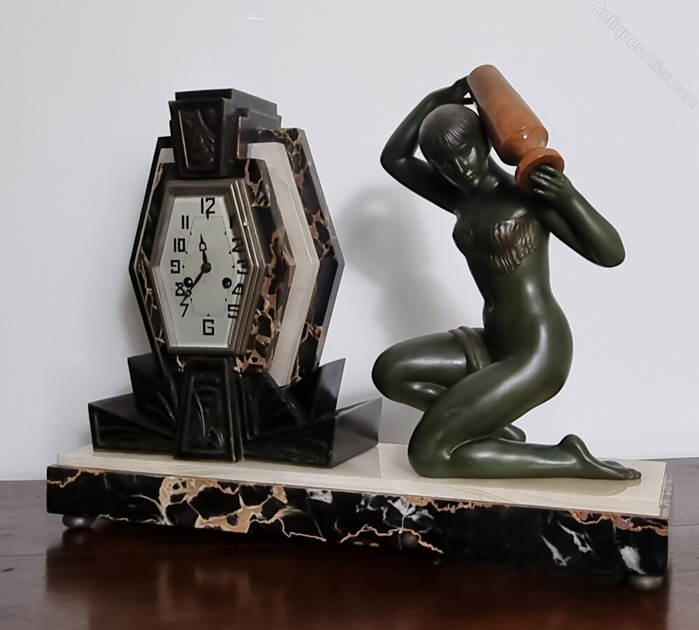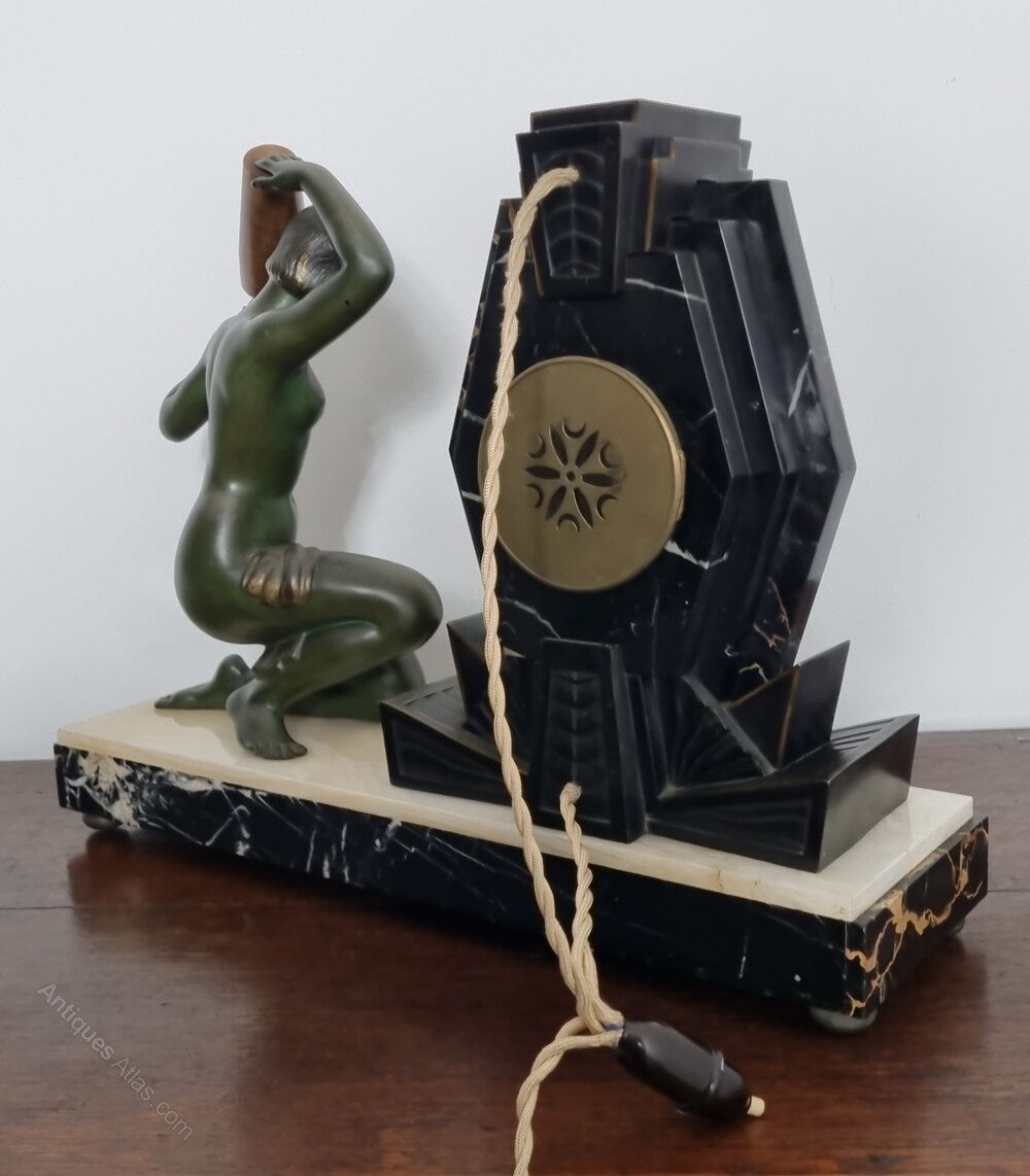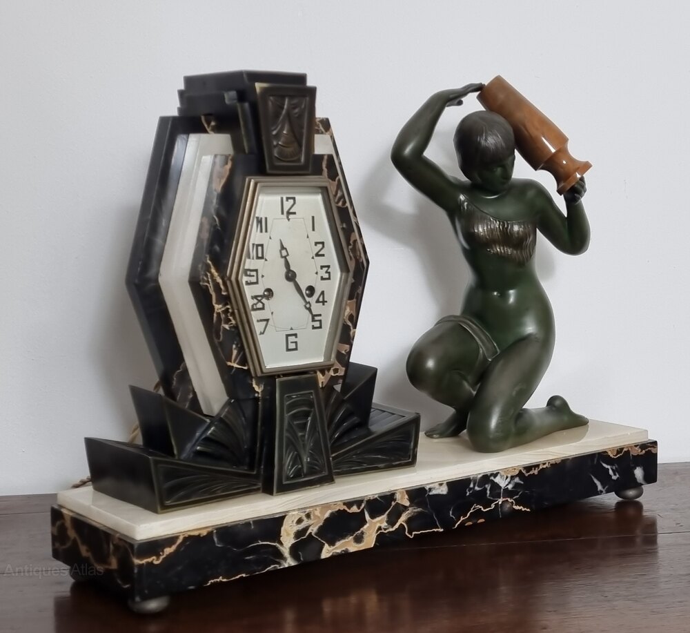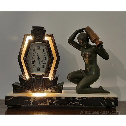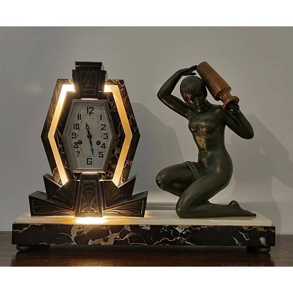 A spectacular Art Deco illuminated clock featuring a sculpture of the water carrier / Nude with a Vase.The exquisite geometric design of the clock case is crafted from Portoro marble and white onyx, adorned with a geometric spelter structure holding the clock dial. It is mounted by a cold-painted spelter sculpture of a kneeling lady holding an alabaster vase.