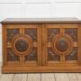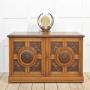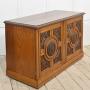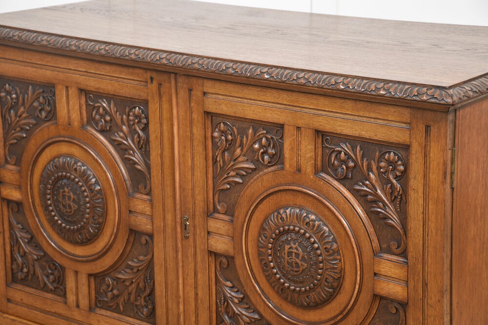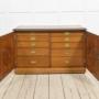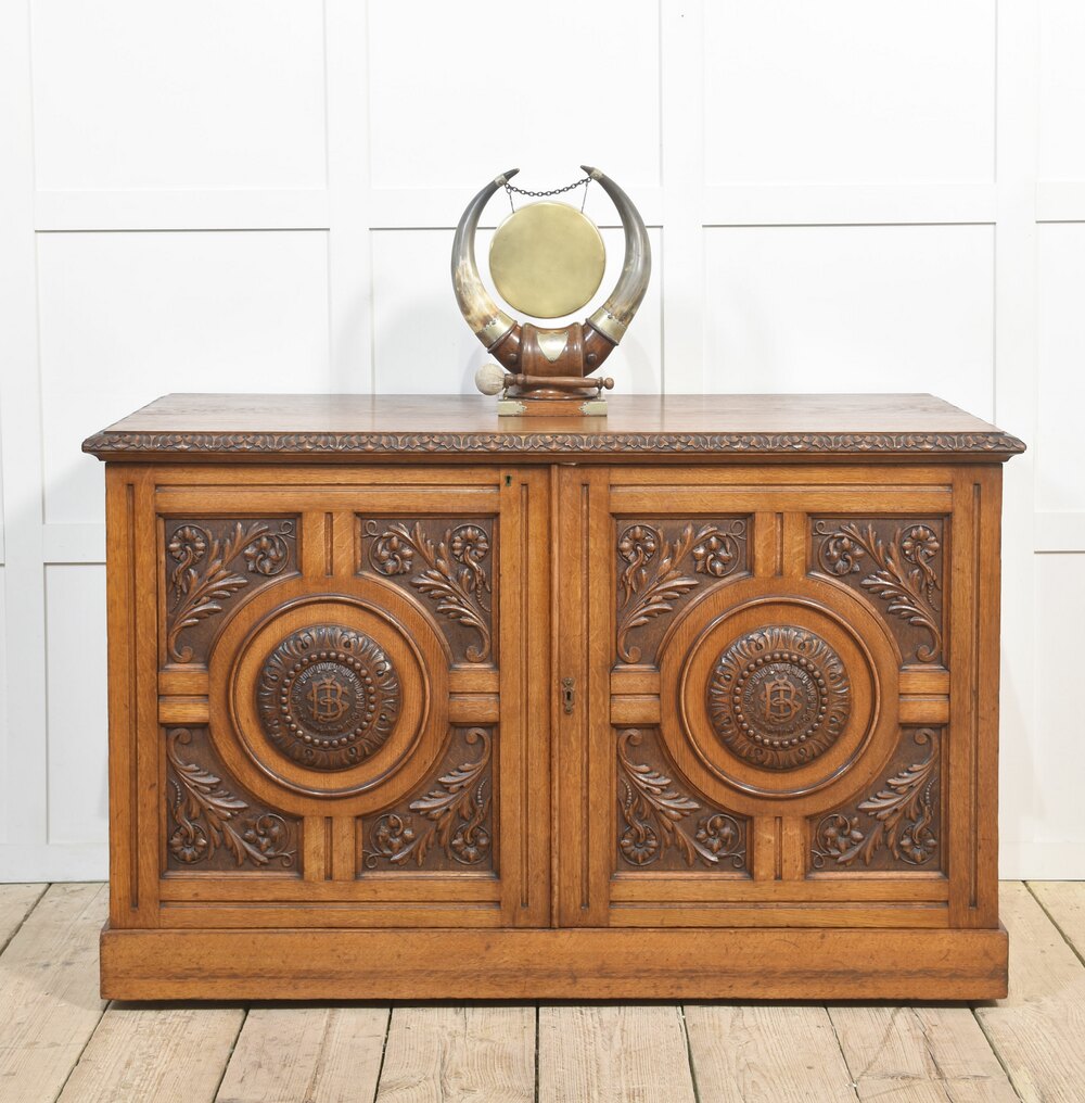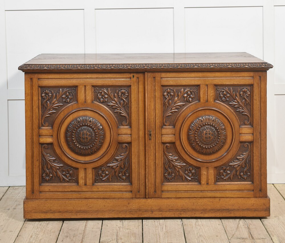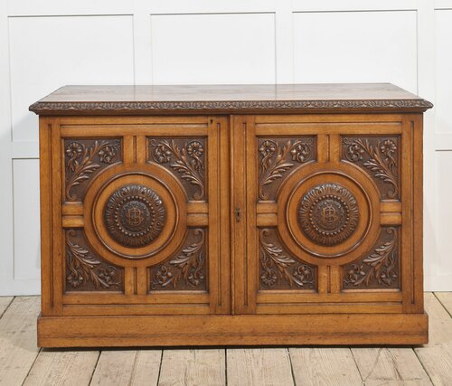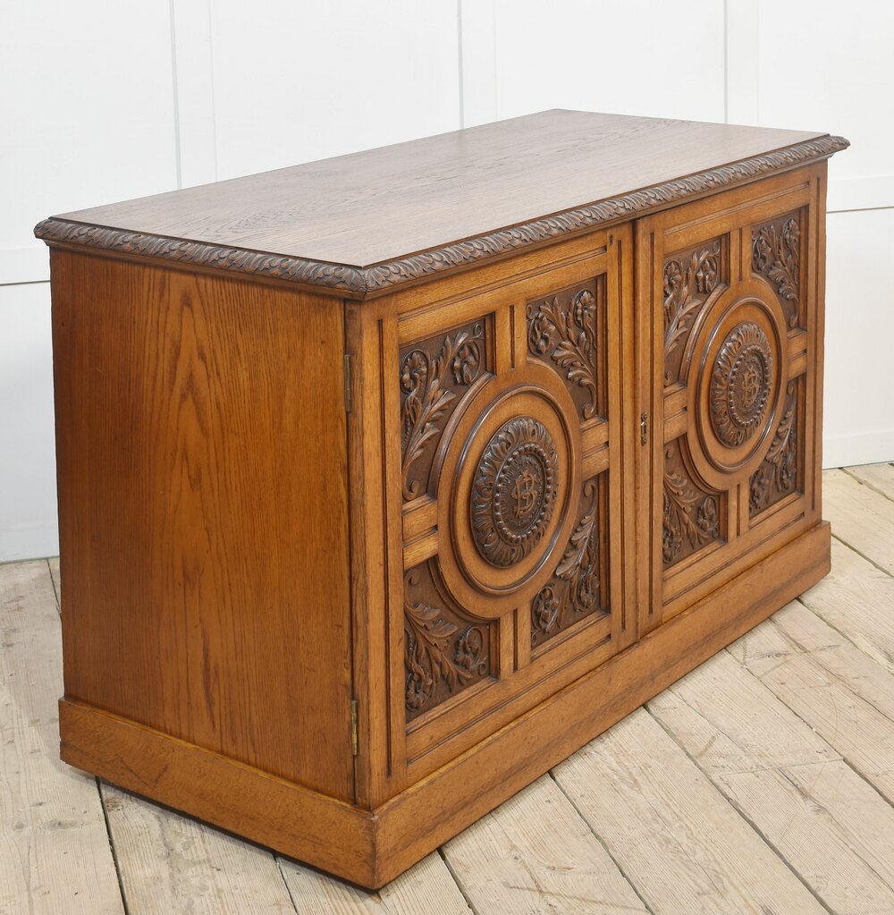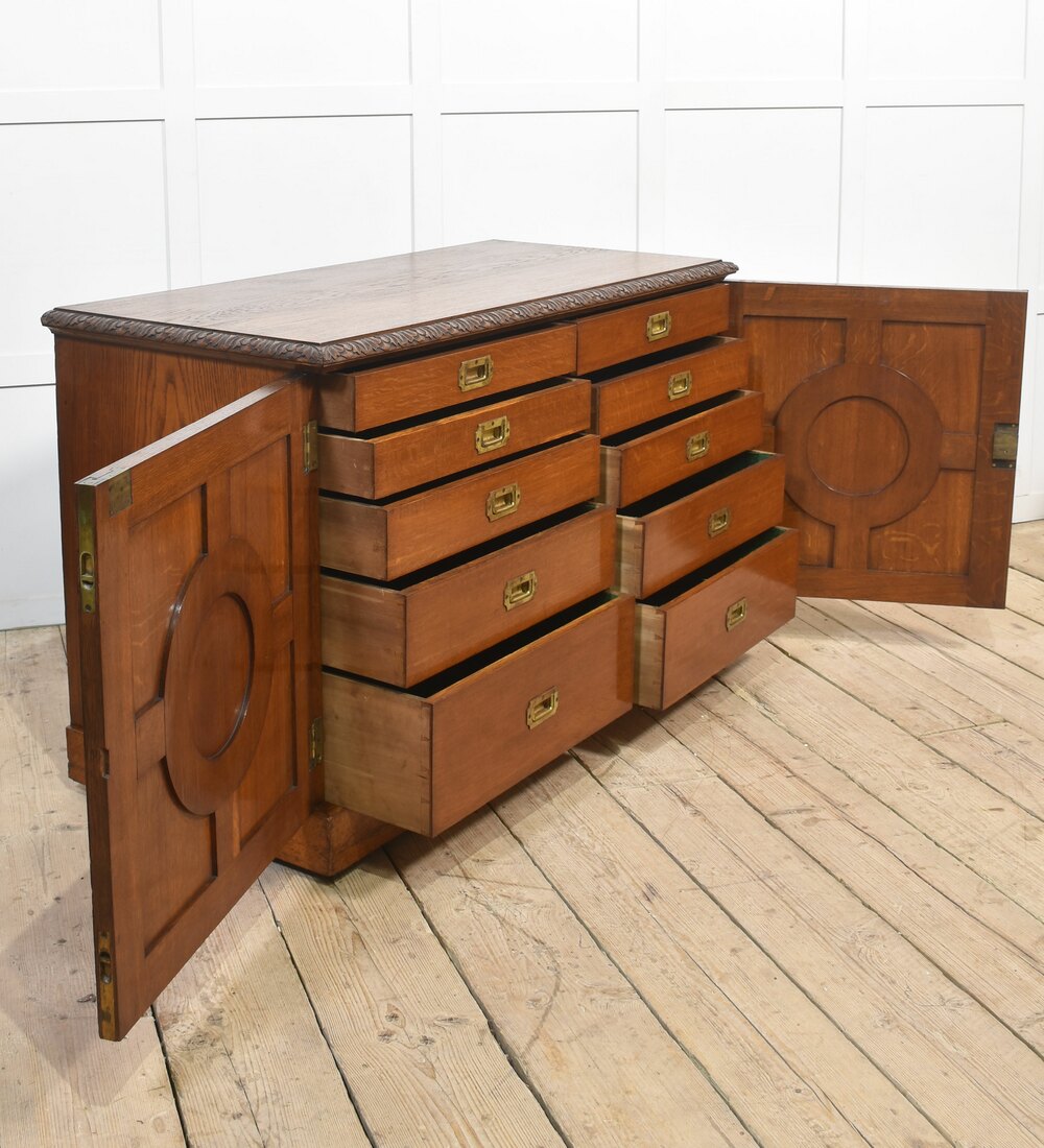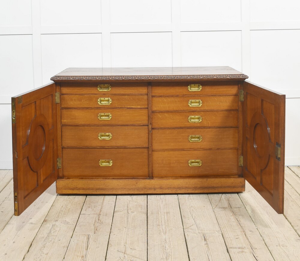 19th-century cabinet, the large rectangular well-figured oak top having a molded edge. Above two finely carved doors with foliated scrolling detail. The door opening to reveal two banks of five graduated drawers with recessed brass handles. All raised up on a plinth base.Dimensions