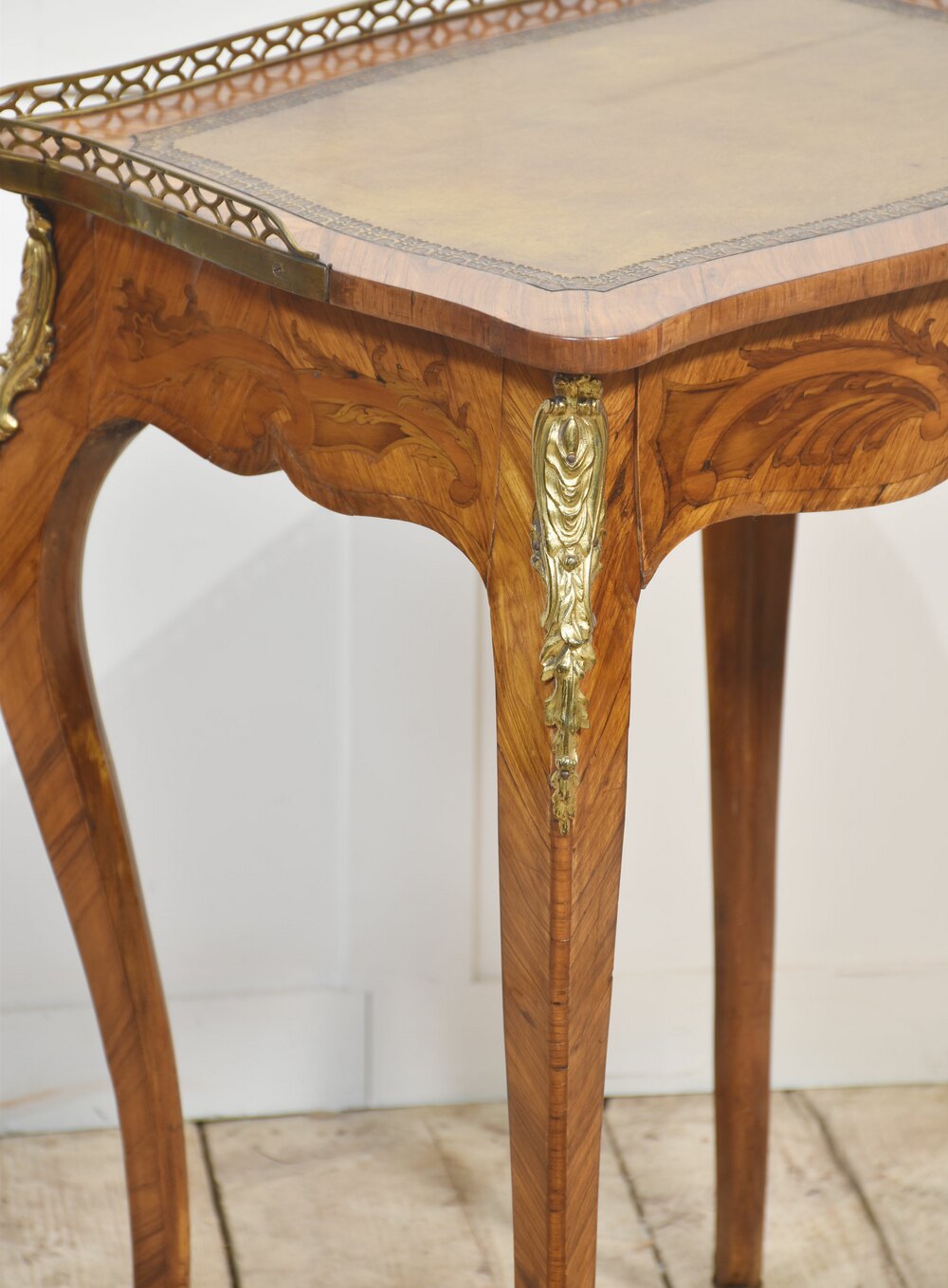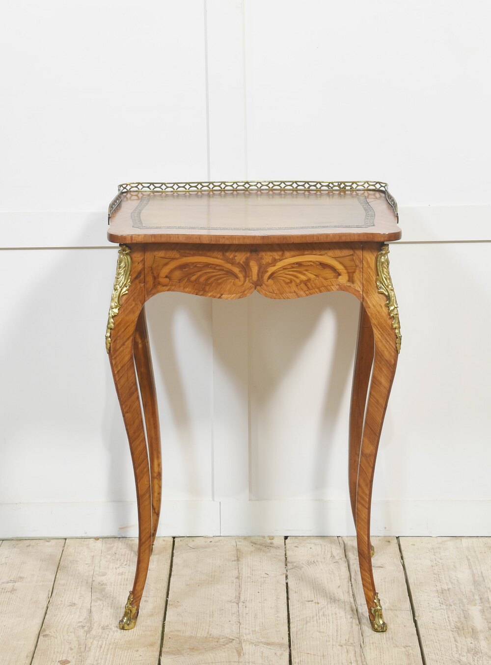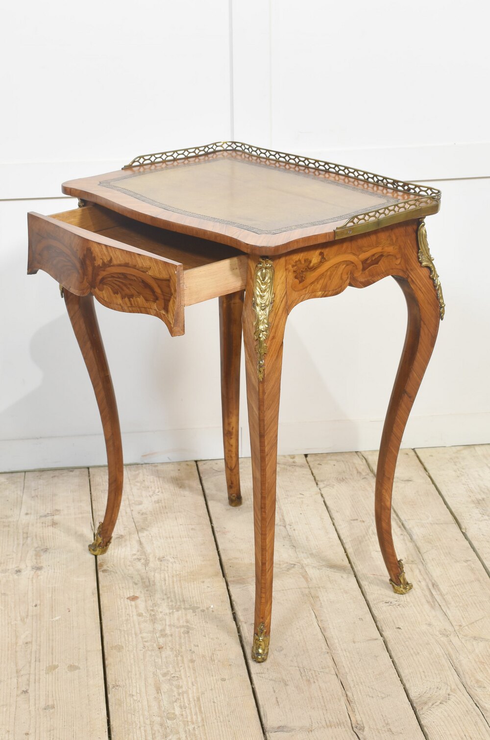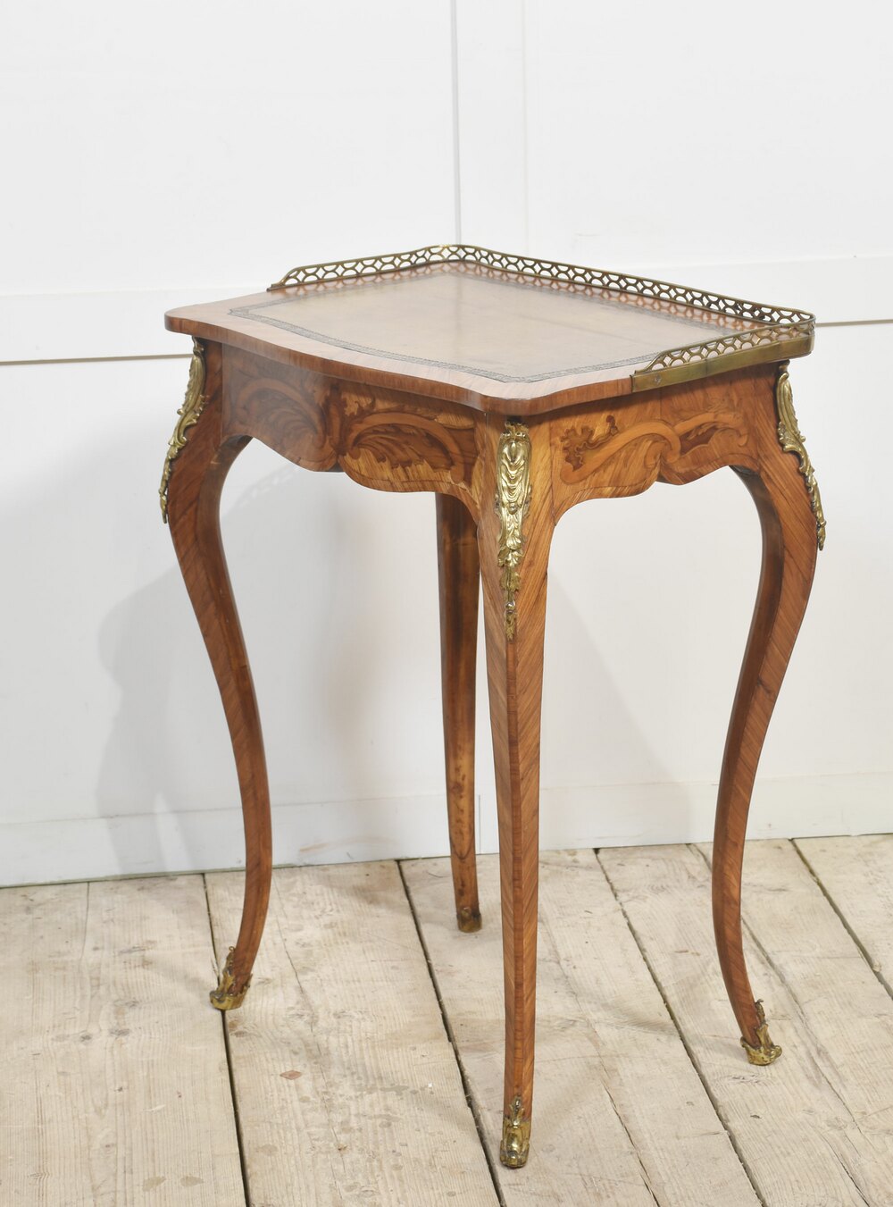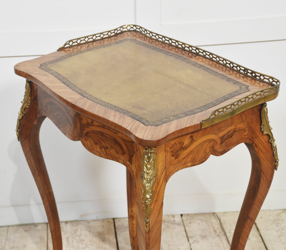 French gilt-metal mounted marquetry and kingwood side table, of Louis XV style, the pierced brass gallery above inset leather writing surface to the frieze fitted with a long drawer. All raised on slender cabriole supports.Dimensions