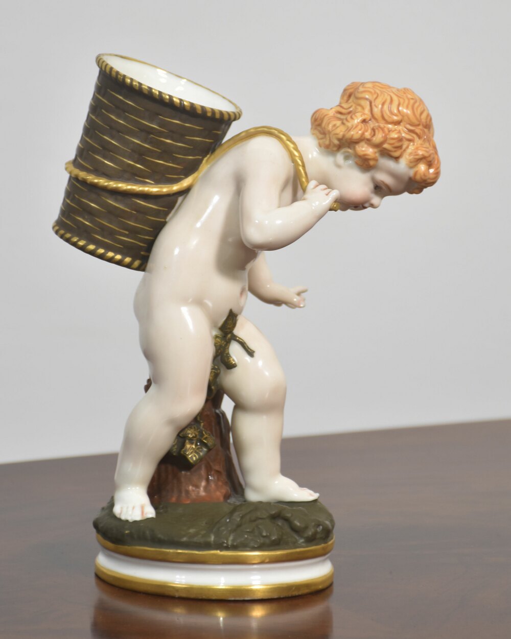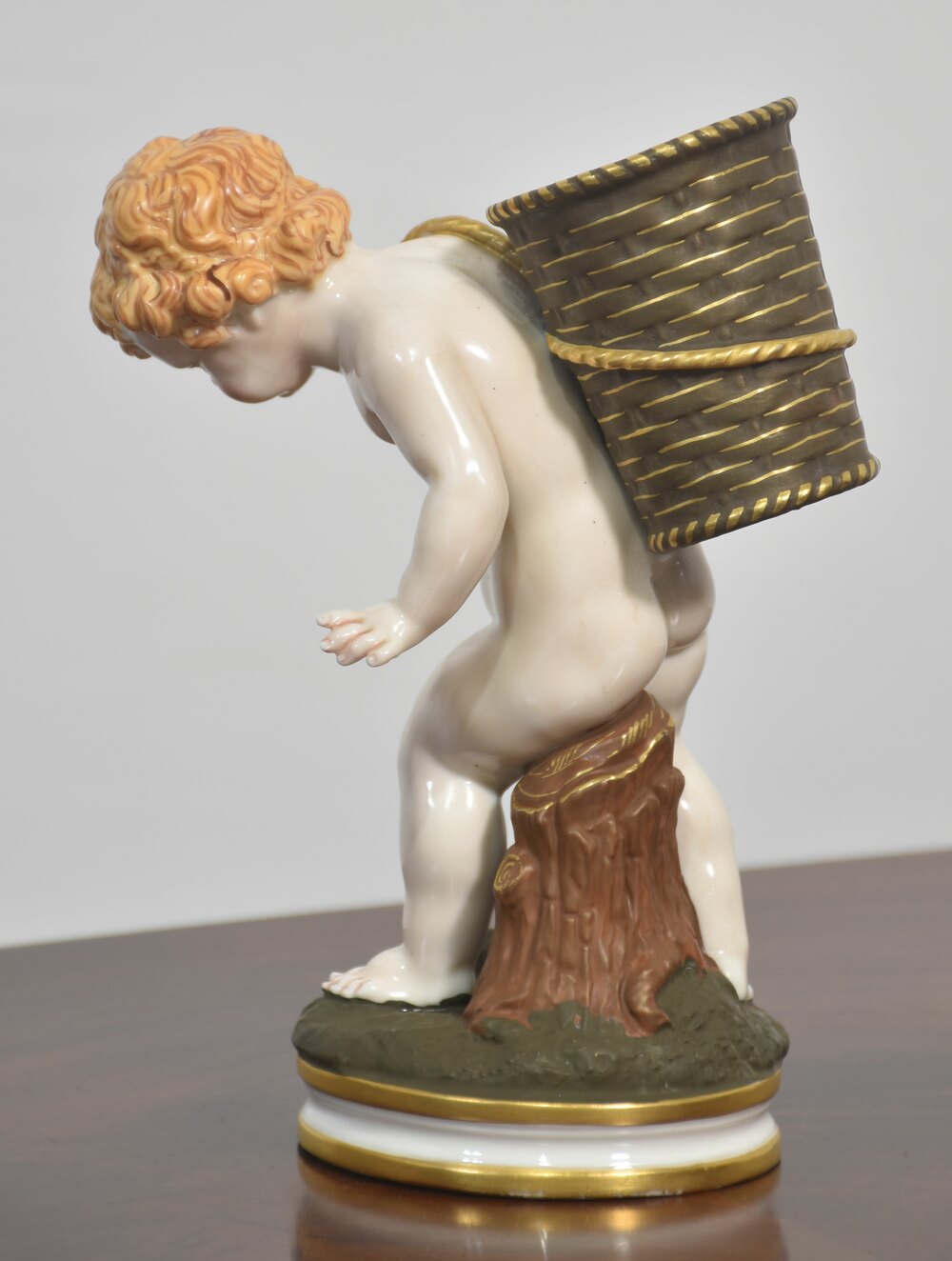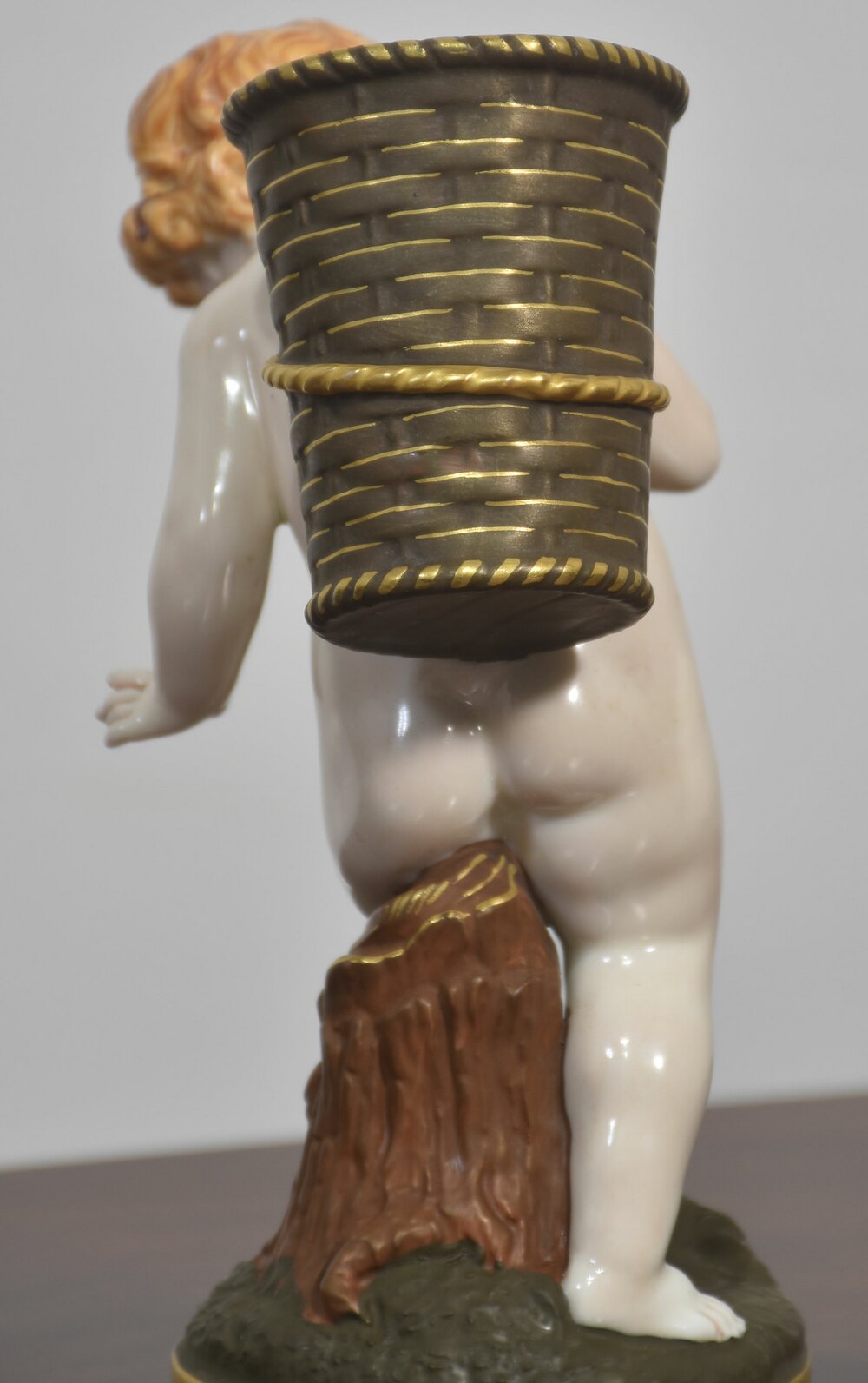 A beautifully crafted Royal Worcester porcelain figurine depicting a cherub carrying a large basket on its back. The figure is rendered with exquisite attention to detail, showcasing the soft modelling and delicate hand-painting characteristic of Royal Worcester’s fine porcelain.The cherub features finely detailed golden curls and a gentle, downcast expression, balanced gracefully as it supports a basket designed in a realistic woven style with gilded rope accents. The figure stands on a naturalistic mound base, enriched with earthy tones and finished with a gilt-edged circular plinth.