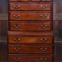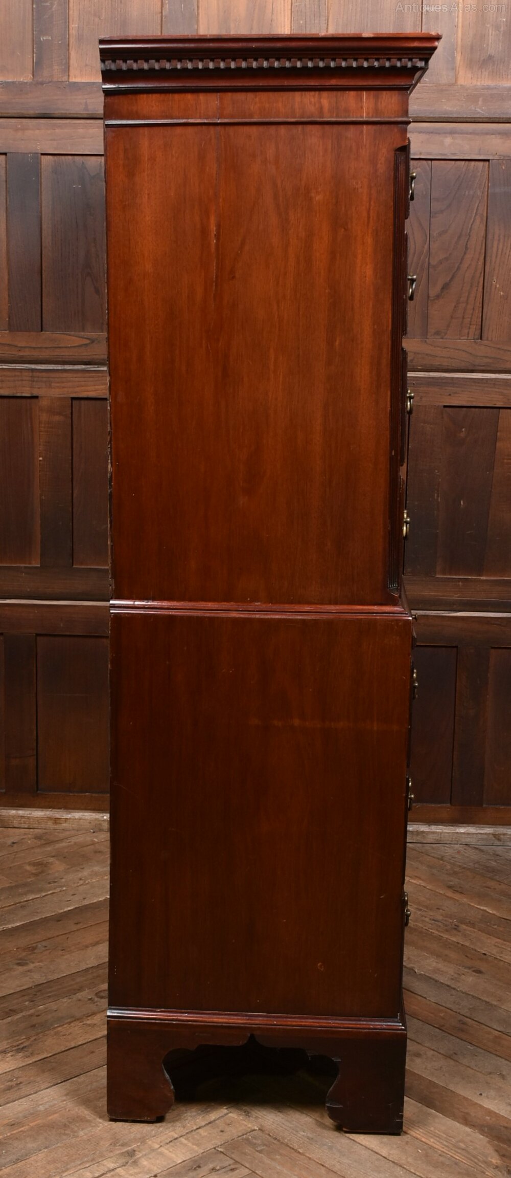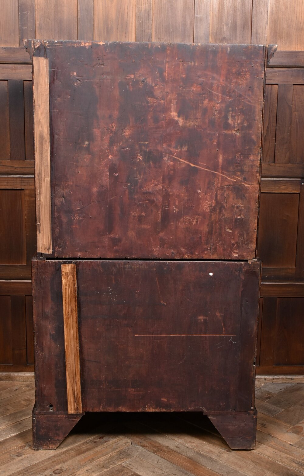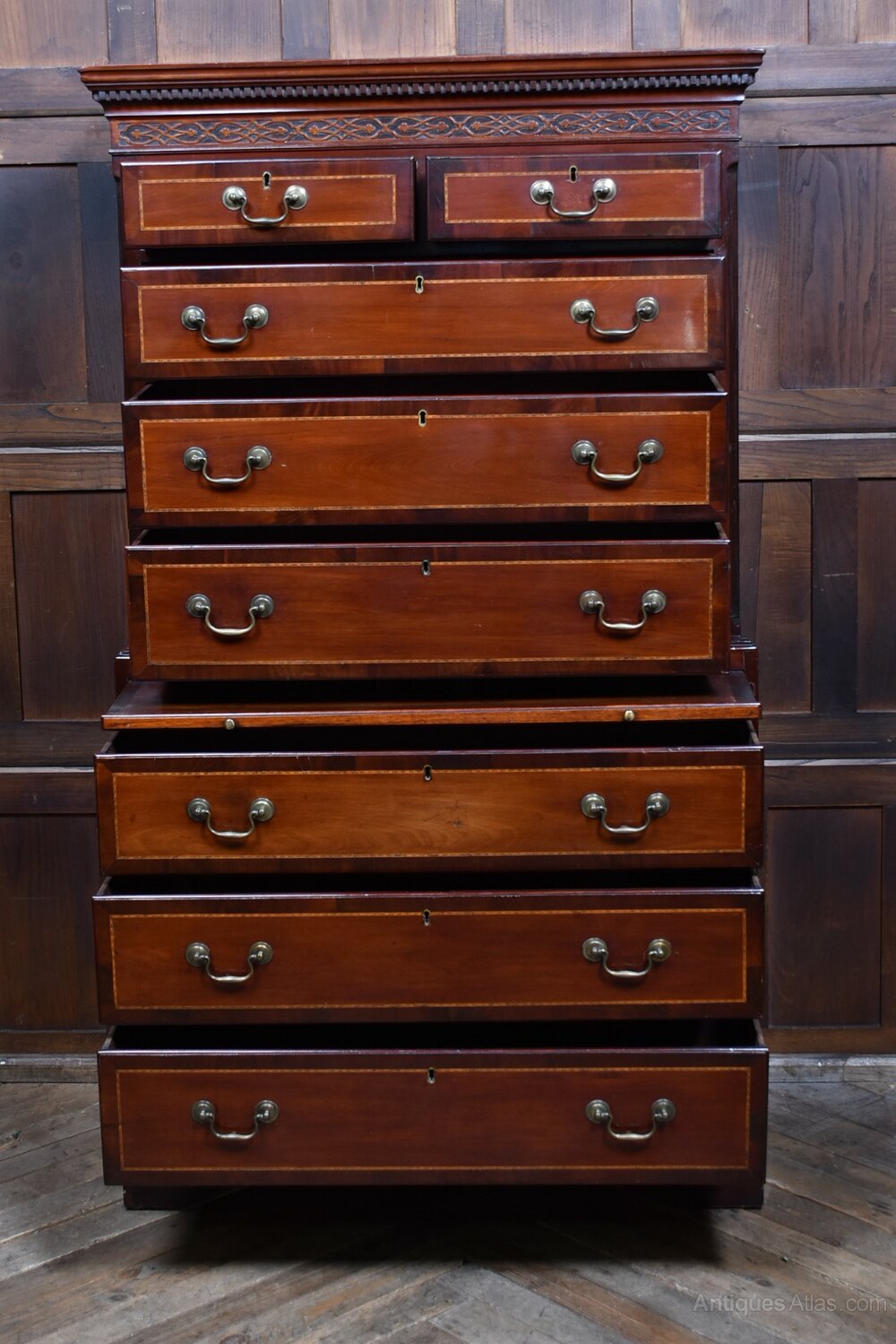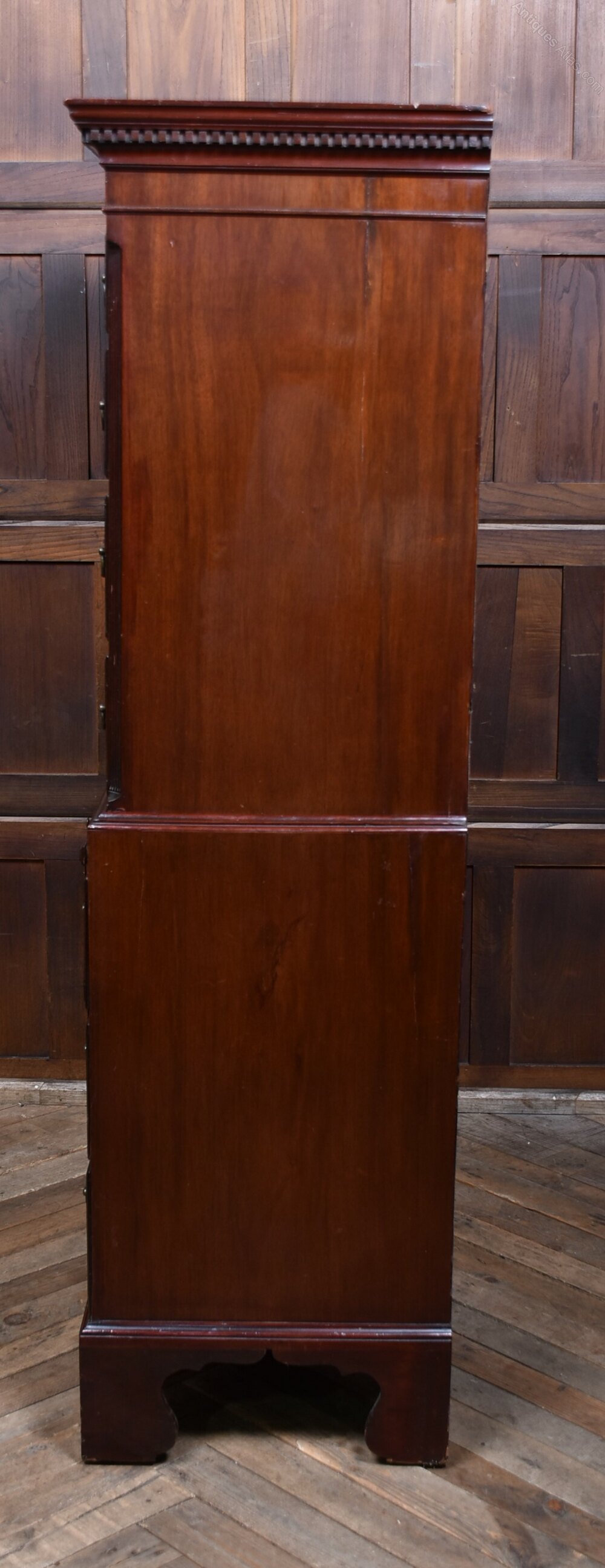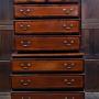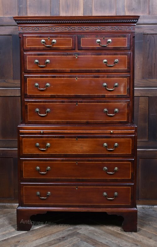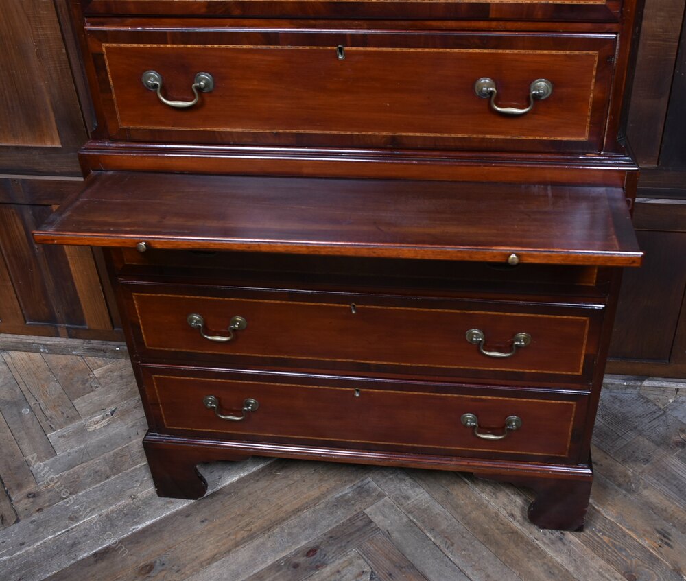 Wonderful mahogany Georgian chest-on-chest in excellent antique condition. Designed for convenience, it separates into two sections, making transportation effortless within your home. The top section features two smaller drawers positioned above three graduated drawers, while the base comprises three additional graduated drawers, along with a practical brush slide, all resting on sturdy bracket feet.Every drawer is skilfully crafted with dovetail joints and adorned with elegant brass handles and string inlay decoration. Like all treasured antique furniture, it carries minor imperfections that only enhance its charm and historic character. With its rich colouring, beautiful graining, and ample storage capacity, this solid chest of drawers is a stunning example of period craftsmanship, bringing both functionality and timeless history to any space.