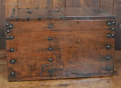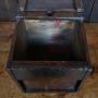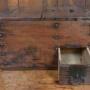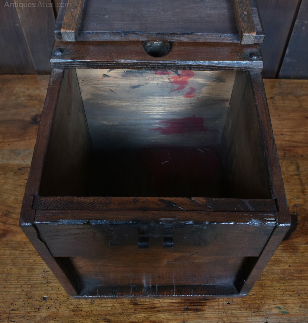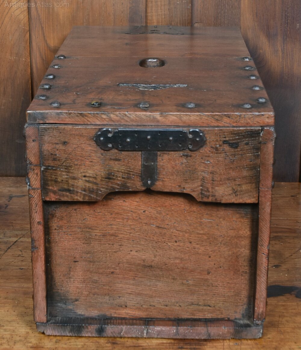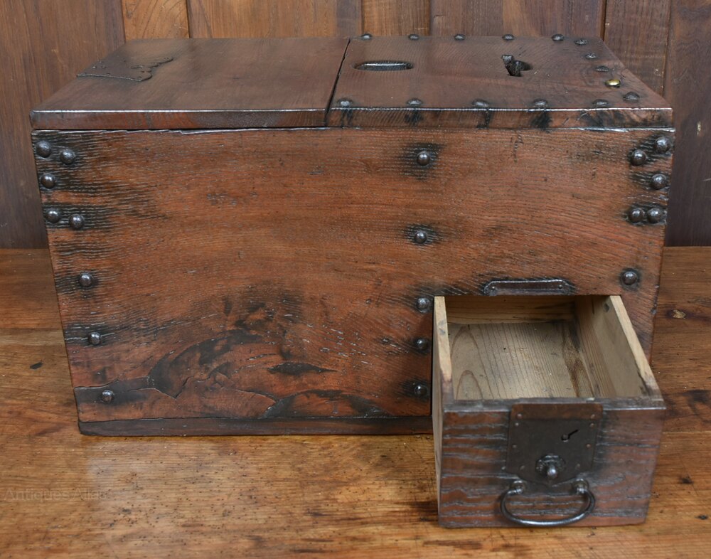 A striking example of a traditional Japanese zenibako—a secure money box crafted from richly patinated wood and reinforced with iron rivets and hardware. The box features a hinged lid with a circular coin slot and a separate locking compartment, suggesting its use for storing and safeguarding currency or valuables. The aged surface and robust fittings speak to decades of practical use, while the interior reveals a painted panel depicting a figure in motion, adding a touch of mystery and artistry. A rare and evocative piece that blends utility, folk craftsmanship, and cultural heritage.Internal Reference: SAI3888