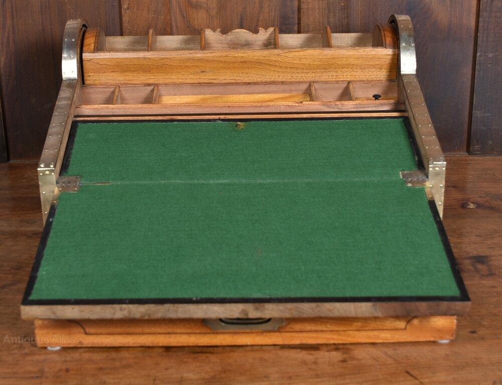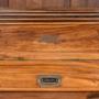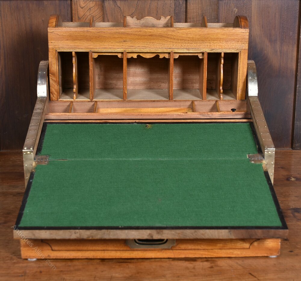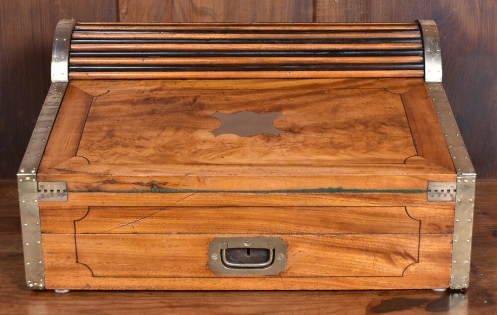 A superb example of 19th-century campaign furniture, this roll-top writing slope is crafted from solid camphor wood and bound in brass to all edges, combining durability with elegant design. The fall front bears a central brass plaque. Cleverly designed, the lower drawer activates the roll-top mechanism above, which glides open to reveal a pop-up compartment fitted with a bank of pigeonholes. The writing surface is lined in green baize and conceals a charming secret compartment containing two drawers. The mellow tone and rich patination of the camphor wood, developed over years of use and care, lend this piece warmth and character. In excellent antique condition, with only minor marks commensurate with age, this beautifully engineered and highly functional writing box would make a distinguished addition to any study, library, or collector’s cabinet.Internal Reference: SAI3907