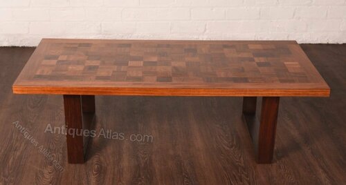 A striking mid-century rosewood coffee table designed by the renowned Poul Cadovius, celebrated for his innovative contributions to Danish furniture design. This piece features a beautifully executed parquetry top, composed of alternating rosewood squares that create a rhythmic mosaic of tone and grain. The craftsmanship is exceptional—each segment carefully aligned to showcase the natural variation and richness of the wood. The table’s clean lines and low profile lend it a timeless elegance, while the geometric surface adds visual intrigue without overwhelming a space. Supported by four solid legs in a darker rosewood, it balances sculptural presence with everyday functionality.Internal Reference: SAI1045