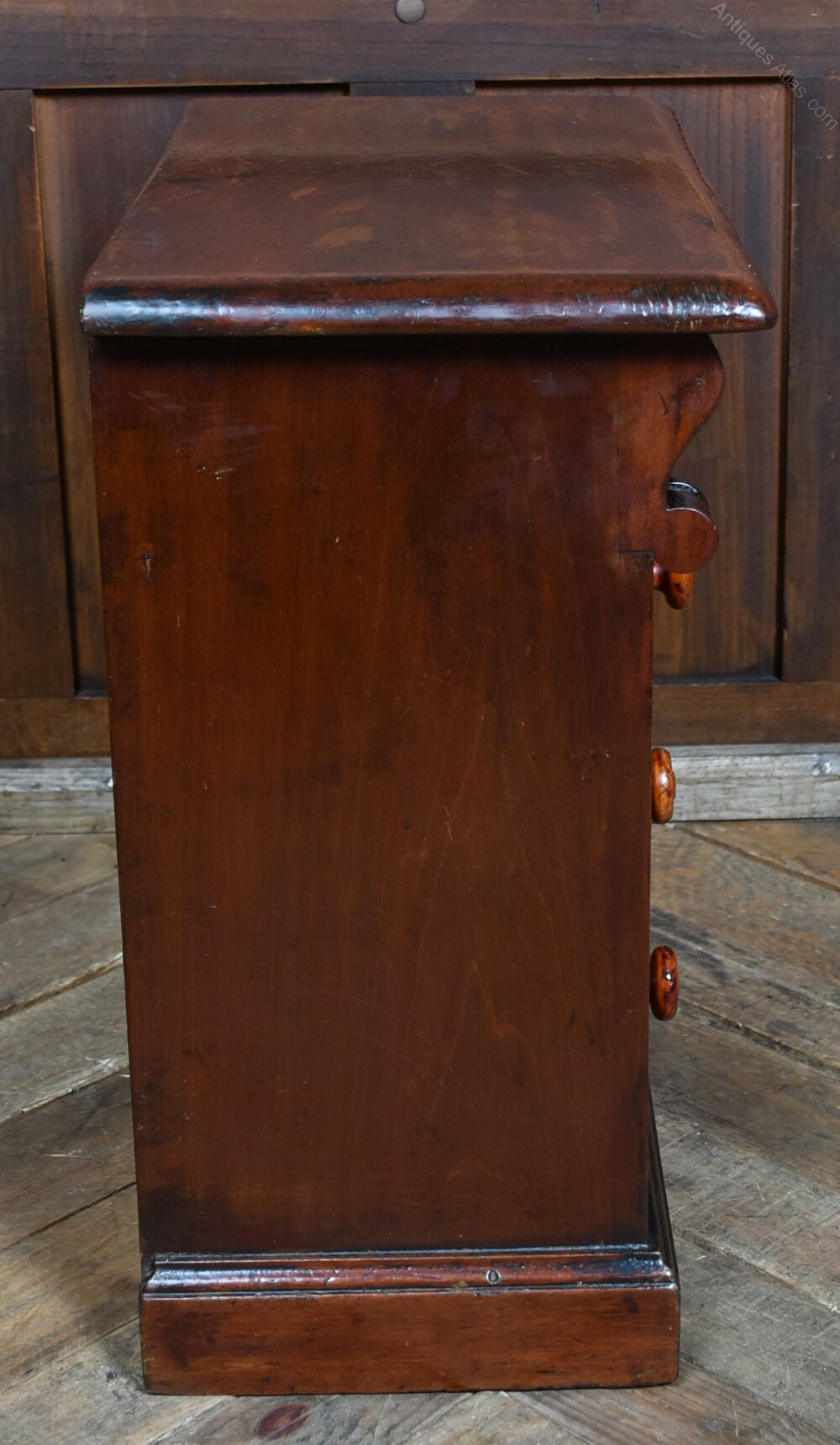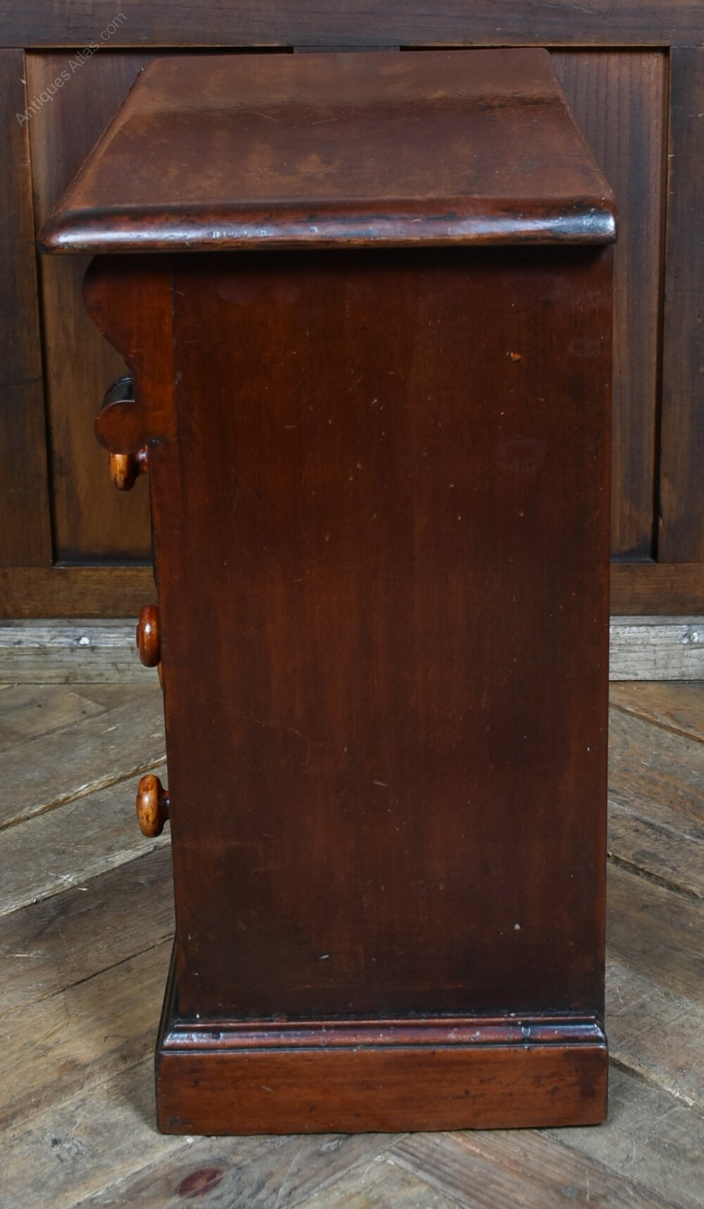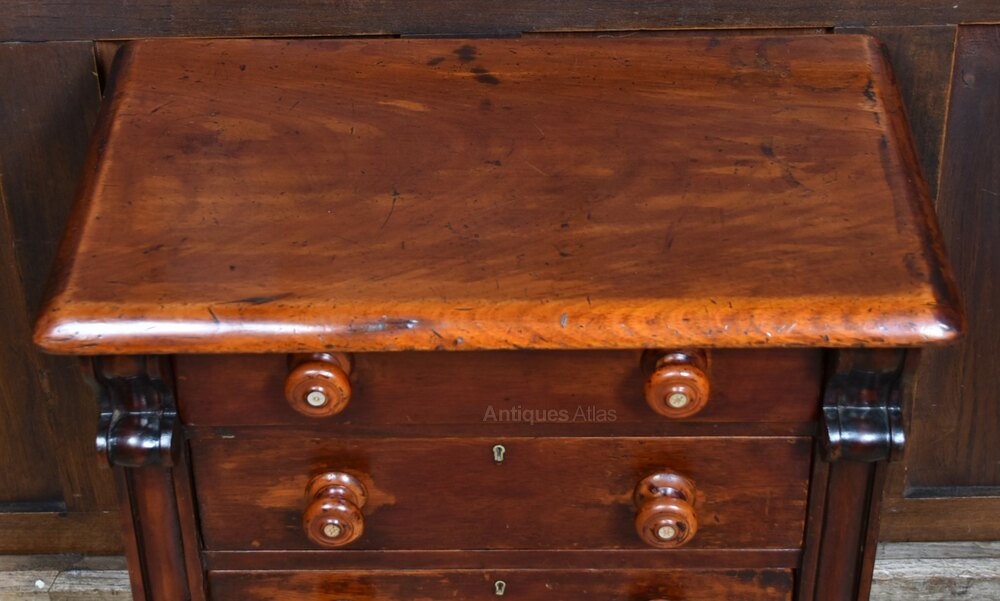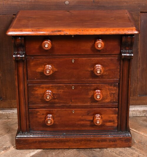A beautifully crafted miniature chest of drawers in rich mahogany, dating from the fabulous Victorian era and presented in excellent antique condition. The front comprises four drawers, each fitted with turned wooden knobs delicately inlaid with mother-of-pearl. Slender Scottish-style columns flank the drawers, subtly carved and rising from a moulded plinth base, lending the piece a classical architectural presence. The warm patina and gentle signs of age speak to its history and enduring appeal. Likely created as an apprentice piece or intended for use as a collector’s cabinet, it stands as a fine example of regional craftsmanship. Elegant and evocative, it would sit beautifully in a curated interior or form a distinguished addition to a refined furniture collection.Internal Reference: SAI3974