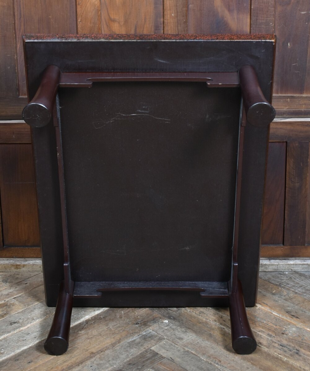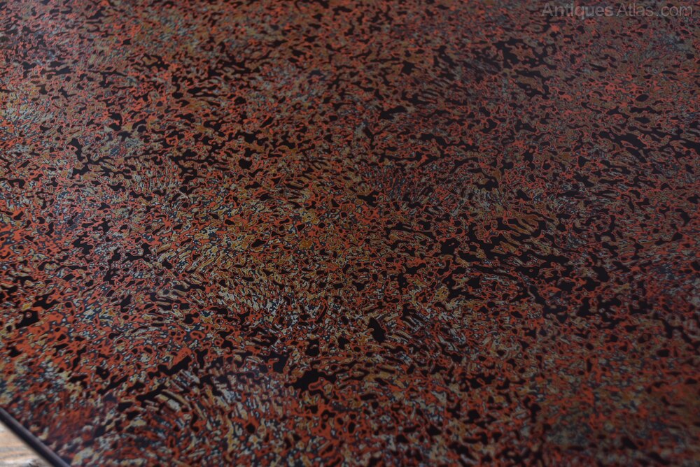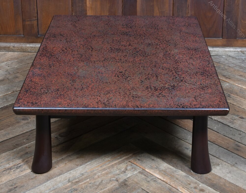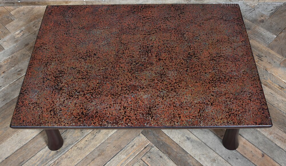 A fine Japanese Wakasa table, low in stature and rich in character, crafted in the traditional chabudai style. The rectangular top is finished in a speckled reddish-brown lacquer, offering a warm, tactile surface that reflects the depth and artistry of time-honoured techniques. Its four short, gently flared legs provide both stability and grace, echoing the quiet geometry of classical Japanese design. The proportions invite floor-level seating, making it ideal for tea ceremonies, quiet reflection, or intimate gatherings. With its minimalist silhouette and serene lacquered finish, the table bridges tradition and modernity, equally at home in a curated interior or as a subtle nod to Japanese craftsmanship in a contemporary setting. A quiet yet compelling piece, it balances form and function with poetic restraint.Internal Reference: SAI3975