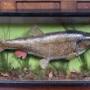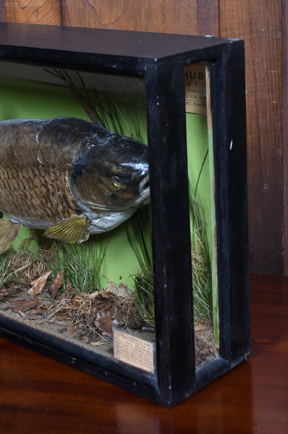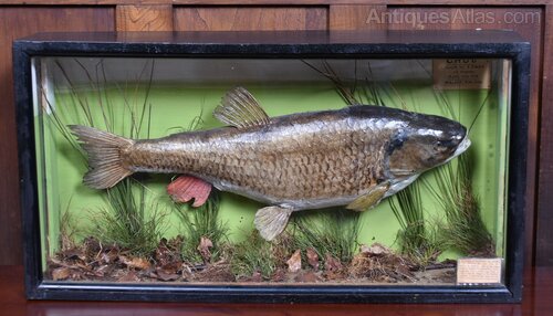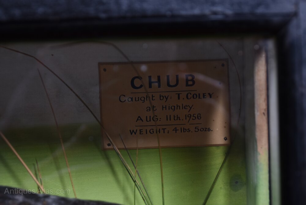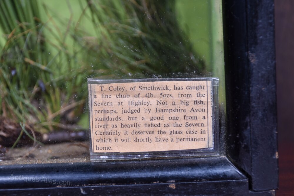 A beautifully preserved chub, mounted in a traditional glass-fronted case with a painted green backdrop and naturalistic groundwork of reeds and grasses. This specimen was caught by Mr. T. Colley at Highley on the River Severn on August 11th, 1958, weighing 4 lbs. 5 ozs. The case features original period labels, including a printed note referencing the catch’s merit. The fish is skilfully mounted to highlight its natural shape and colouring, combining visual appeal with historical significance.River Severn is a heavily fished stretch of river, where such a weight is considered a worthy achievement.