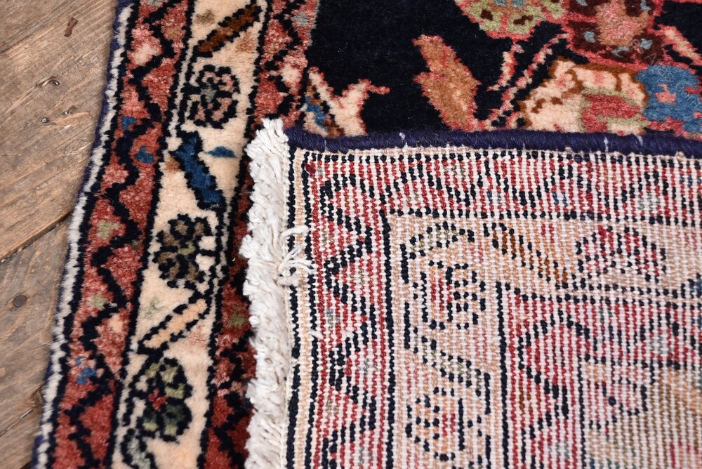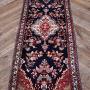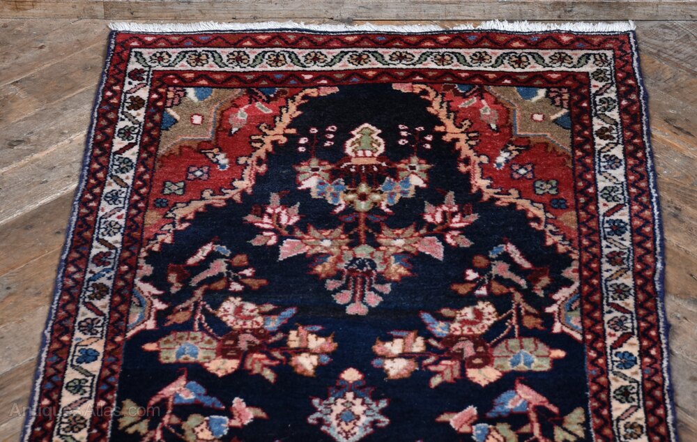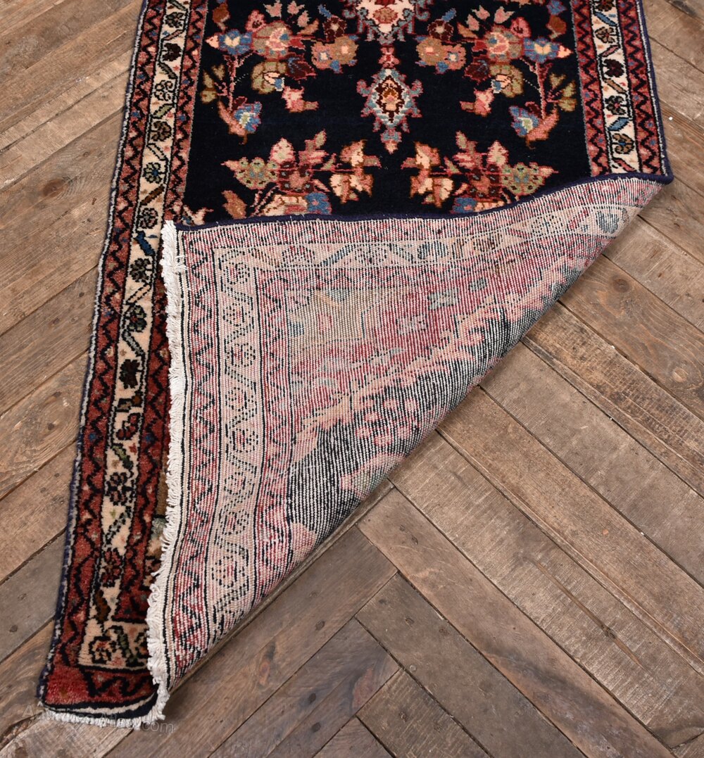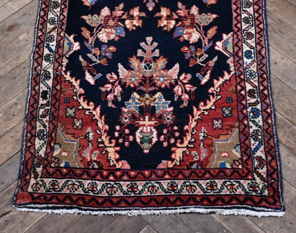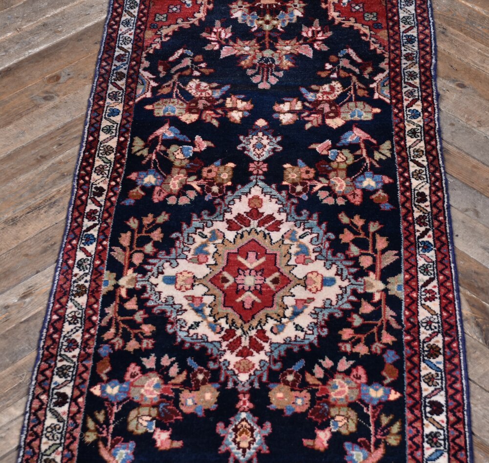 This vintage hand-knotted Persian runner is full of character and presented in clean, ready-to-use condition. Its dark blue field is adorned with a central medallion and flanked by deep red spandrels, all enclosed within a classic border of floral and geometric patterns. Light age-related wear only enhances its charm, with colours and detailing still beautifully intact. Woven by skilled hands, it’s a piece that brings timeless warmth and personality to any space.Internal Reference: SAI4007