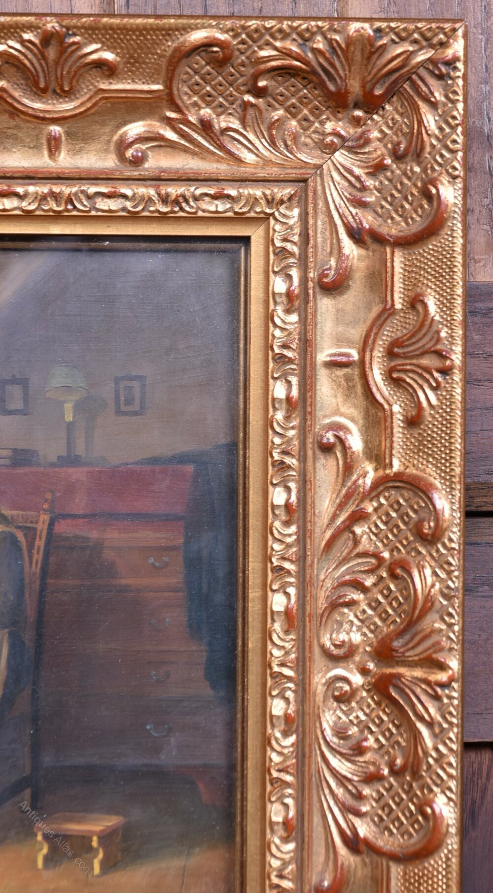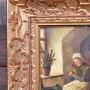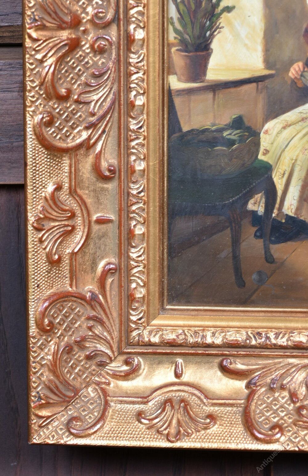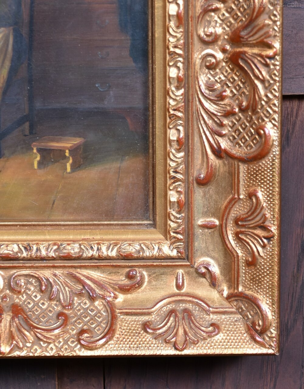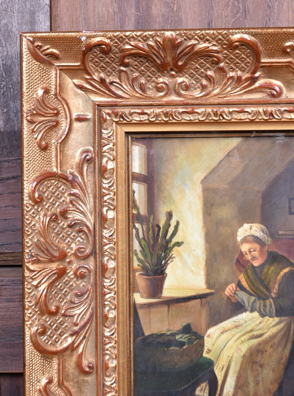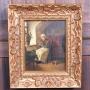 A beautifully executed oil on board portraying an elderly woman quietly darning socks beside a sunlit window. The domestic interior is rendered with gentle intimacy—potted plant, footstool, and dresser all adding to the scene’s quiet charm. Framed in an ornate gilt frame with floral and scrollwork detail, the painting captures a moment of stillness and reflection, rich in tone and texture.Internal Reference: SAI4001