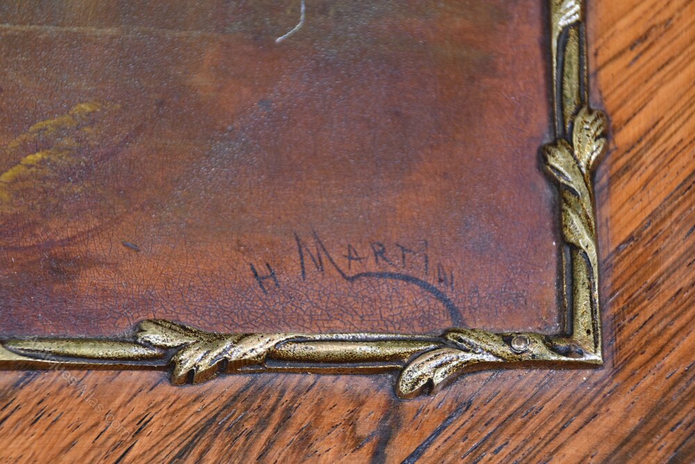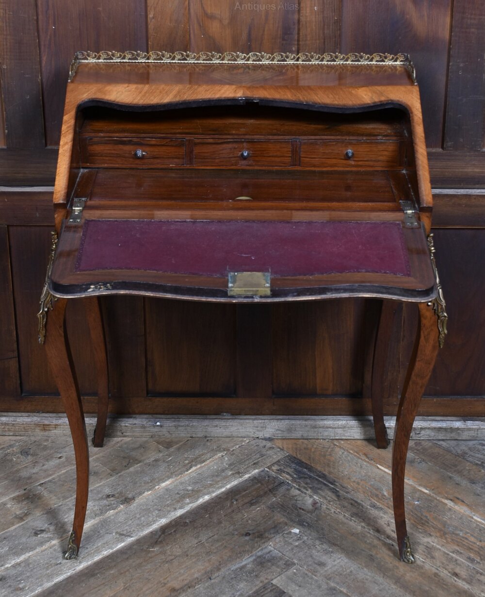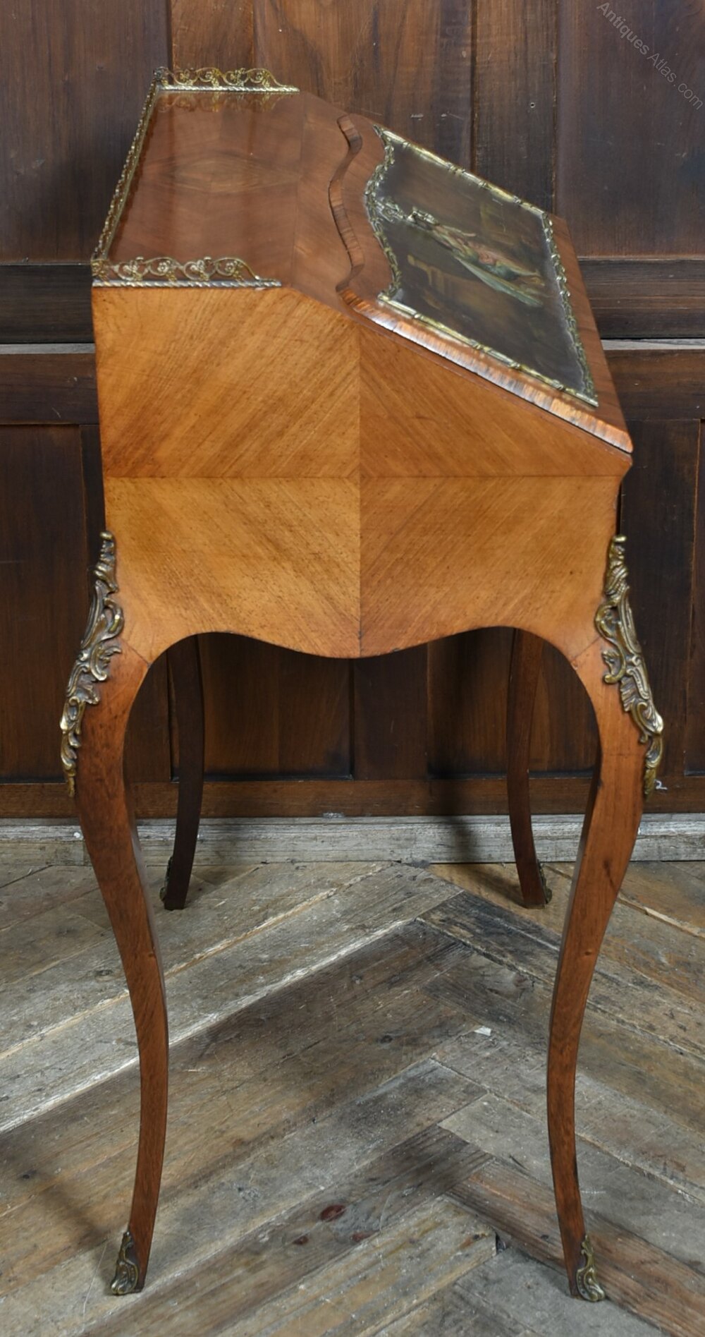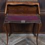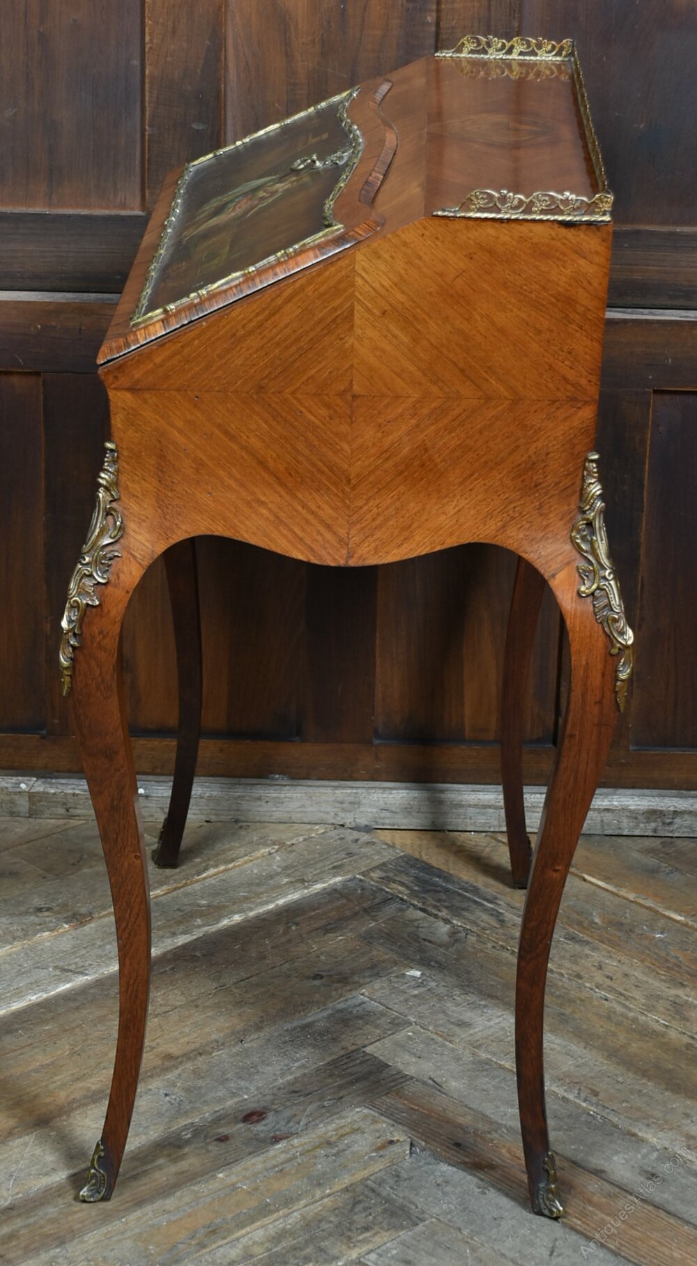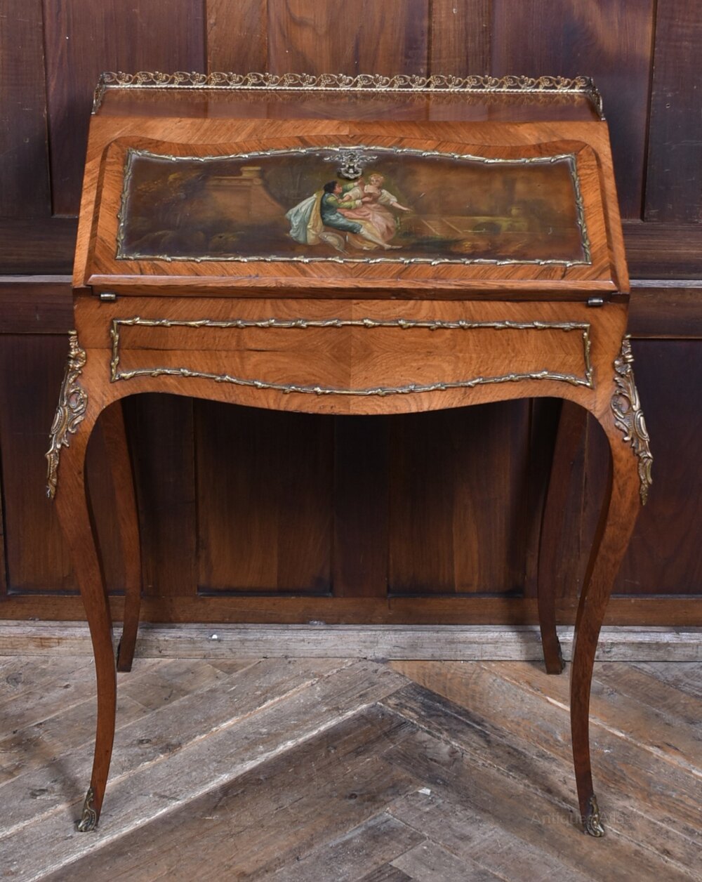 Superb rosewood writing bureau with pierced brass galleries and features a fall-front panel hand-painted with a romantic scene, framed in ornate ormolu mounts and signed H. Martin. The shaped fall opens to reveal a fitted interior with a wine-coloured leather writing surface and three small drawers, offering both charm and practicality. Raised on four slender cabriole legs with ormolu mounts at the knees and decorative sabots at the feet, the bureau is united by a shaped apron that enhances its graceful silhouette. With its warm tones, refined proportions, and functional elegance, this bureau is a striking fusion of decorative artistry and timeless utility—an ideal centrepiece for any sophisticated study or interior.Internal Reference: SAI4010