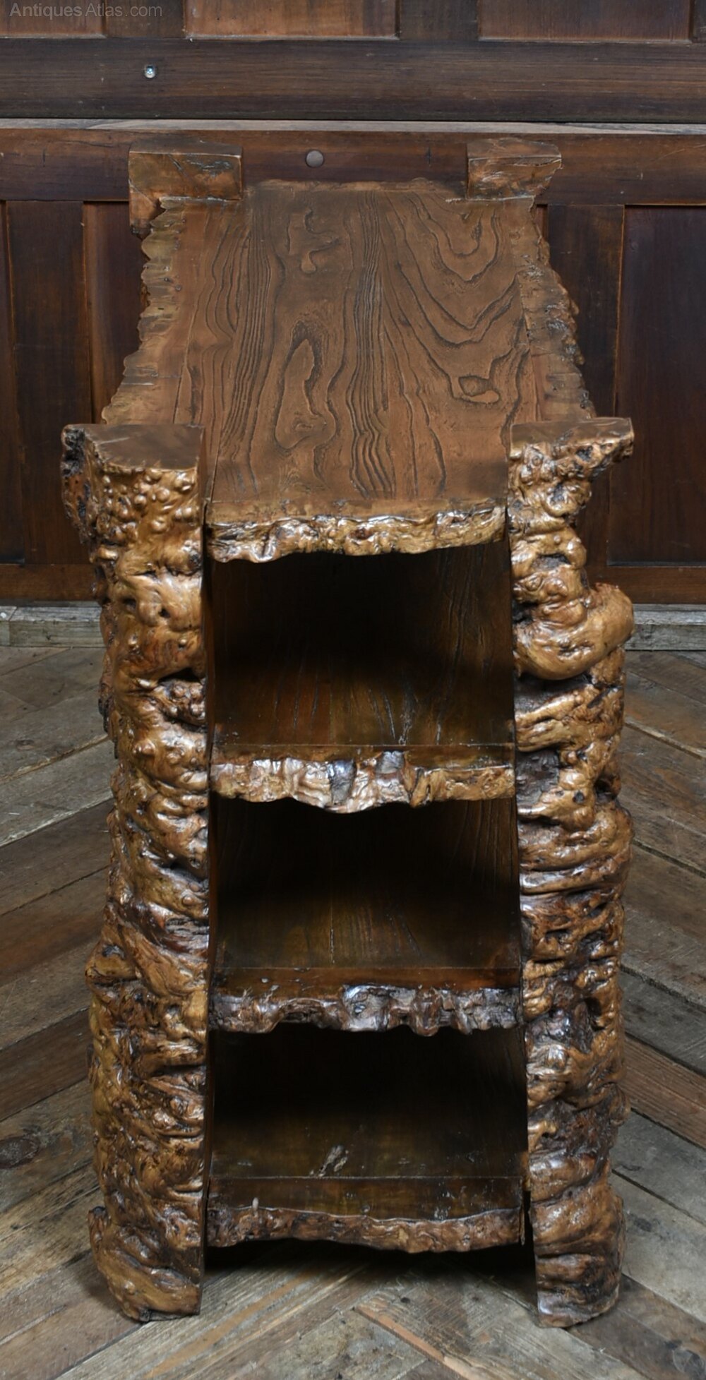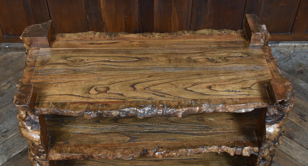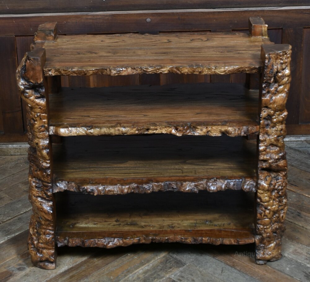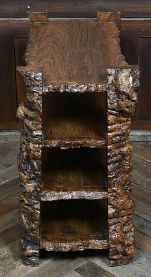 A striking Japanese burr elm bookshelf, crafted from richly grained timber with a sculptural, organic form. The four-tiered design is supported by gnarled side panels that evoke tree roots or natural rock formations, while the thick, bark-edged shelves showcase the wild beauty of the wood. The deep, lustrous finish enhances the swirling grain and natural contours, making this piece as much a work of art as a functional storage unit. A bold and characterful addition to any interior, ideal for displaying books, ceramics, or curios with flair.Internal Reference: SAI4016