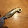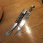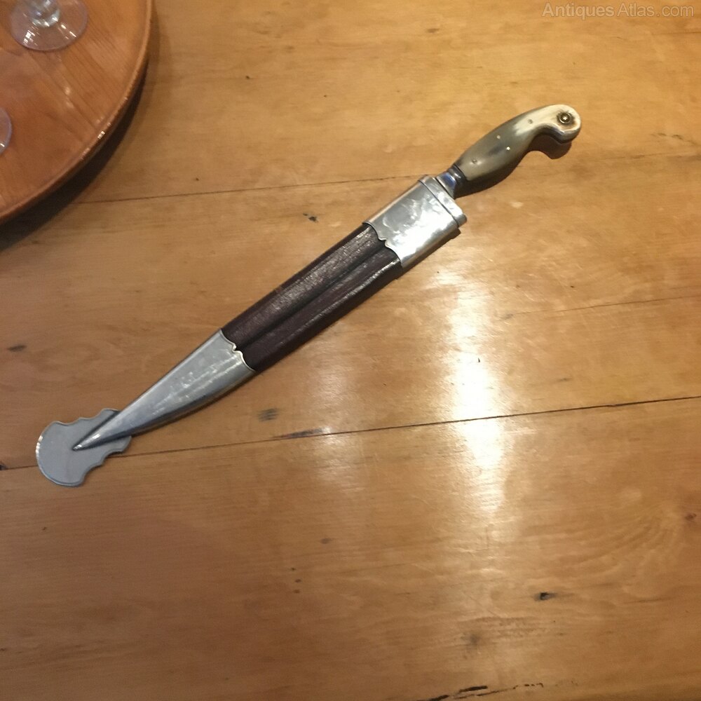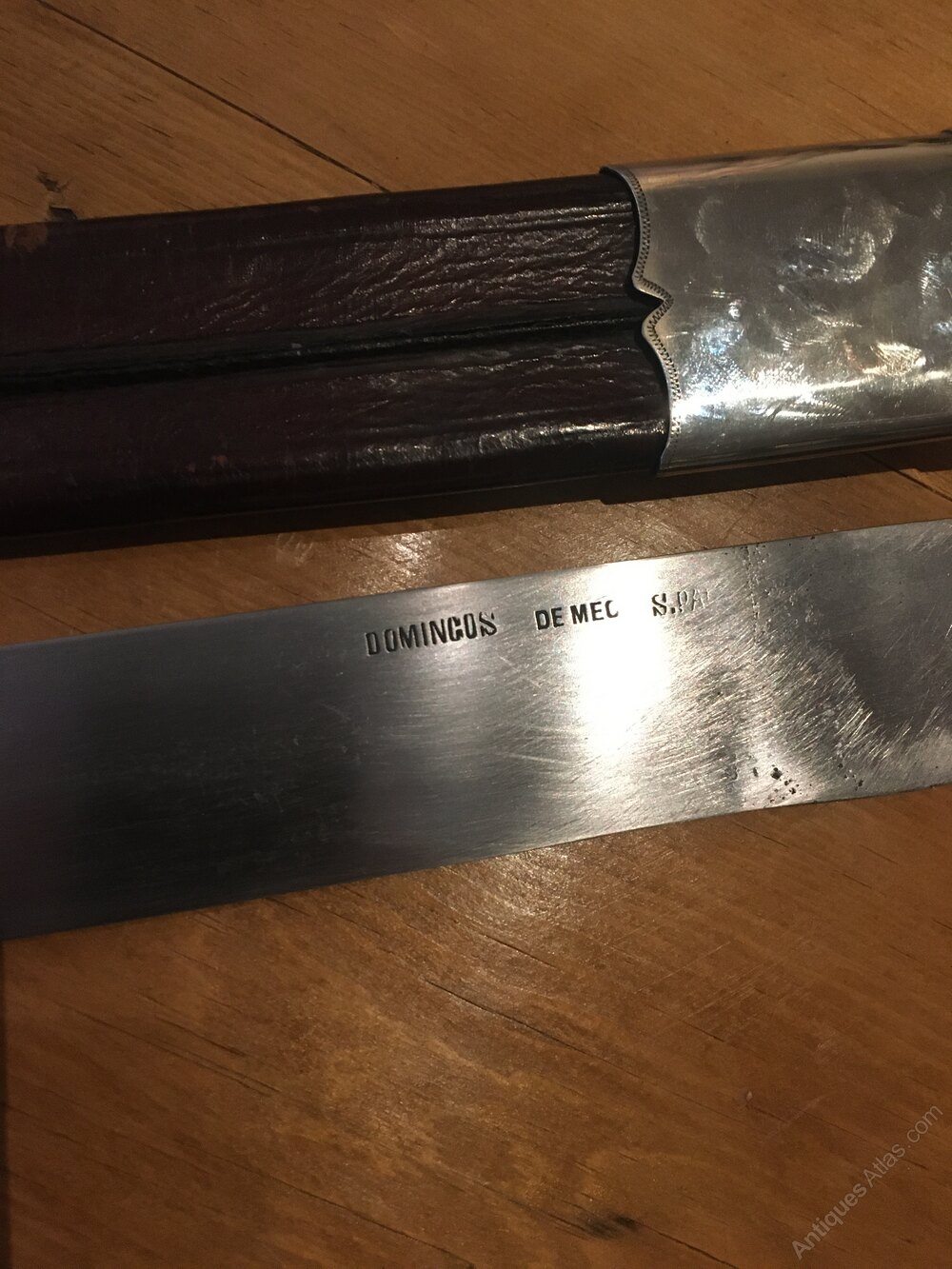 A very large vintage Spanish caucho knife it probably dates from the 1930-50 “based upon others I have seen “. A really good well made weapon [facones] bone handle leather and white metal scabbard a good heavy fighting knife. The blade marked Domingo’s de mec s.pat.Shipping information