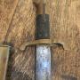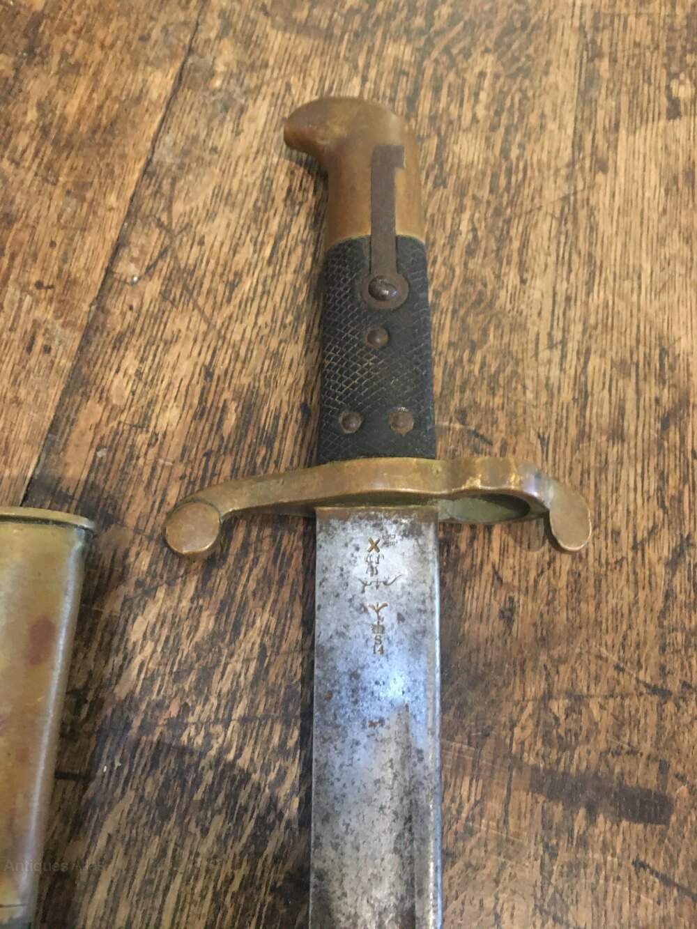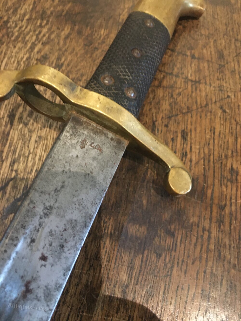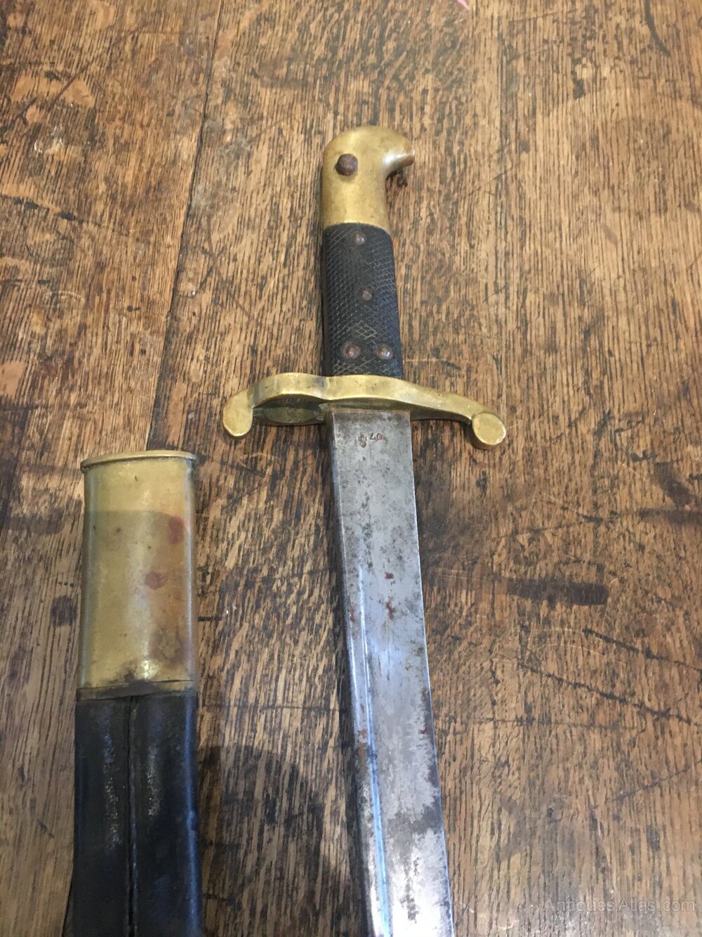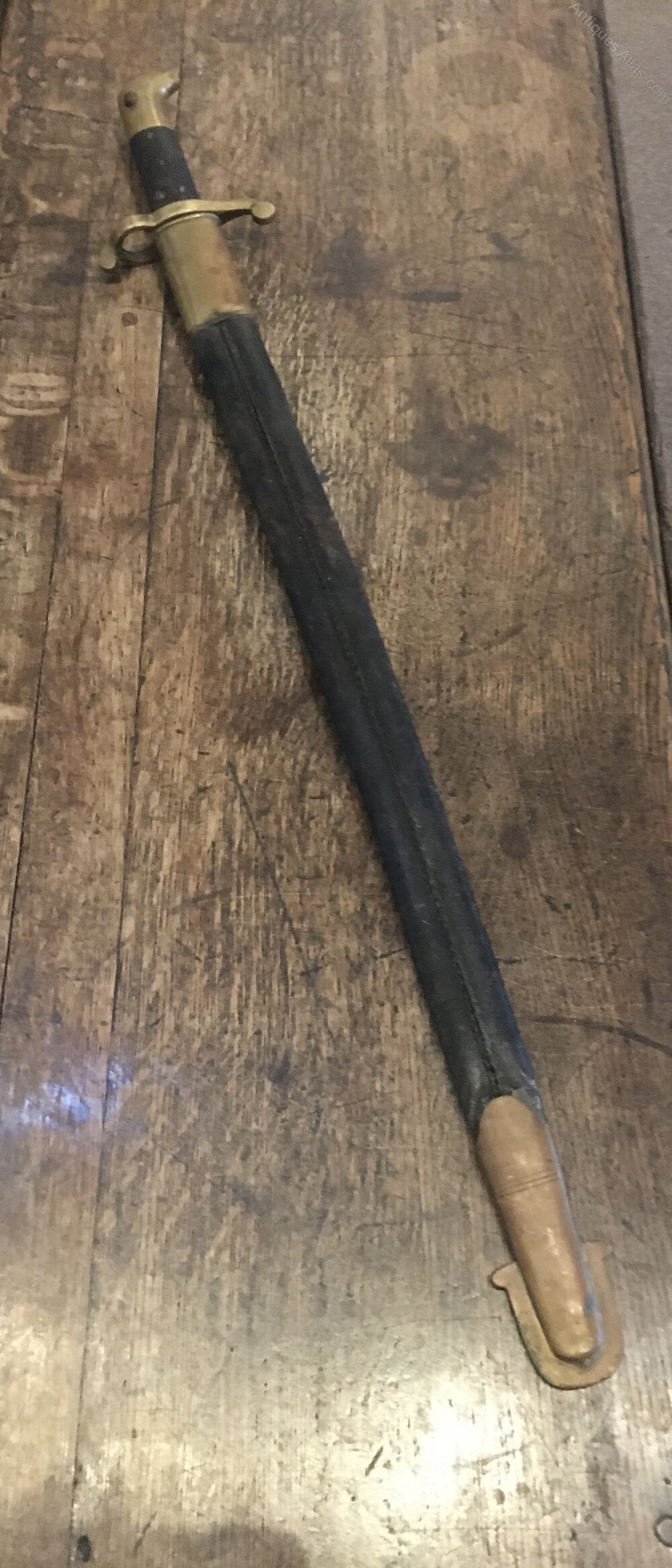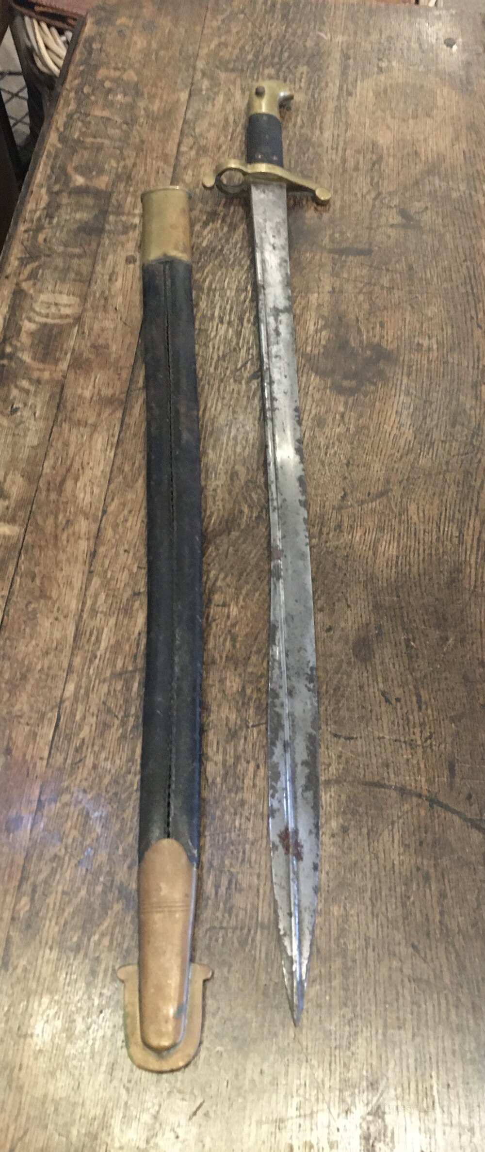 A scarce Lancaster sword bayonet model 1855 with scabbard. Brass hilt and cross guard long pipe back blade . Blade good not bent no nicks out of it pressed leather grip “not worn smooth “ blade well marked both sides and along the top of the blade . Scabbard a/f stitching coming apart in places chap loose but still solid not floppy press stud works . Totally unrestored just as it came to us a rare bayonet will come up really well.Shipping information