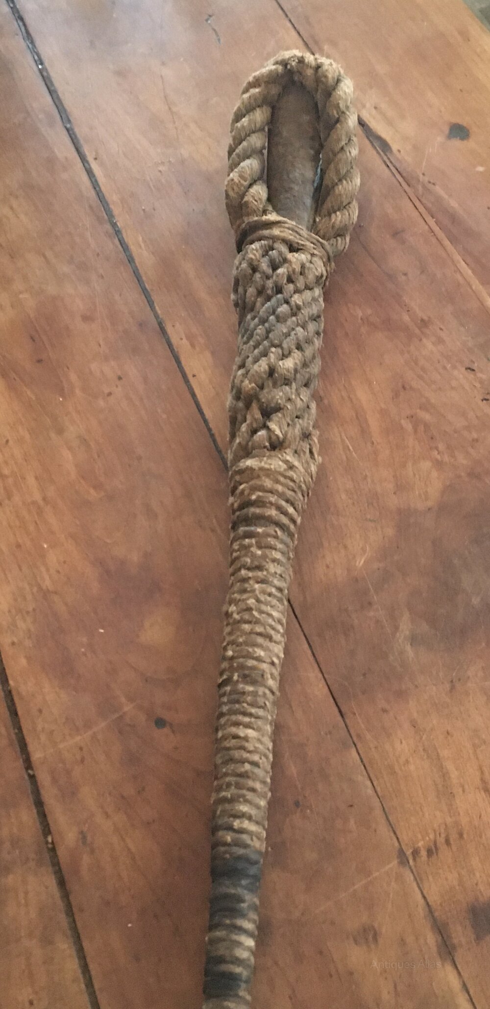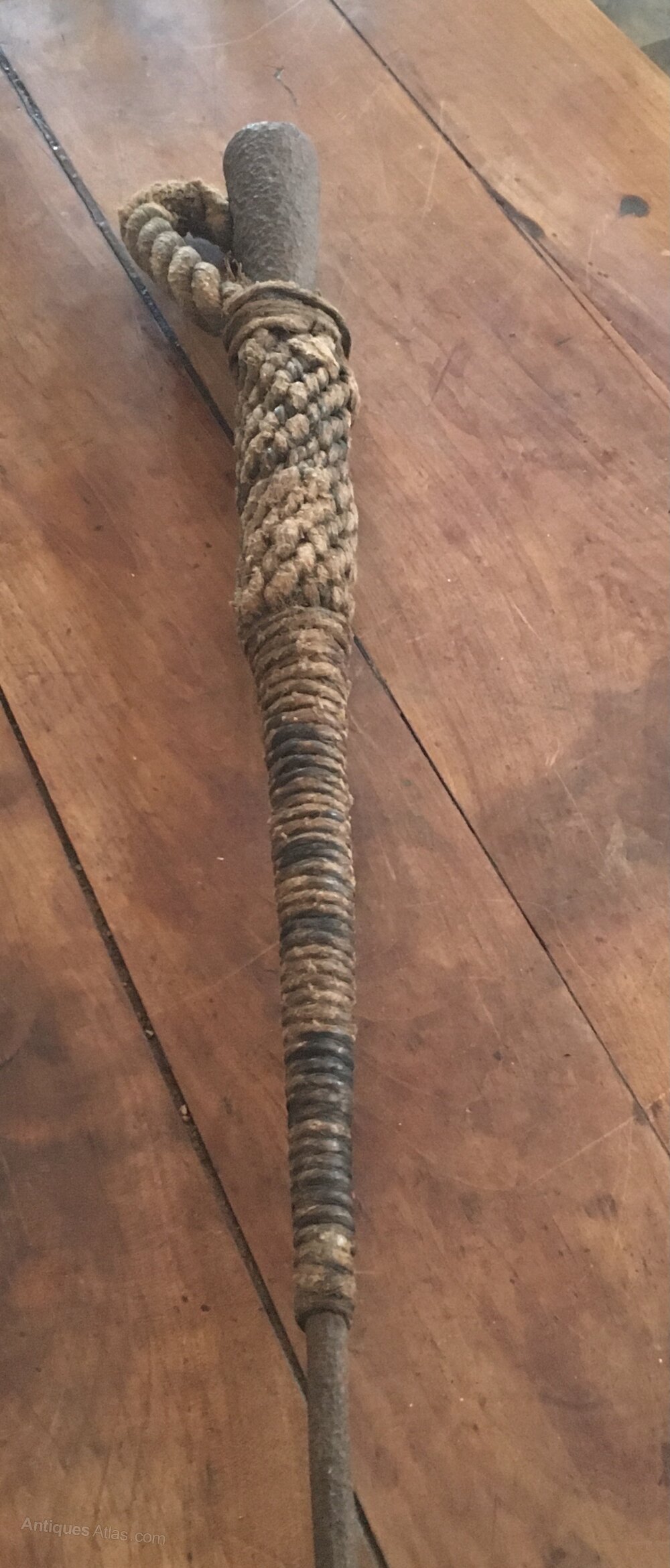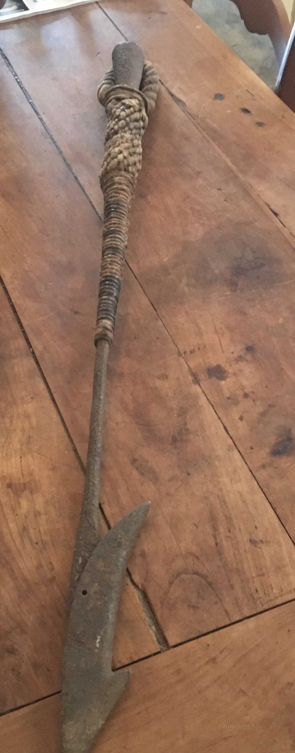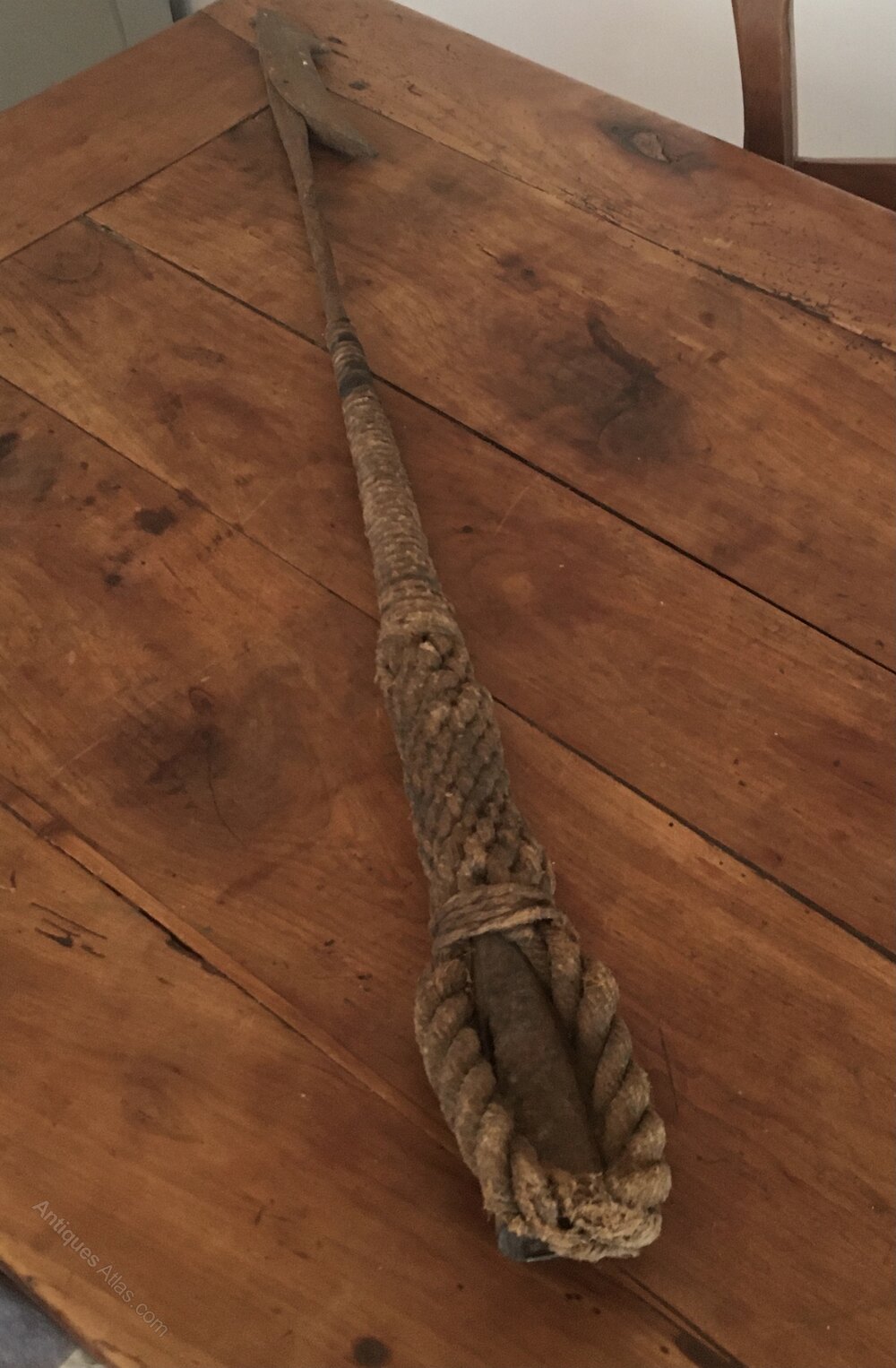 A earl American toggle head harpoon designed by Lewis temple in 1848 a freed black slave who opened his own blacksmith shop in New Bedford USA. This one is similar to the other listed but it has a large amount of sailor rope work around the shaft “original “Shipping information