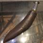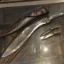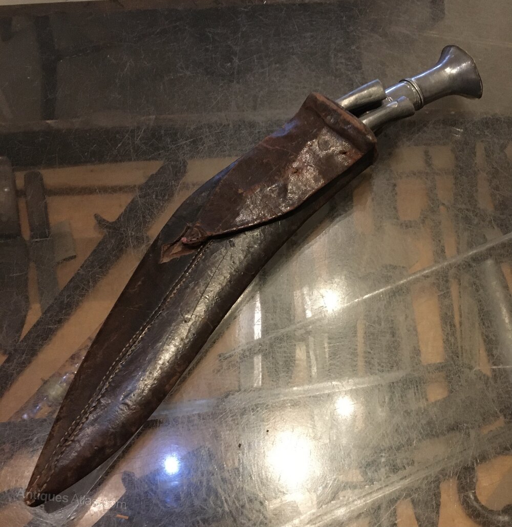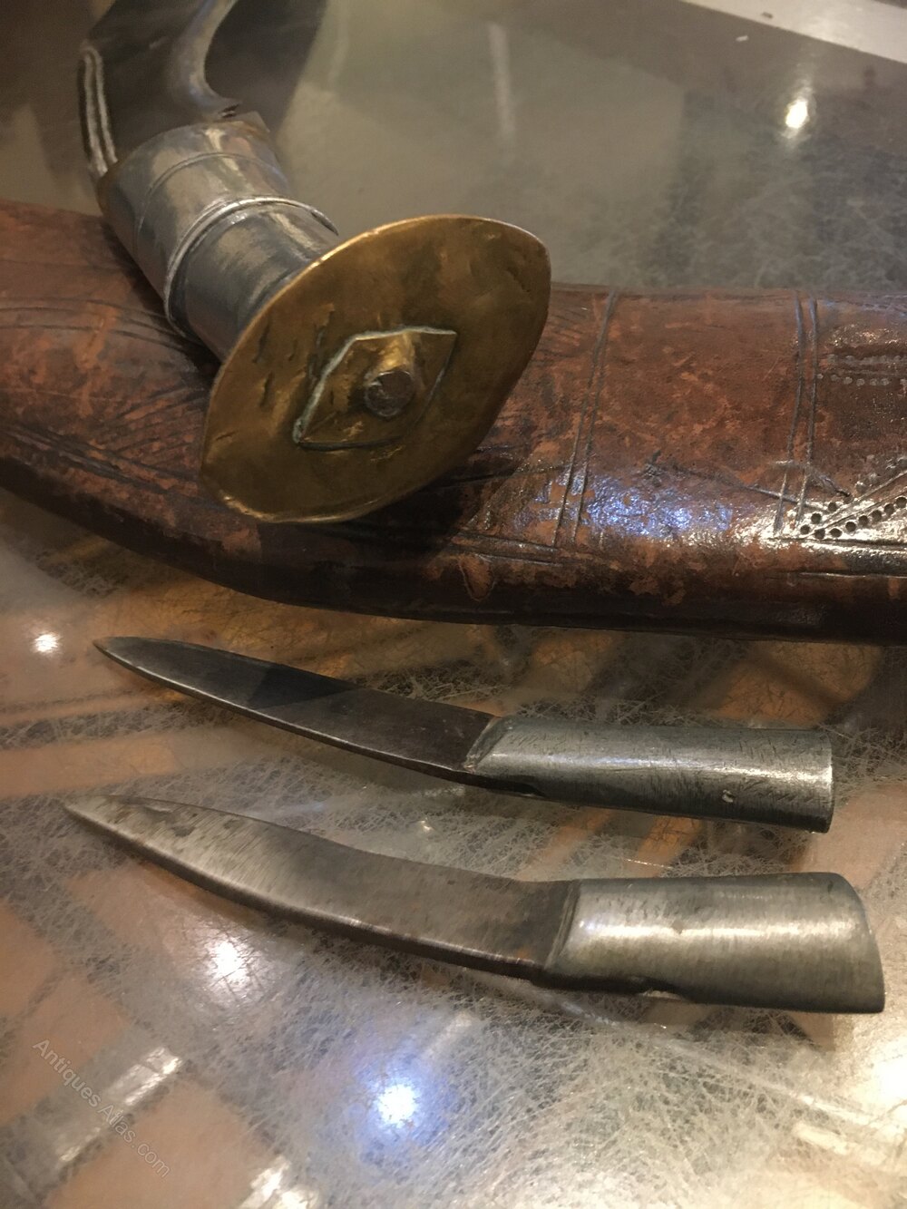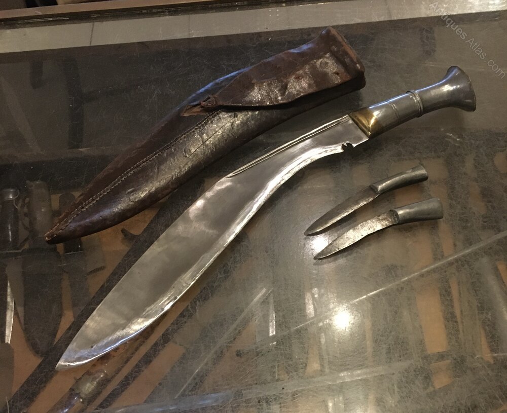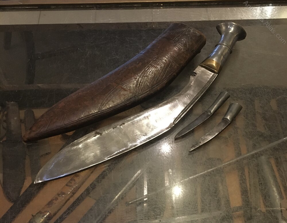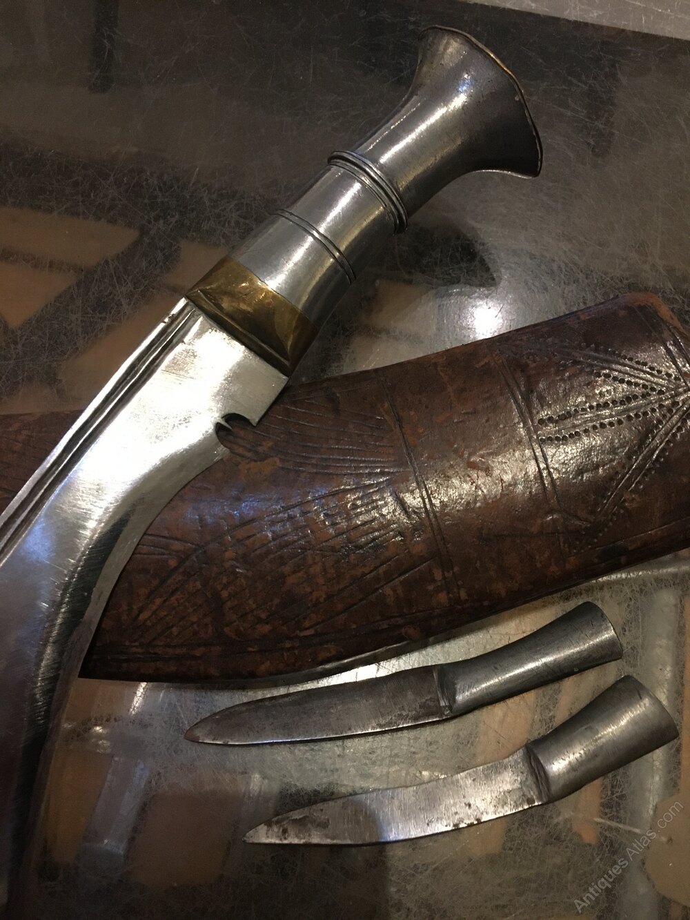 A good early steel handle kukri. These are usually military the handle steel and brass with a good heavy blade the scabbard wood covered with worked leather no splits. It also has two small daggers also steel a nice clean weapon.Shipping information
