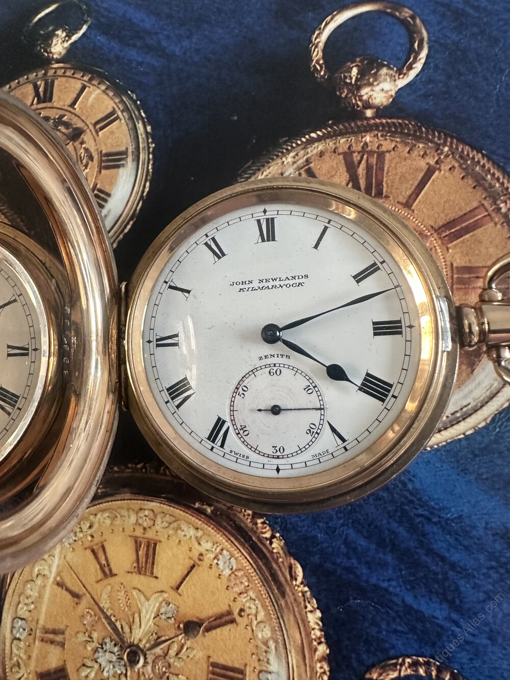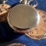 The polished high grade of case is in super condition , both hinges prefect , strong top bow and winding button , press top button to open the front of the watch , watch dial prefect condition no cracks or chips , black baton style numerals ,blue steel hands ,small sweep dial