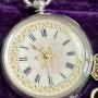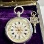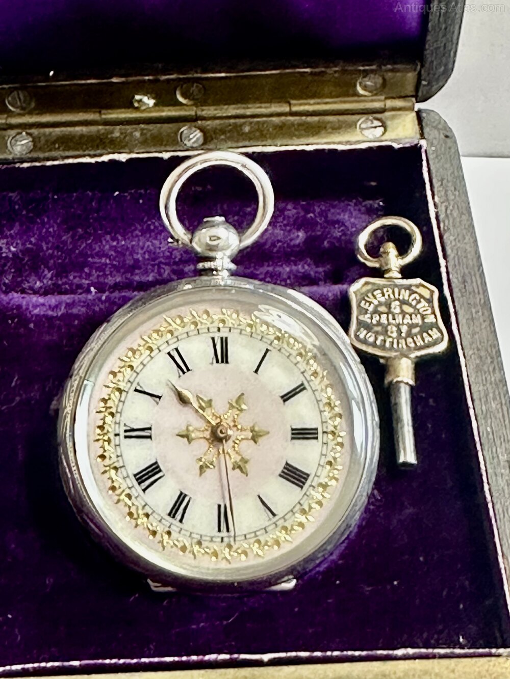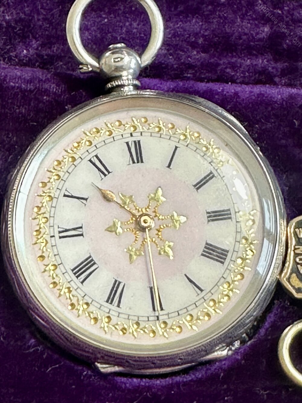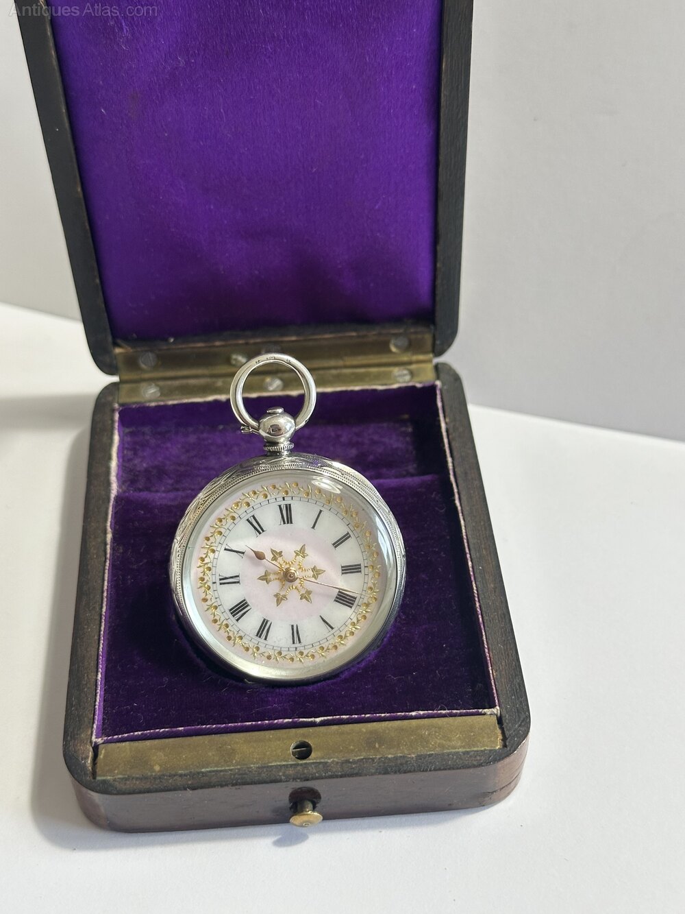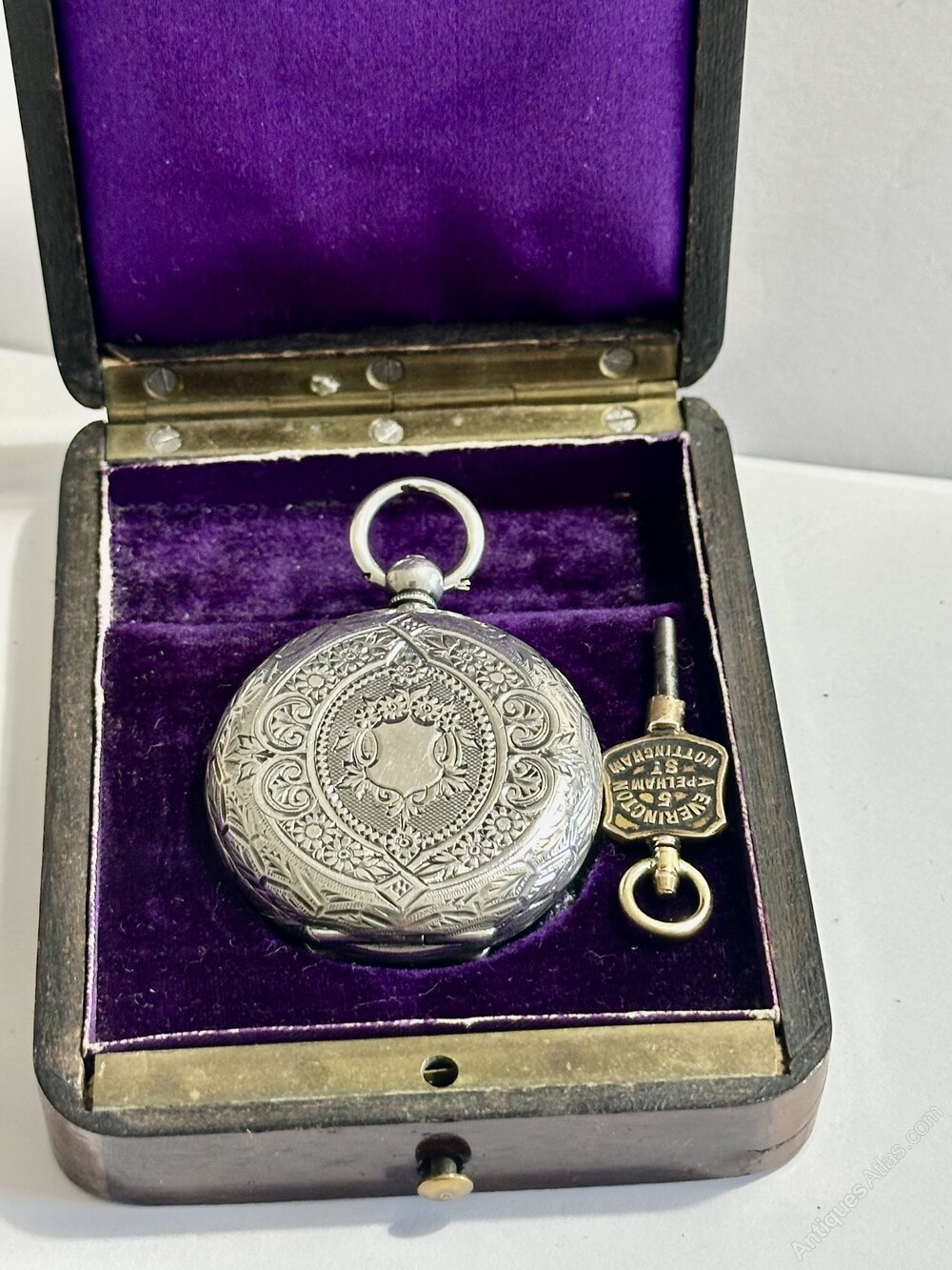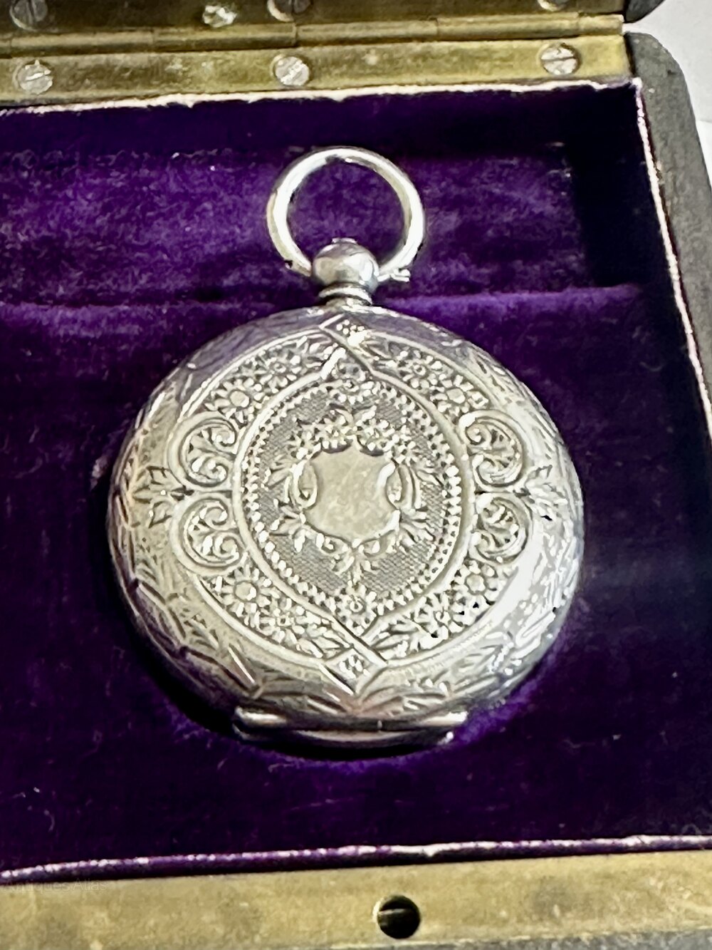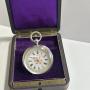 A Silver Swiss made fob watch c1890s in lovely condition fully workingComes in original inlayed Mahogany wooded box with watch key