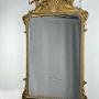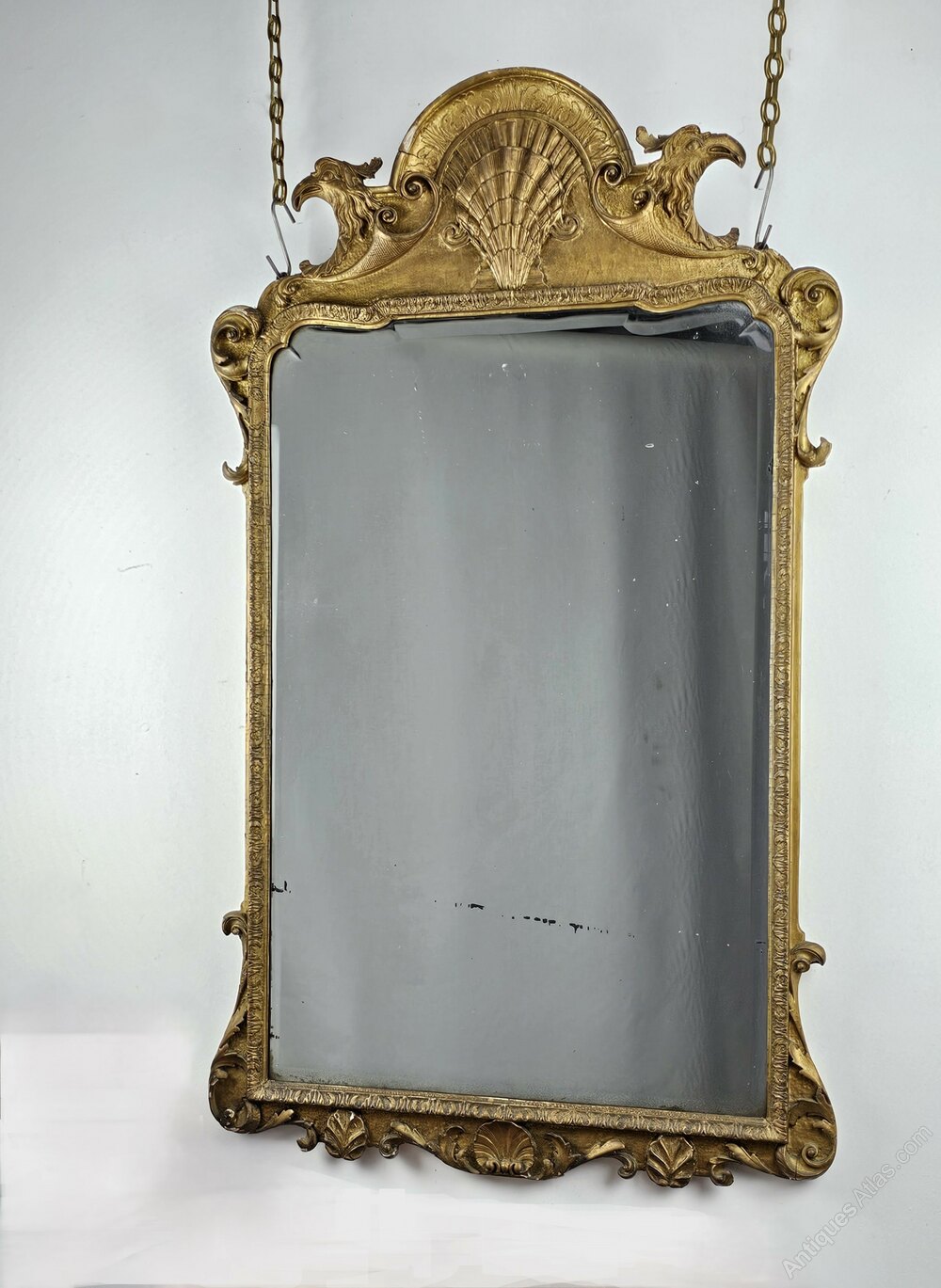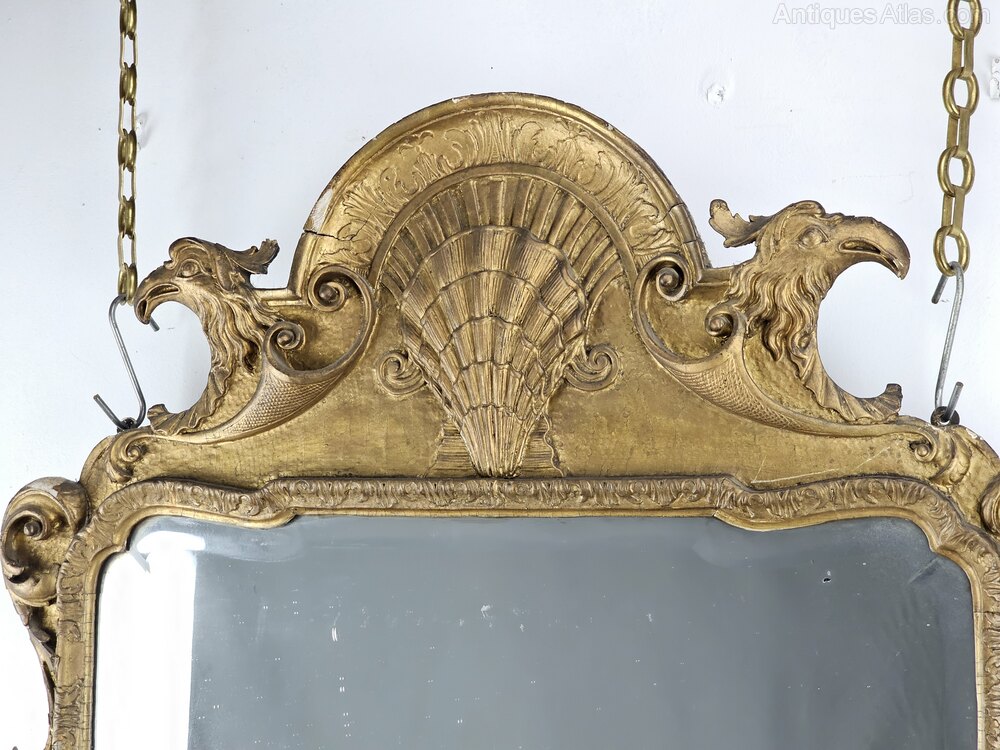 The shaped and softly bevelled looking-glass sits within an upright gilt gesso moulded frame, decorated with a finely carved shell, scrolling lobed acanthus corners and a shaped apron of scrolls centred by a naturalistic shell and eagle heads.